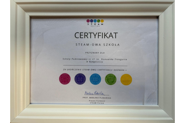 Z dumą przekazujemy wieści, że jesteśmy pierwszą i jedyną szkołą w Bydgoszczy, która otrzymała certyfikat STEAMOWY EDUKATOR w ramach europejskiego programu Odznaka+.