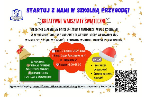 Serdecznie zapraszamy 6-latki z przedszkoli na osiedlu Szwederowo wraz z rodzicami na rodzinne, bezpłatne warsztaty świąteczne w naszej szkole!