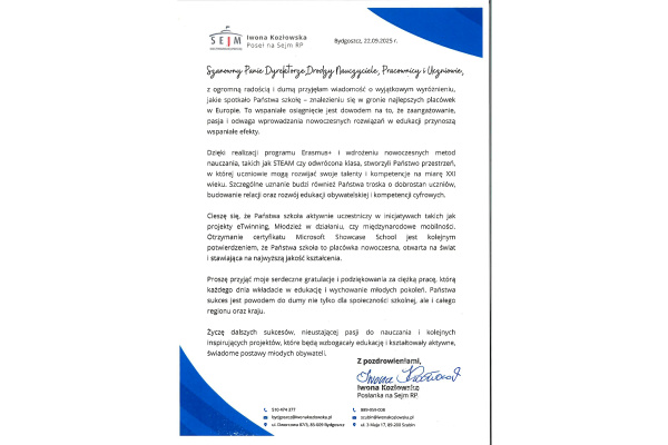Z dumą informujemy, że do naszej szkoły dotarło pismo od Pani Iwony Kozłowskiej - Posłanki na Sejm RP, dotyczące wyróżnienia naszej szkoły w konkursie europejskim.