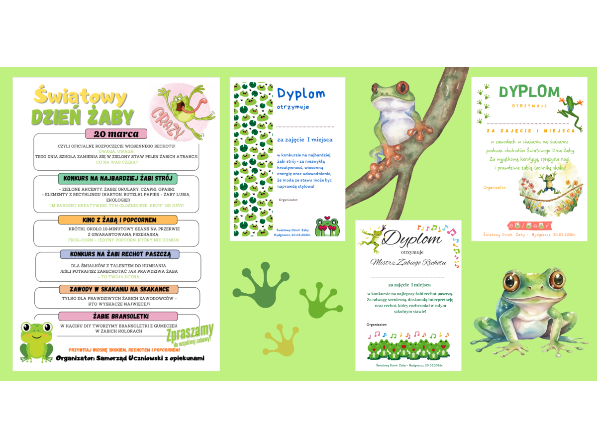 Obchody Dnia Żaby stały się w naszej szkole doskonałą okazją do wspólnej zabawy, integracji oraz radosnego powitania wiosny. Nie zabrakło uśmiechów, kreatywności i pozytywnej energii, która udzieliła się całej społeczności szkolnej. Ogromne podziękowania kierujemy do Samorządu Uczniowskiego za zaangażowanie i stworzenie wyjątkowej atmosfery wydarzenia. Na szczególne wyróżnienie zasługują uczennice klasy 6a: Alicja Balcerak, Estera Bieluszewska, Nicole Wasak, Oliwia Zacheja oraz Amelia Witkowska – inicjatorki "żabiego zamieszania". To właśnie dzięki ich pomysłowości i determinacji Dzień Żaby nabrał tak wyjątkowego charakteru. Dziewczyny nie tylko zaproponowały formę świętowania, ale również samodzielnie zaplanowały i przygotowały wszystkie atrakcje. Warto podkreślić, że nie jest to ich pierwsza inicjatywa – każde kolejne działanie realizują na coraz wyższym poziomie, co wyraźnie pokazuje, jak wiele korzyści przynosi praca projektowa w naszej szkole. Ich zaangażowanie, odpowiedzialność i umiejętność współpracy są godne podziwu. Gratulujemy sukcesu i mamy nadzieję, że zobaczymy coraz więcej takich przykładów uczniowskiej autonomii i sprawczości. Dziewczyny, jesteście prawdziwą inspiracją i wzorem do naśladowania!
