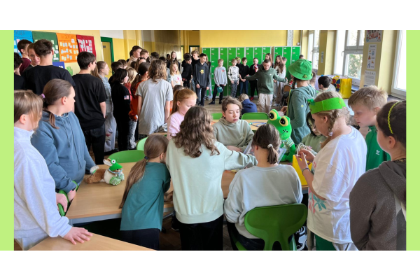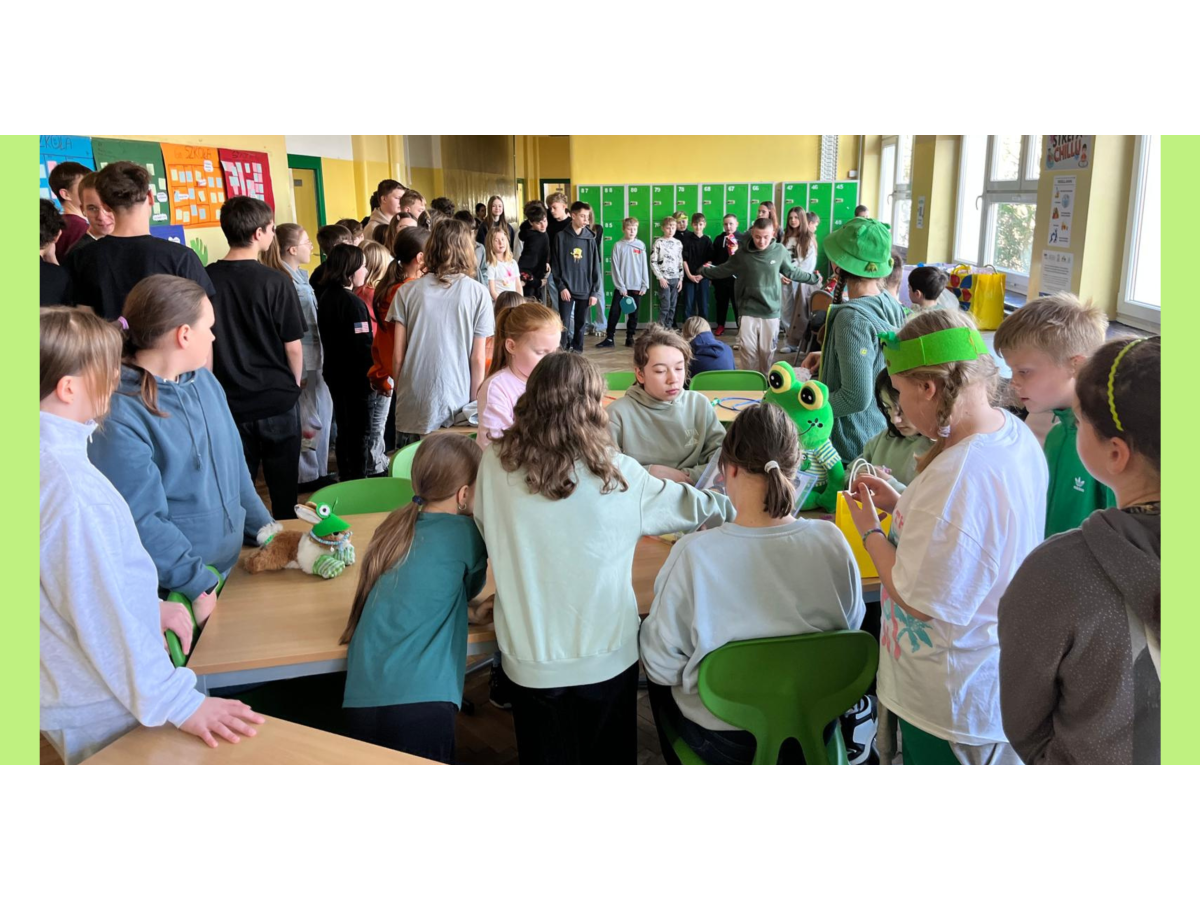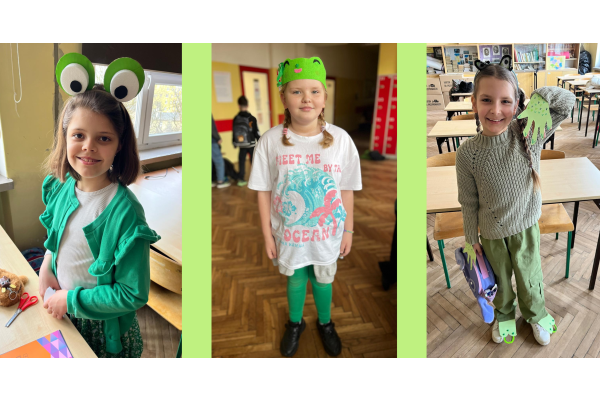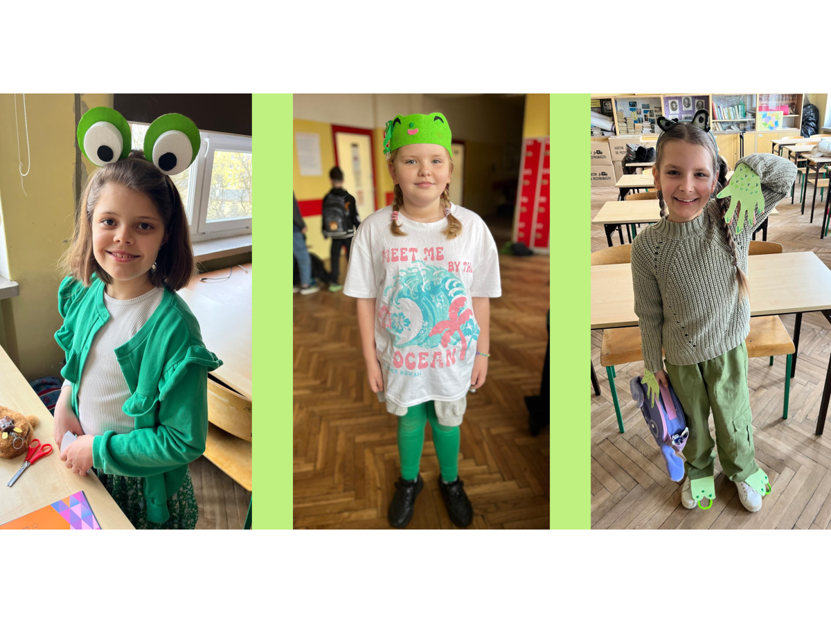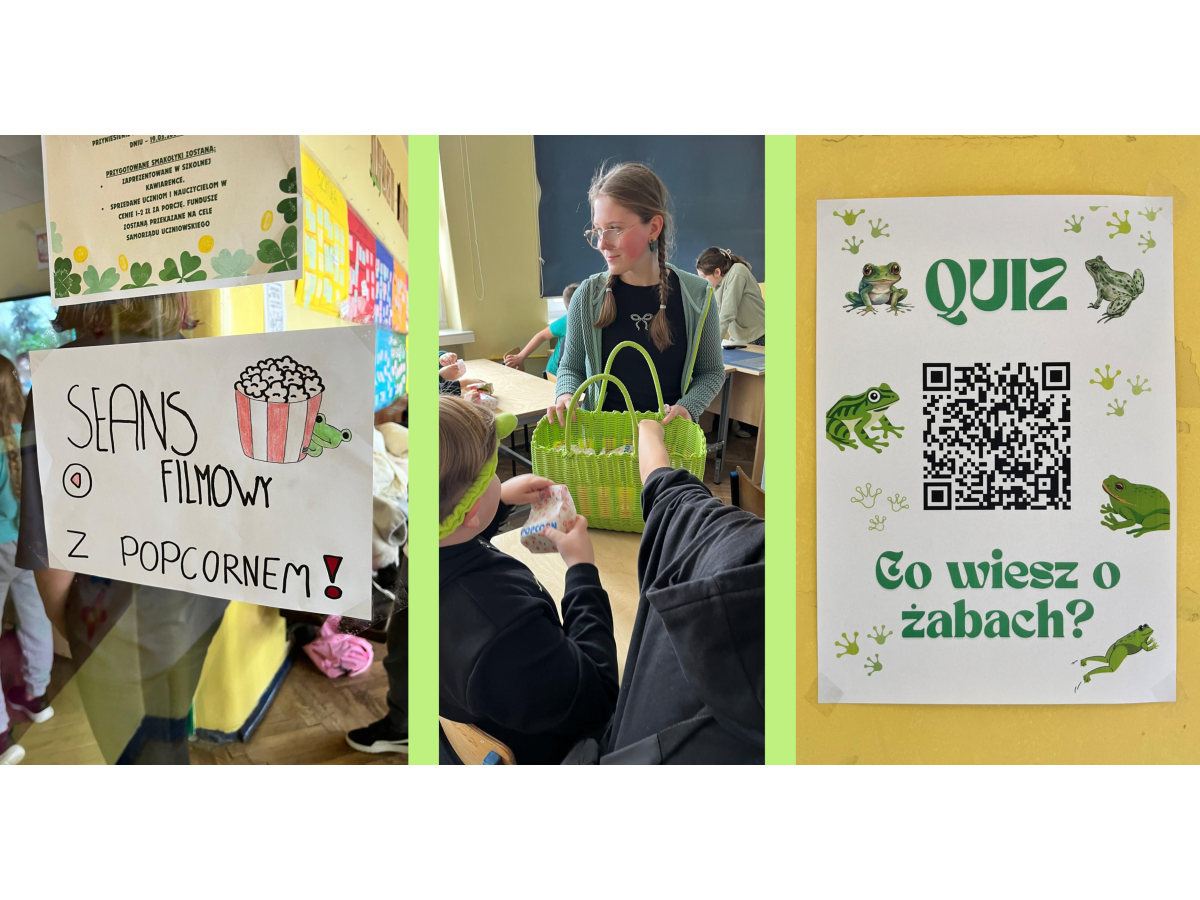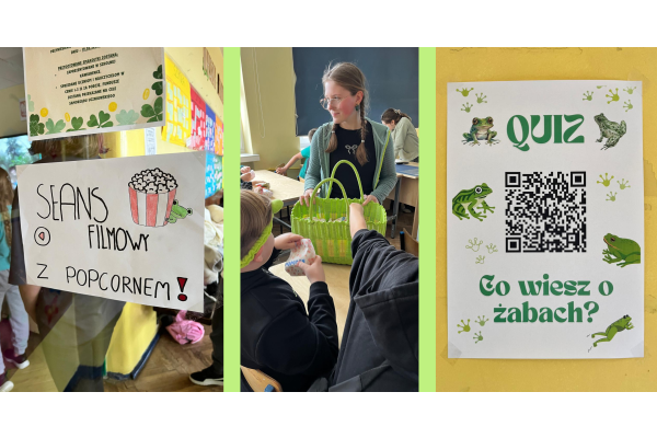 Podczas przerw w sali 203 odbywały się krótkie seanse filmowe o żabach z popcornem, a w specjalnym kąciku DIY tworzono kolorowe żabie bransoletki na wzór różnych gatunków żab. Na ścianach korytarzy wisiały kody QR, które przekierowywały chętnych do interaktywnych quizów wiedzy o żabach. Jednak głównym punktem programu były konkursy, między innymi na najbardziej żabi strój. Uczniowie wykazali się ogromną kreatywnością – pojawiły się zielone przebrania, opaski, okulary, a także pomysłowe elementy wykonane z materiałów recyklingowych. Dużym zainteresowaniem cieszył się również konkurs na żabi rechot, który dostarczył wszystkim wielu powodów do śmiechu. Nie zabrakło także aktywności ruchowych – podczas zawodów w skakaniu na skakance uczniowie mogli sprawdzić swoją „żabią” kondycję. Zwycięzcy otrzymali dyplomy i słodkie upominki. Za najbardziej pomysłowy żabi strój komisja wyróżniła: Antoninę Żurawską i Rozalię Lassottę z klasy 3a oraz Zuzannę Ptaszyńską z klasy 5a. W skoku na skakance wygrali: Kinga Szymkuć z klasy 6b i Natalia Nurkowska z klasy 6b oraz Maksymilian Stecki z klasy 3a. Natomiast największe owacje za żabi rechot otrzymali: John Macaulay Walczyna z klasy 8a, Natalia Nurkowska z klasy 6b i Anneliese Osiecka z klasy 1a. Gratulujemy!