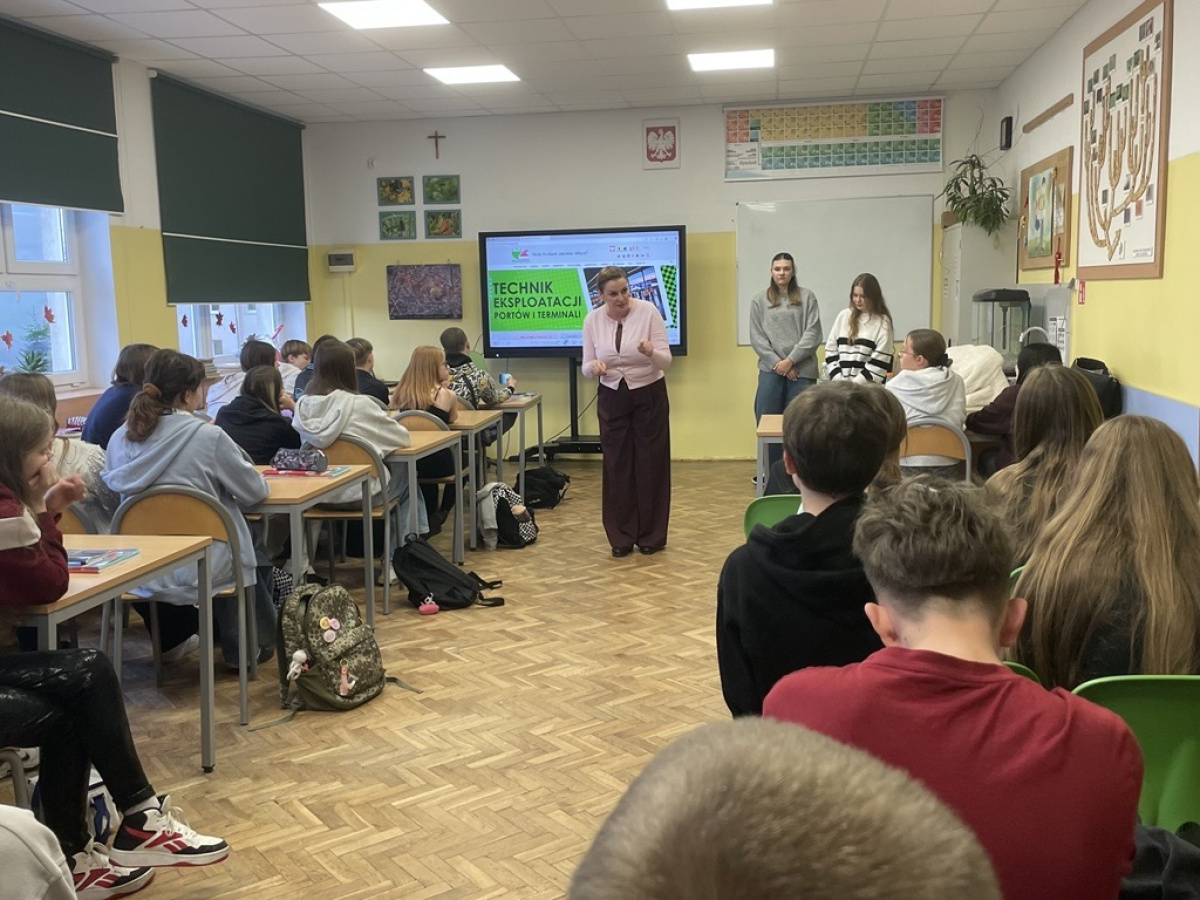 W miniony poniedziałek w naszych działaniach wsparli nas goście z Zespołu Szkół Handlowych. Pani Magdalena Kośmider i jej uczennice przedstawiły ofertę edukacyjną placówki. Dzięki temu uczniowie klas ósmych dowiedzieli się, w jakich zawodach można kształcić się w ZSH, a wachlarz możliwości okazał się naprawdę interesujący. Ponadto nasi uczniowie uzyskali szereg wskazówek niezbędnych do właściwego wyboru szkoły.