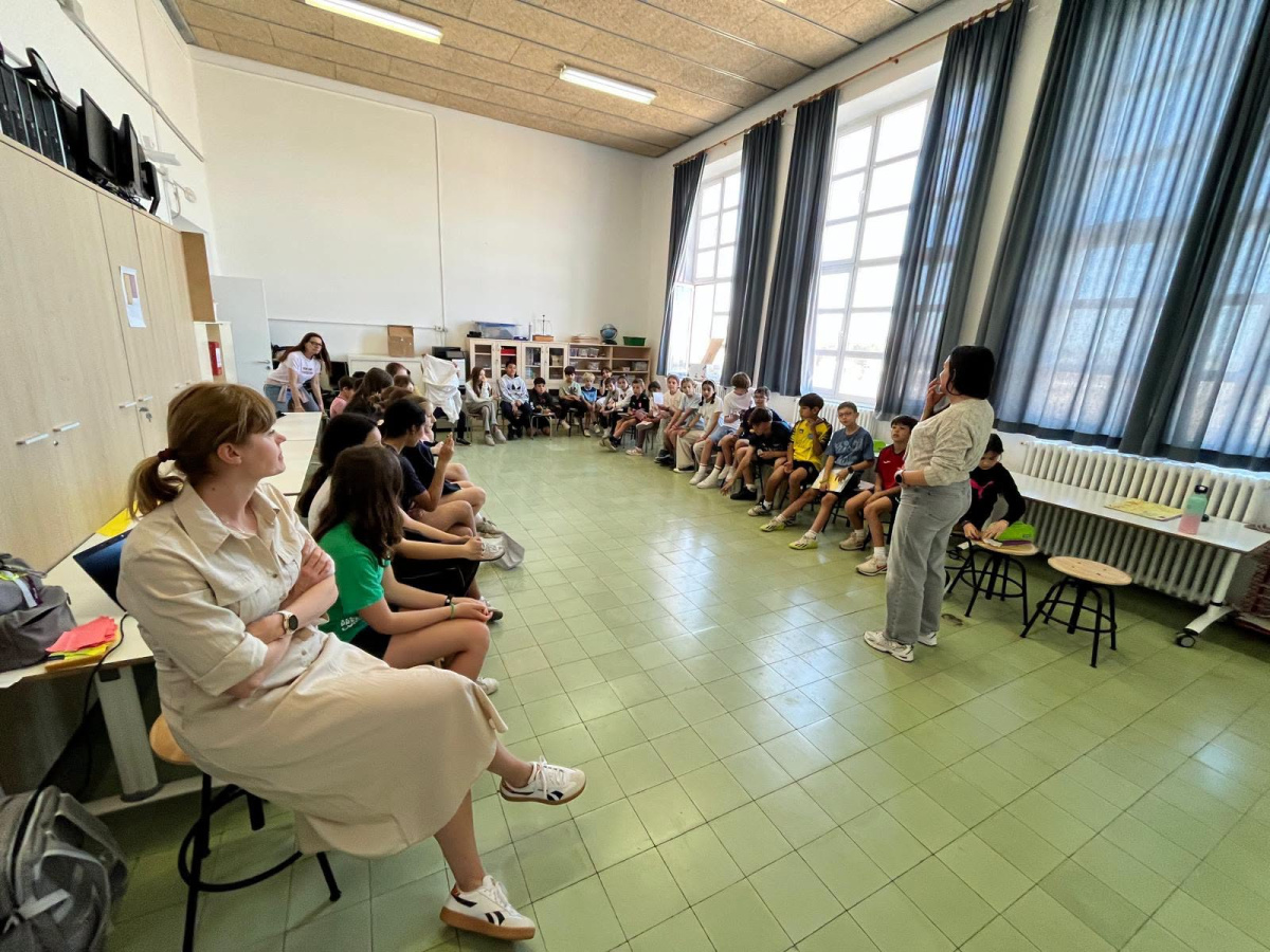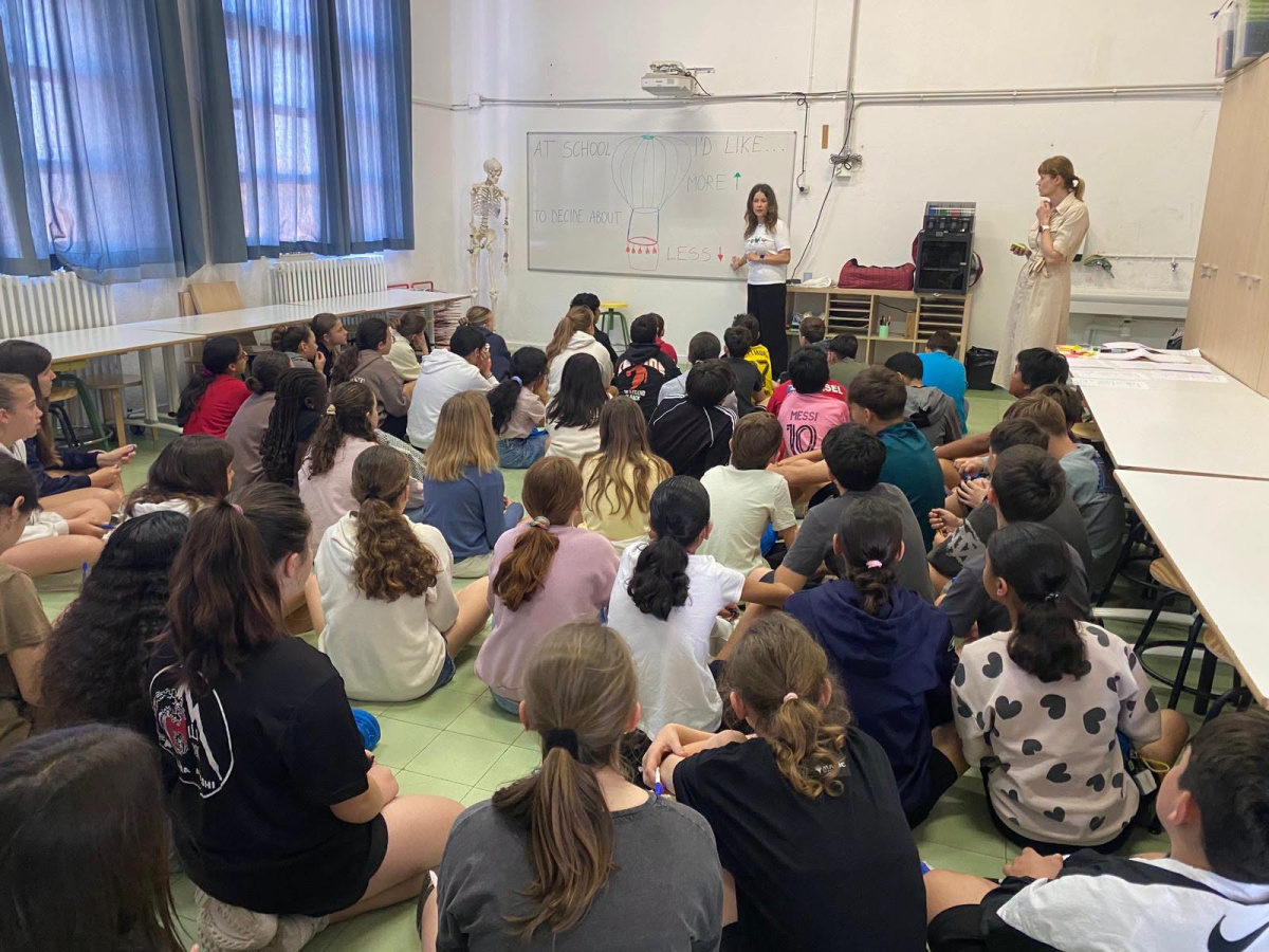 Po omówieniu odpowiedzi przeszliśmy do kolejnego etapu – wyobrażenia sobie szkoły przyszłości. Uczniowie usłyszeli, że zostali zaproszeni przez Komisję Europejską do współtworzenia wizji europejskiej szkoły przyszłości. Jak powinna wyglądać? Jakie zasady powinny w niej obowiązywać? Uczniowie zostali podzieleni na sześć międzynarodowych grup, w których znalazły się również nasze uczennice. Każda grupa pracowała nad innym obszarem: technologia, lekcje i nauczanie, przestrzeń w klasie, czas wolny w szkole, relacje i decyzyjność uczniów. Praca przeniosła się do mniejszych sal, gdzie zespoły dzieliły się rolami, rozwijały swoje pomysły i przygotowywały koncepcje. Pani Ada i pani Asia wspierały pracę grupową pomagając im uporządkować działania i doprecyzować cele.