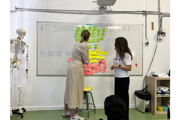 W czasie kiedy dzieci odpoczywały, pani Asia z panią Adą zebrały najważniejsze wnioski z pracy uczniów i na ich podstawie stworzyły „kontrakt hiszpańsko-polski” – 10 kluczowych postulatów. Po przerwie wszyscy spotkaliśmy się ponownie – tym razem na świeżym powietrzu, przed szkolną sceną. Każda grupa zaprezentowała swoją wizję, a różne obszary zostały symbolicznie połączone w jeden wspólny projekt – budynek szkoły przyszłości, który zawisł na ścianie jako efekt wspólnej pracy. Na zakończenie przedstawiciele klas podpisali przygotowany kontrakt. Być może to tylko symbol, ale każdy duży pomysł zaczyna się właśnie od takich momentów.