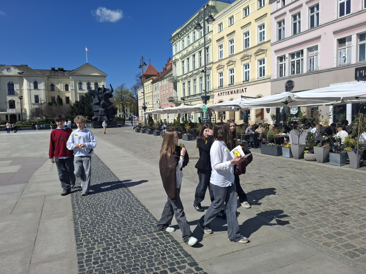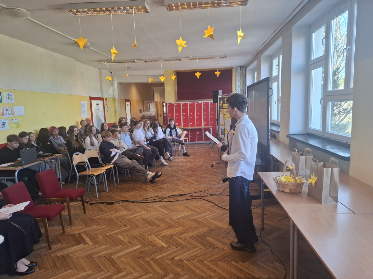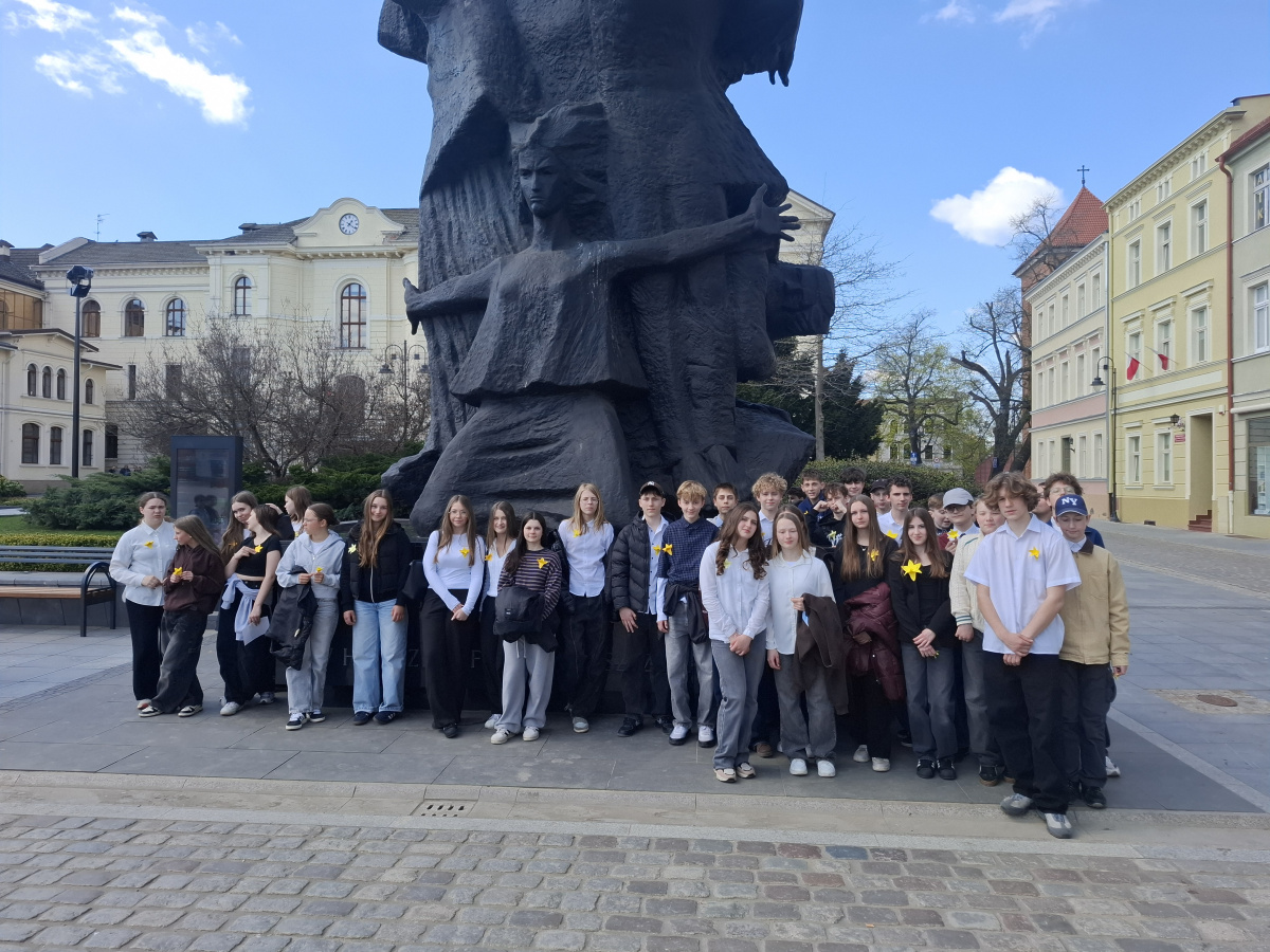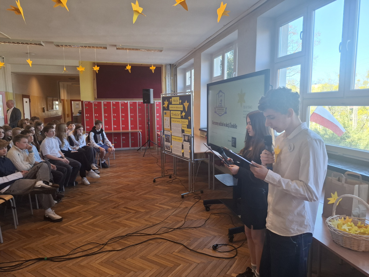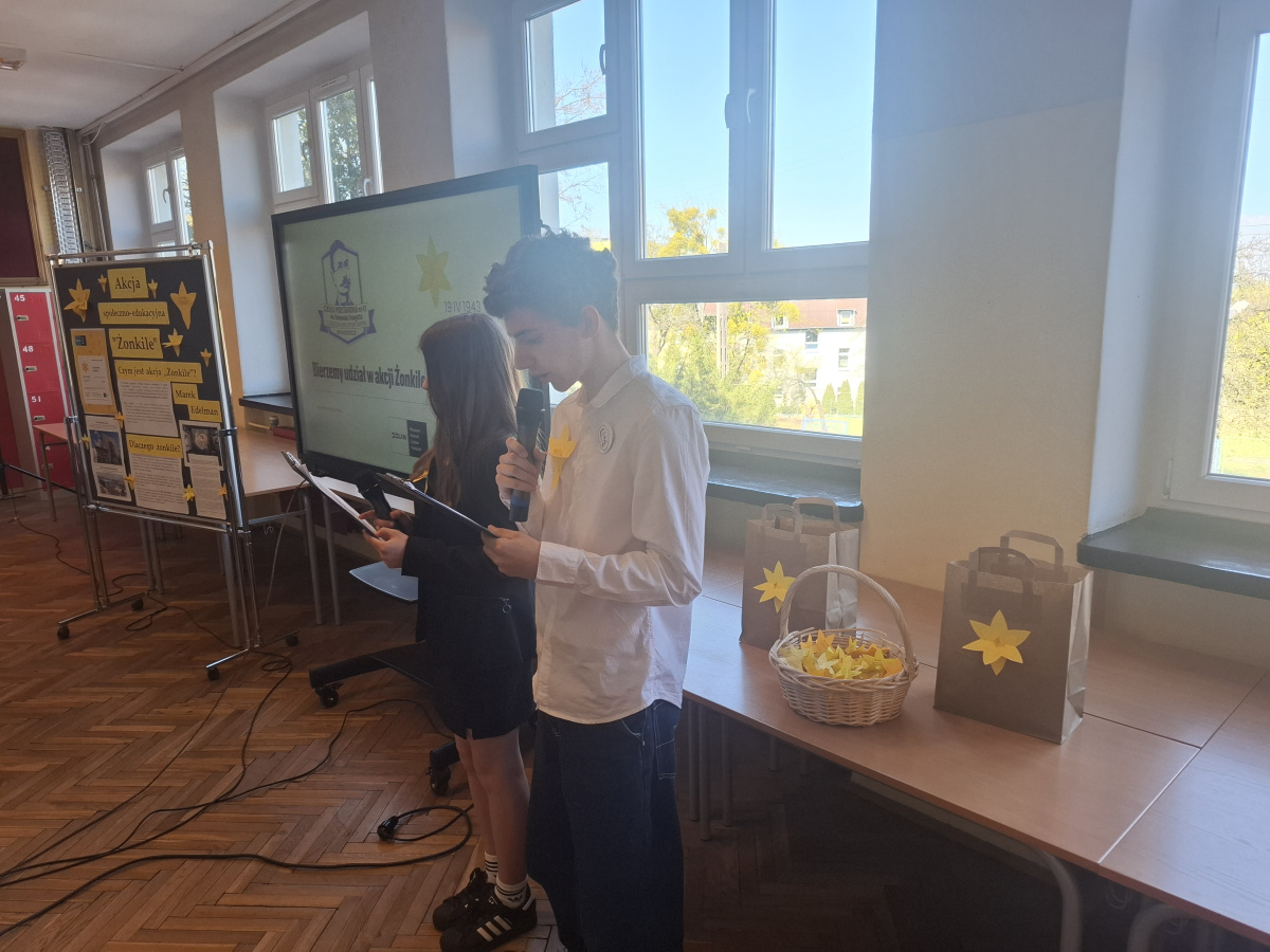 Tematyczne spotkanie odbyło się w piątek, 17 kwietnia 2026 roku, a tuż po nim przedstawiciele najstarszych klas wyszli poza mury naszej szkoły, by rozdać napotkanym przechodniom własnoręcznie wykonane papierowe żonkile – symbol upamiętniający bohaterów tamtych wydarzeń. Rozdawane przez wolontariuszy w ramach akcji papierowe żonkile są nie tylko symbolem pamięci o ofiarach Zagłady, ale także znakiem odwagi i godności, sprzeciwu wobec obojętności oraz solidarności z prześladowanymi.