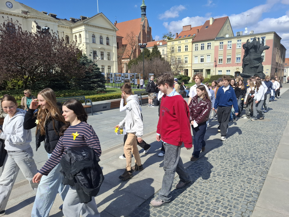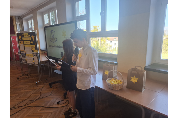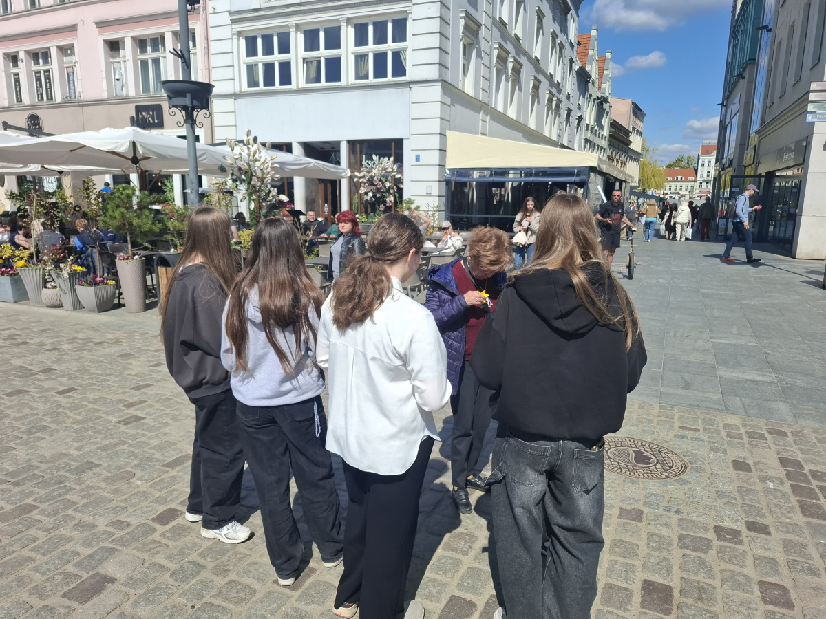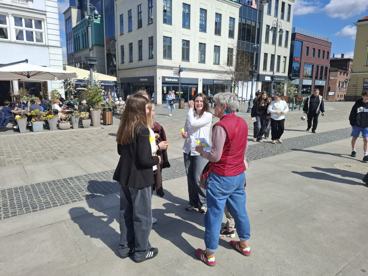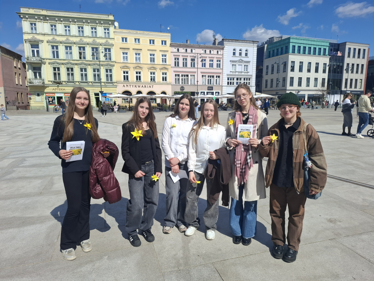 Tematyczne spotkanie odbyło się w piątek, 17 kwietnia 2026 roku, a tuż po nim przedstawiciele najstarszych klas wyszli poza mury naszej szkoły, by rozdać napotkanym przechodniom własnoręcznie wykonane papierowe żonkile – symbol upamiętniający bohaterów tamtych wydarzeń. Rozdawane przez wolontariuszy w ramach akcji papierowe żonkile są nie tylko symbolem pamięci o ofiarach Zagłady, ale także znakiem odwagi i godności, sprzeciwu wobec obojętności oraz solidarności z prześladowanymi.