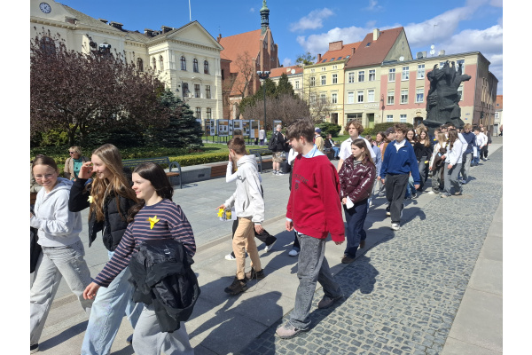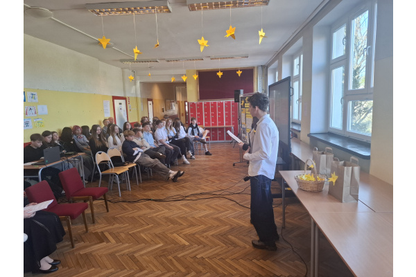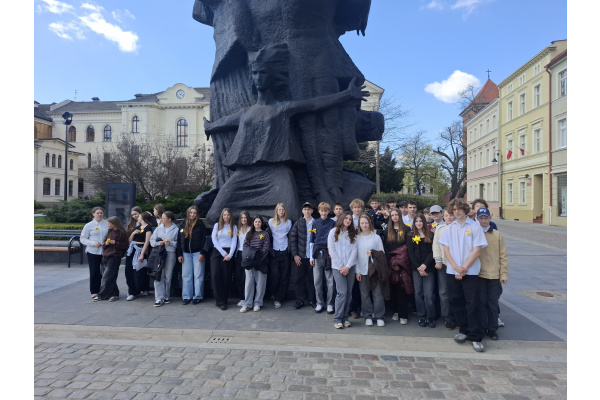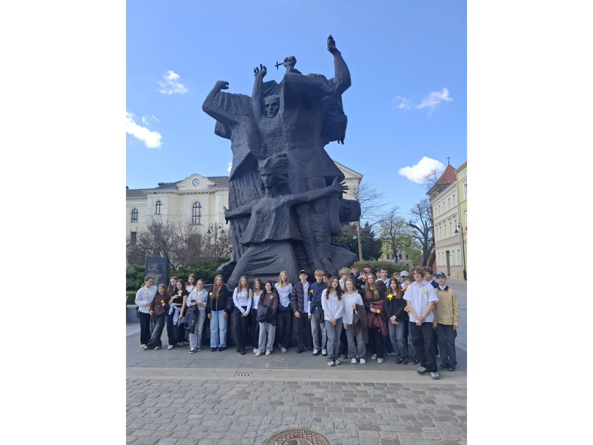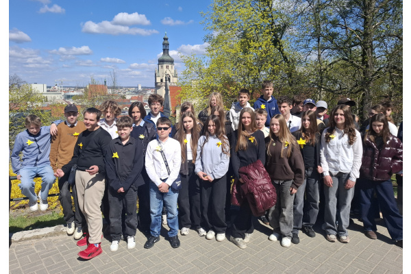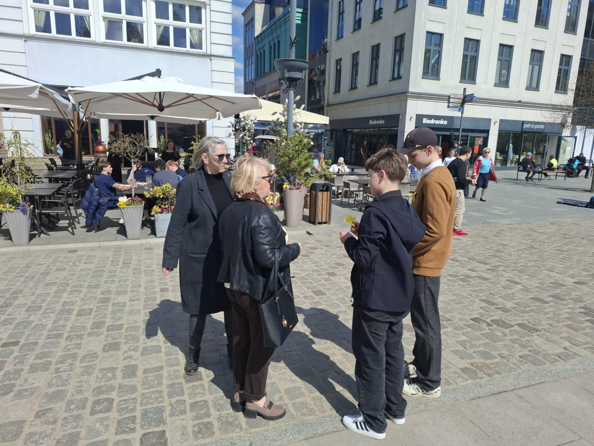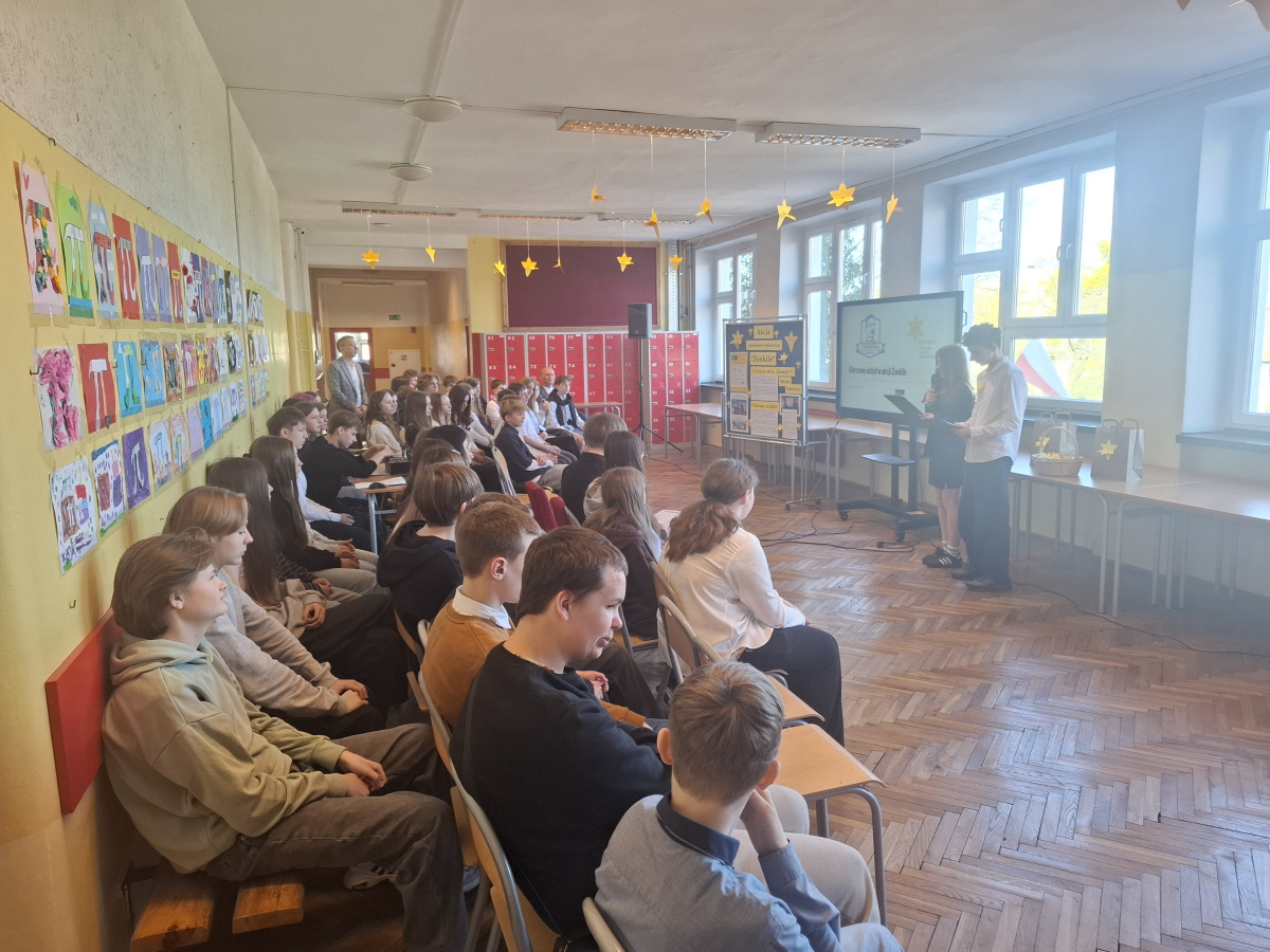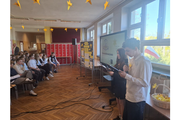 Tematyczne spotkanie odbyło się w piątek, 17 kwietnia 2026 roku, a tuż po nim przedstawiciele najstarszych klas wyszli poza mury naszej szkoły, by rozdać napotkanym przechodniom własnoręcznie wykonane papierowe żonkile – symbol upamiętniający bohaterów tamtych wydarzeń. Rozdawane przez wolontariuszy w ramach akcji papierowe żonkile są nie tylko symbolem pamięci o ofiarach Zagłady, ale także znakiem odwagi i godności, sprzeciwu wobec obojętności oraz solidarności z prześladowanymi.