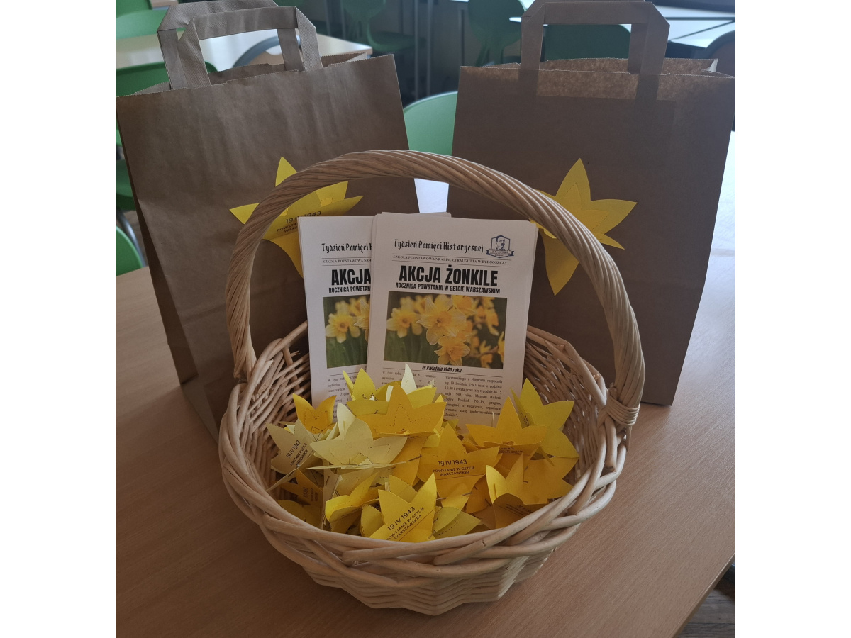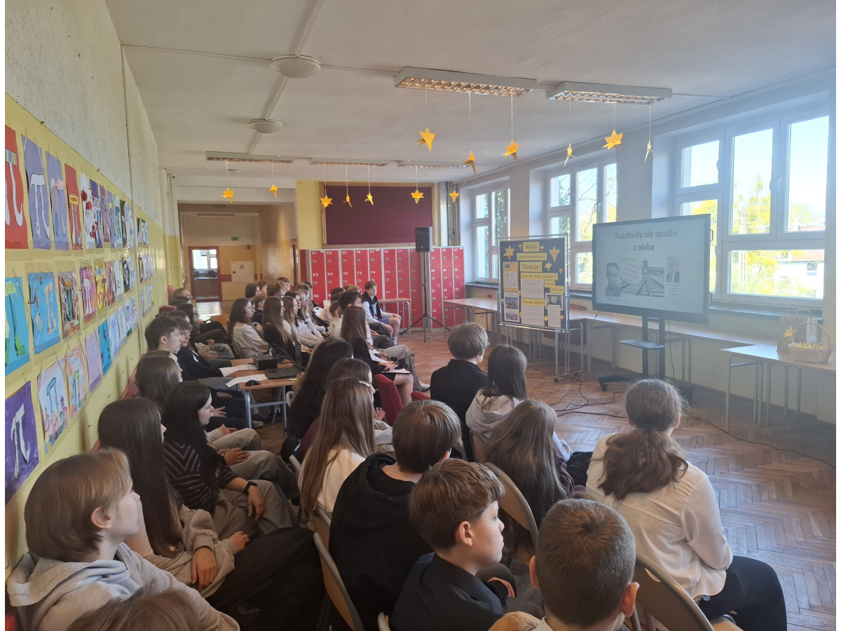W ramach akcji „Żonkile” uczniowie klas 7-8 brali udział w zajęciach tematycznych oraz warsztatach tworzenia papierowych żonkili. Wzięli również udział w apelu, podczas którego zapoznali się z historią powstania w getcie warszawskim. Posłuchali również pouczającego przemówienia Mariana Turskiego pt. „Auschwitz nie spadło z nieba”, które historyk wygłosił w czasie uroczystości 75. rocznicy wyzwolenia obozu koncentracyjnego w Auschwitz. Można go obejrzeć również tutaj: