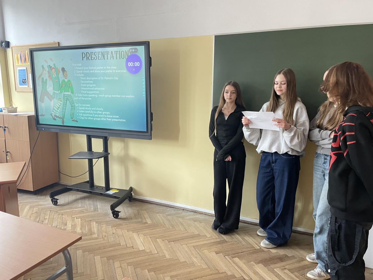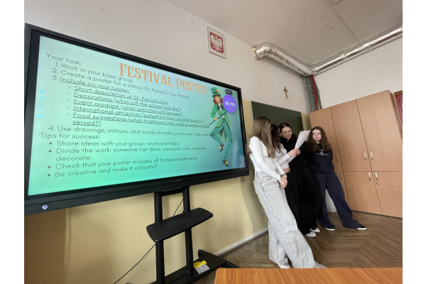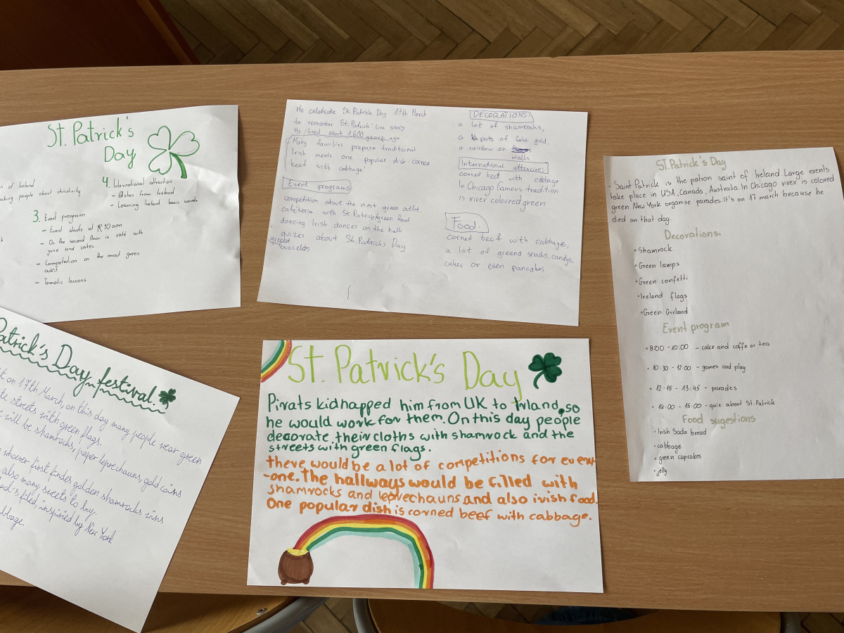 W obu klasach dodatkowym elementem była praca projektowa. Uczniowie, wykorzystując zdobytą wiedzę, tworzyli własne koncepcje szkolnego festiwalu z okazji Dnia Świętego Patryka. Powstały ciekawe i kreatywne pomysły obejmujące m.in. dekoracje, program wydarzeń, atrakcje oraz propozycje tematycznych aktywności dla społeczności szkolnej.