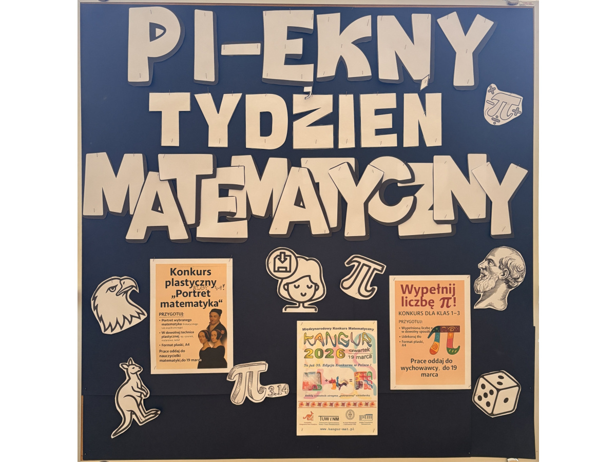 W dniach 13–20 marca 2026 r. w naszej szkole odbył się Pi‑ękny Tydzień Matematyczny – cykl wydarzeń, konkursów i aktywności, które pokazały, że matematyka może być jednocześnie fascynująca, twórcza i zabawna. Uczniowie i uczennice z klas 1–3 oraz 4–8 uczestniczyli w działaniach rozwijających umiejętności matematyczne, logiczne myślenie, spostrzegawczość, pamięć oraz kreatywność.
