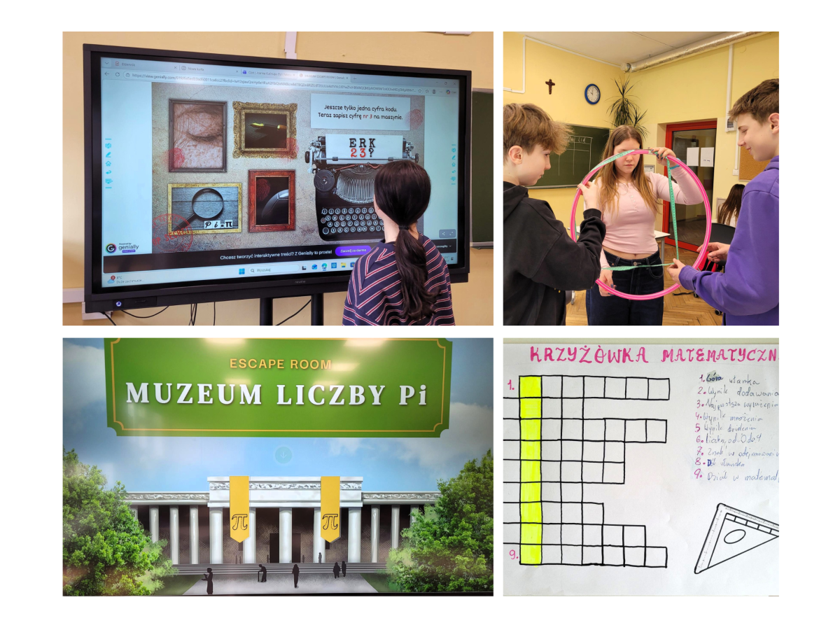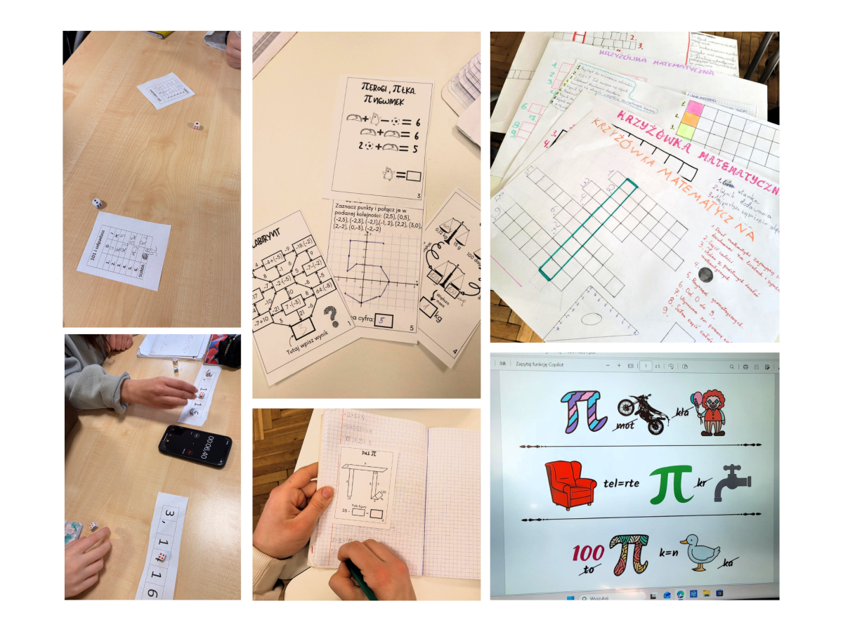 W czasie Tygodnia Matematycznego lekcje matematyki zamieniły się w przestrzeń pełną zagadek, łamigłówek i zadań badawczych. Klasy młodsze obejrzały film, który w prosty sposób wyjaśniał, co to jest liczba π. Uczniowie i uczennice klas starszych rozwijali słownictwo matematyczne, umiejętność formułowania precyzyjnych definicji i podpowiedzi układając krzyżówki, w których głównym hasłem była „LUDOLFINA”. Odbyły się zajęcia z Escapebookiem, w którym należało rozwiązywać zadania matematyczne krok po kroku, by odkryć kolejne wskazówki. Dużym zainteresowaniem cieszył się interaktywny Escaperoom „Muzeum liczby π”. Zabawa angażowała i łączyła elementy matematyki, dedukcji oraz zręczności. Na korytarzach oraz w salach pojawiły się ukryte fragmenty rozwinięcia liczby π. Uczniowie i uczennice odnajdowali je i układali w całość, a następnie uczyli się samodzielnego wyznaczania jej przybliżenie, mierząc obwody i średnice różnych przedmiotów. Odbywały się również gry matematyczno-dydaktyczne m.in.: rzuty kostką „pi‑race”, „kto pierwszy?” – wyścigi matematyczne, „statki z π” – gra logiczna z układem współrzędnych. Każda gra wspierała rozwój myślenia strategicznego, refleksu i spostrzegawczości. Dominowała praca w grupach, co rozwijało umiejętność współpracy i krytycznego myślenia.