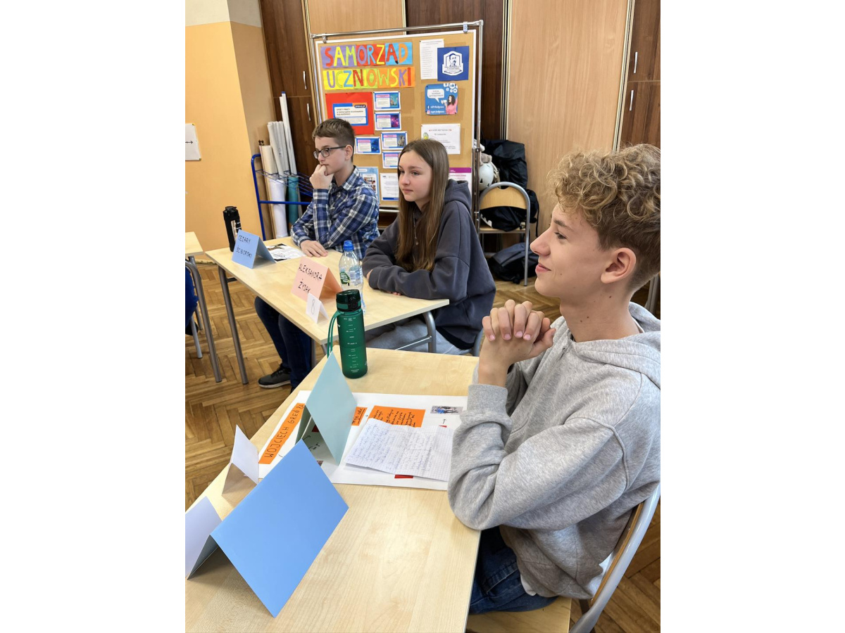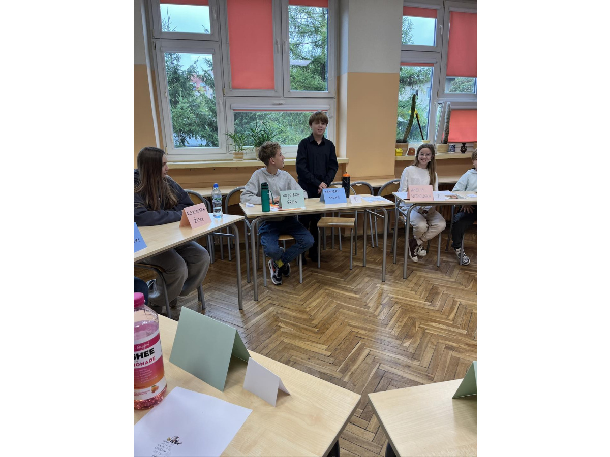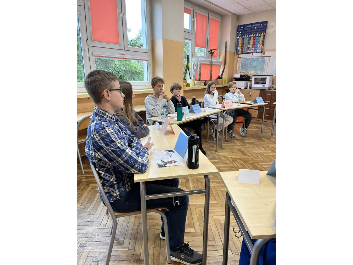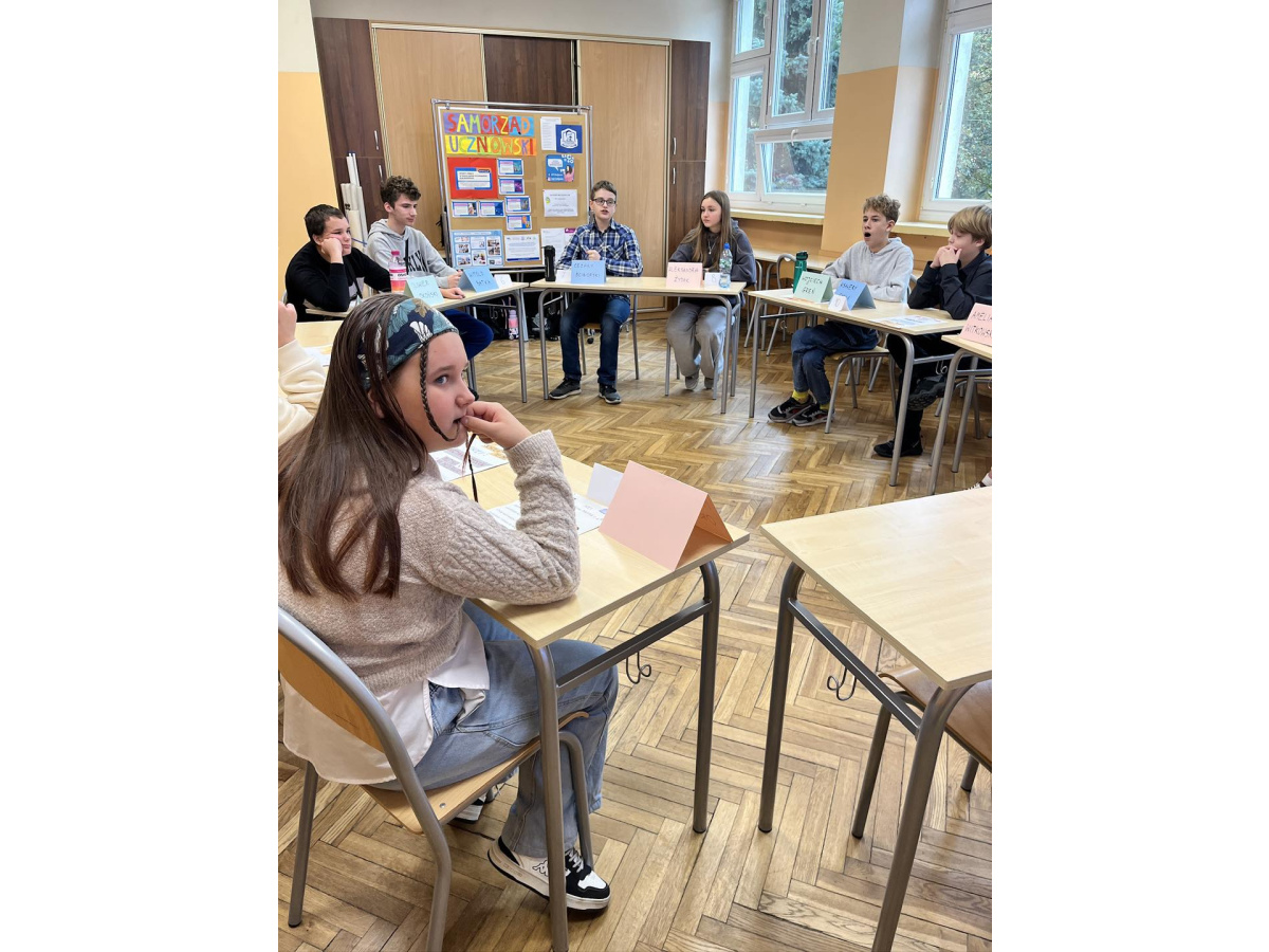We wtorek, 7 października, w naszej szkole odbyło się wyjątkowe posiedzenie, którego pomysłodawcą był Ksawery Sycha z klasy 8b. Chęć zorganizowania szkolnej debaty zrodziła się u niego podczas mobilności w ramach Erasmus+, a że w naszej szkole głos uczniów jest ważny, zorganizowaliśmy debatę dla członków Rady Samorządu Uczniowskiego. Spotkanie było okazją do zaprezentowania ich pomysłów, energii i poczucia humoru, zanim wybiorą spośród siebie Przewodniczącego i Wiceprzewodniczącego Rady SU. Spotkanie prowadził Moderator, w którego rolę wcielił się Cyprian Gonicki z klasy 8a. Zadawał on zgromadzonym szereg pytań – tych poważnych i zupełnie nietypowych. Każdy uczestnik debaty odpowiadał zgodnie z wylosowaną wcześniej kolejnością, a na swoją wypowiedź miał maksymalnie 2 minuty. Uczniowie zmierzyli się z takimi pytaniami: