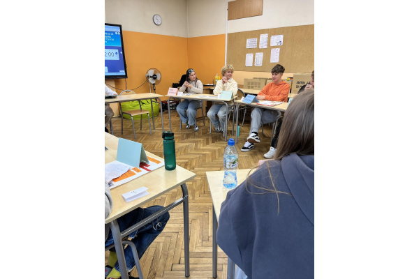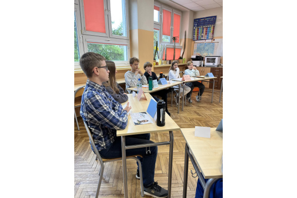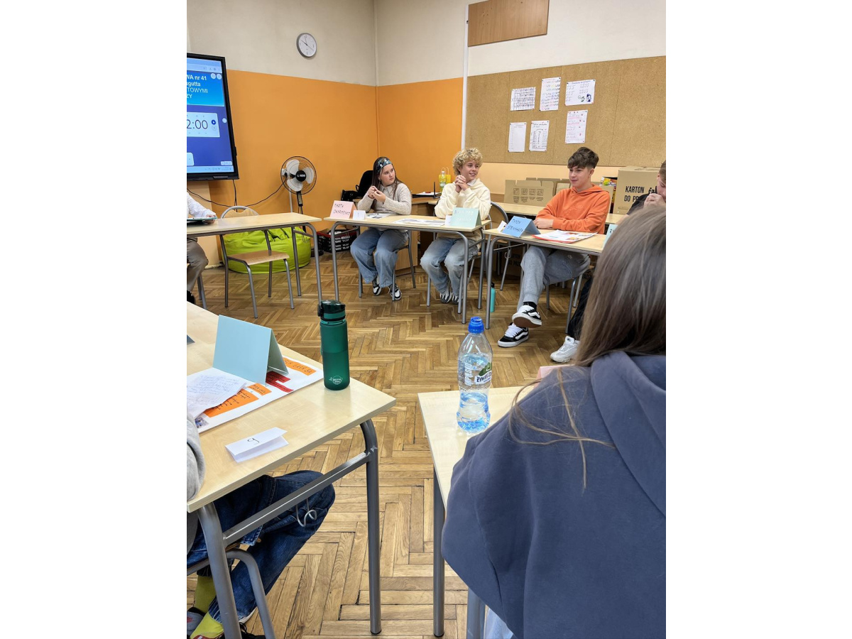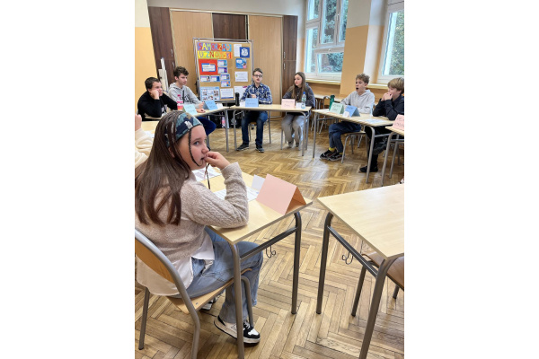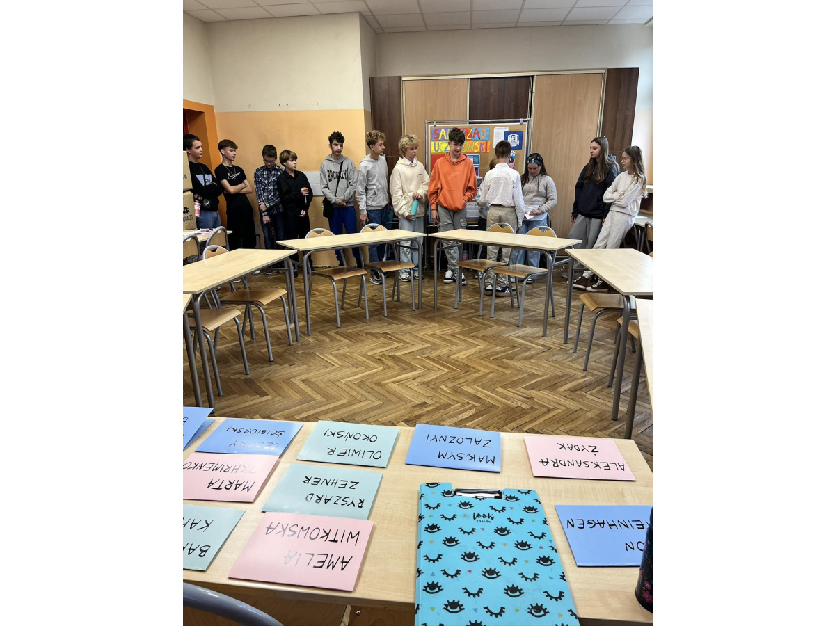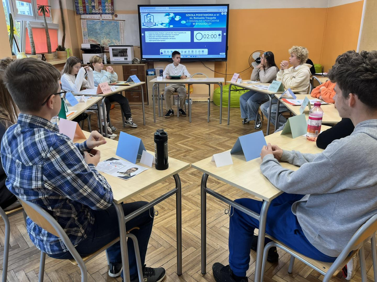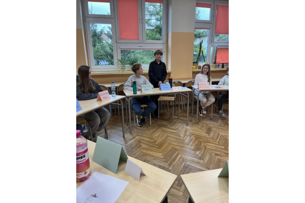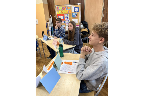 We wtorek, 7 października, w naszej szkole odbyło się wyjątkowe posiedzenie, którego pomysłodawcą był Ksawery Sycha z klasy 8b. Chęć zorganizowania szkolnej debaty zrodziła się u niego podczas mobilności w ramach Erasmus+, a że w naszej szkole głos uczniów jest ważny, zorganizowaliśmy debatę dla członków Rady Samorządu Uczniowskiego. Spotkanie było okazją do zaprezentowania ich pomysłów, energii i poczucia humoru, zanim wybiorą spośród siebie Przewodniczącego i Wiceprzewodniczącego Rady SU. Spotkanie prowadził Moderator, w którego rolę wcielił się Cyprian Gonicki z klasy 8a. Zadawał on zgromadzonym szereg pytań – tych poważnych i zupełnie nietypowych. Każdy uczestnik debaty odpowiadał zgodnie z wylosowaną wcześniej kolejnością, a na swoją wypowiedź miał maksymalnie 2 minuty. Uczniowie zmierzyli się z takimi pytaniami: