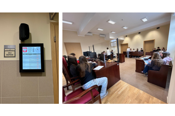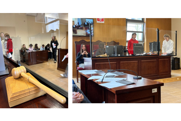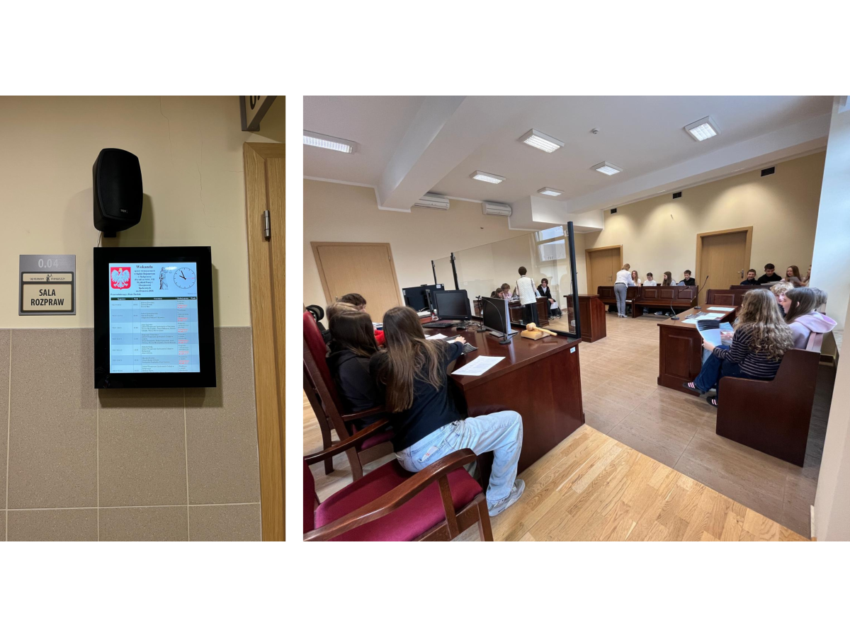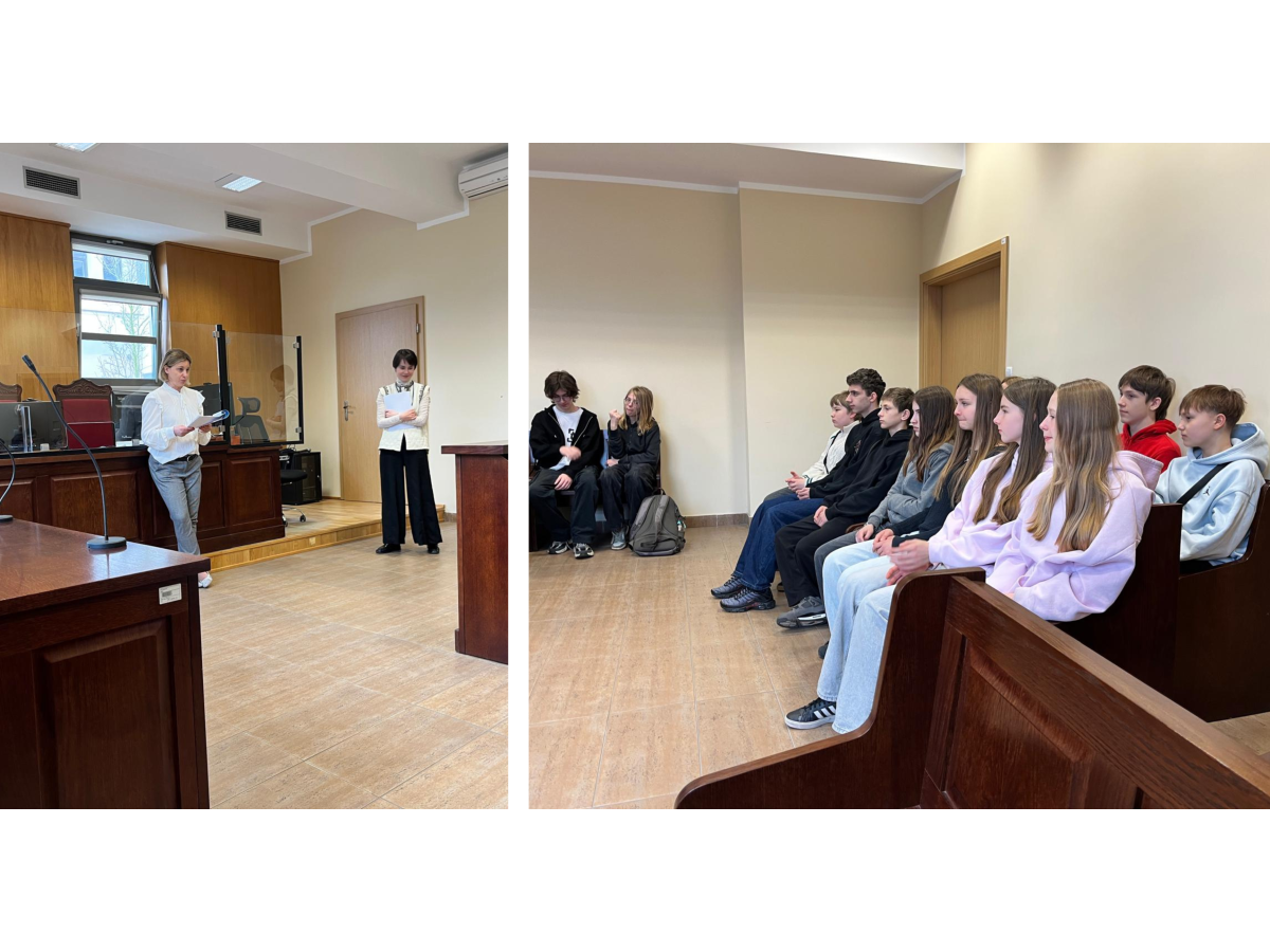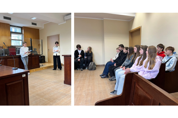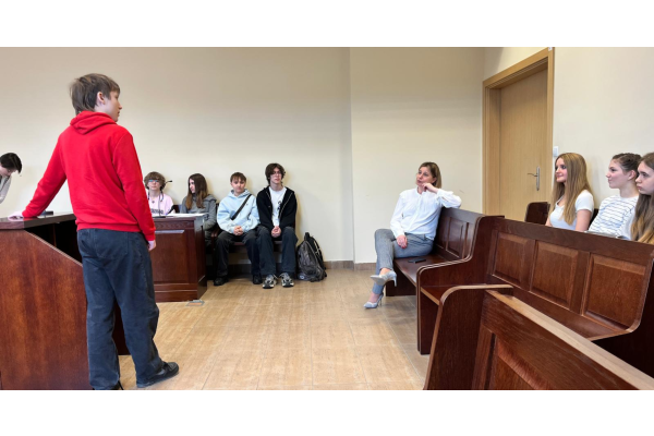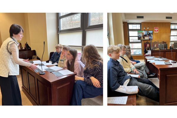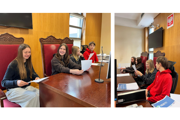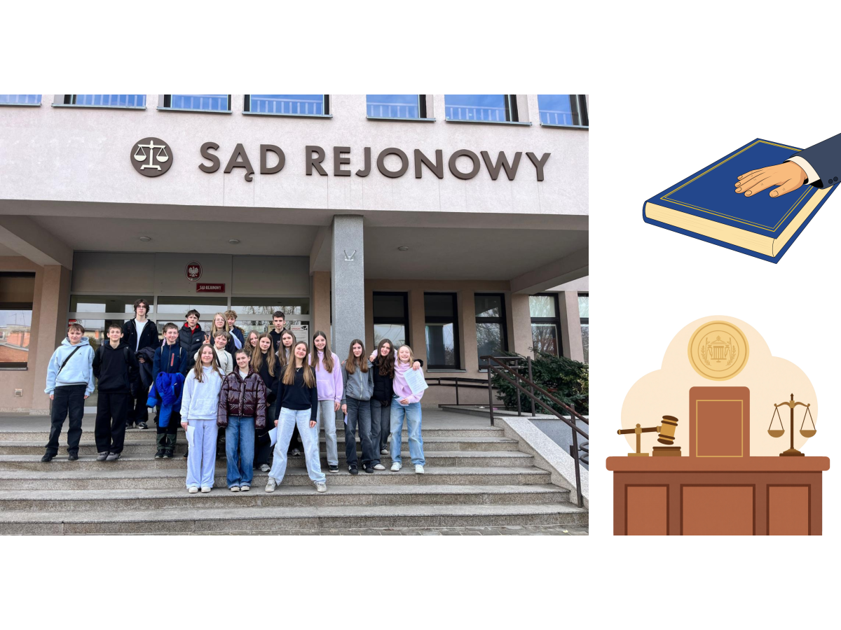 Z okazji Dnia Edukacji Prawnej uczniowie klasy 7a odwiedzili Sąd Rejonowy w Bydgoszczy, gdzie mieli okazję uczestniczyć w wyjątkowych zajęciach prowadzonych przez panią sędzię Anettę Marciniak. Spotkanie było doskonałą okazją do poznania specyfiki zawodów związanych z wymiarem sprawiedliwości oraz zasad funkcjonowania sądu. Już samo wejście do sądu i przejście kontroli bezpieczeństwa było nie lada atrakcją. Jednak najbardziej angażującą częścią wizyty była symulacja rozprawy sądowej, w której uczniowie wcielili się w różne role procesowe – sędziów, prokuratorów, kuratorów, mediatorów, adwokatów i radców prawnych, a także świadków, pokrzywdzonych i oskarżonych. Każda grupa musiała najpierw rozwiązać przygotowane dla nich kazusy, które stanowiły pewnego rodzaju element układanki - opis konkretnego zdarzenia w formie problemowej, które należało przeanalizować i rozstrzygnąć zgodnie z prawem. Uczniowie interpretowali to zdarzenie z perspektywy "swojej profesji" wskazując odpowiednie przepisy i uzasadniając swoje stanowisko. Dzięki temu mogli w praktyce doświadczyć, jak wygląda przebieg rozprawy oraz jakie obowiązki i odpowiedzialność wiążą się z poszczególnymi funkcjami.