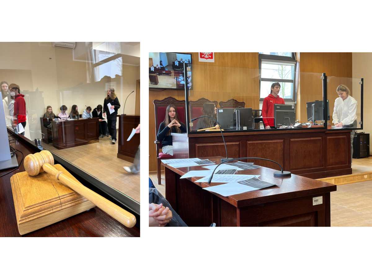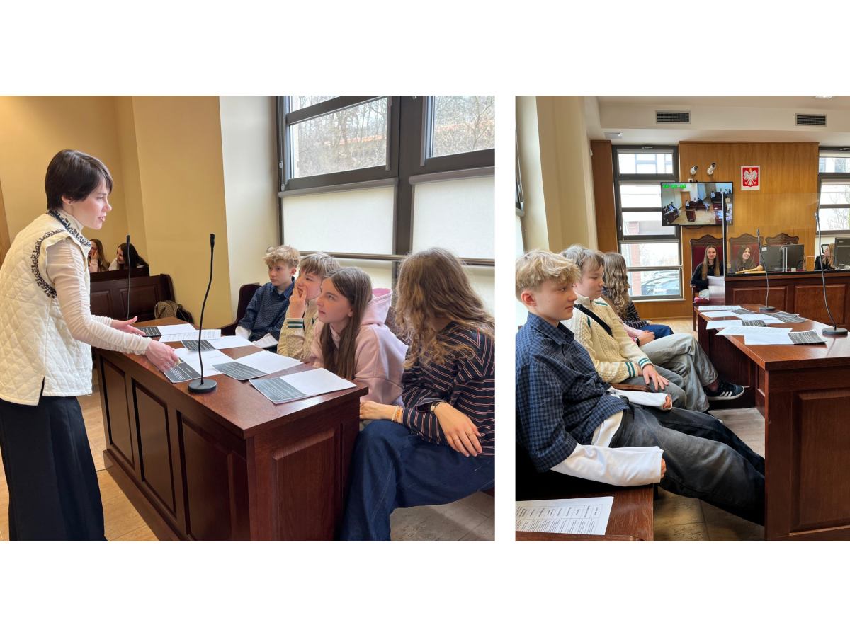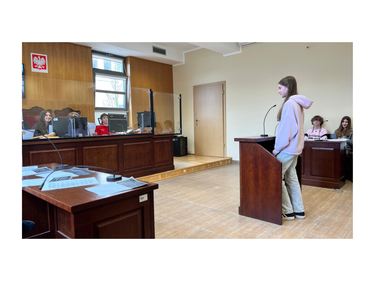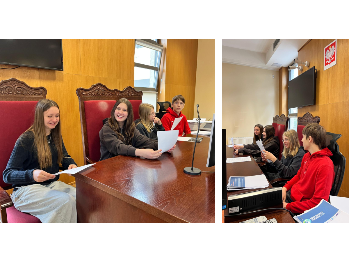 Zajęcia były niezwykle angażujące, gdyż tematyka rozprawy była bliska sytuacjom z życia codziennego uczniów – dotyczyła znalezienia telefonu komórkowego na terenie szkoły i prawdopodobnego przywłaszczenia go przez jedną z uczennic. Scenariusz pozwolił uczniom lepiej zrozumieć konsekwencje podejmowanych decyzji oraz znaczenie przestrzegania prawa w życiu codziennym. Udział w tych warsztatach był dla uczniów cennym doświadczeniem, które nie tylko poszerzyło ich wiedzę, ale także rozwinęło umiejętność argumentowania, współpracy, odpowiedzialnego podejmowania decyzji i rozwiązywania problemów społecznych. Pani sędzia uświadomiła naszych uczniów, że prawo ma realną moc i sprawczość, a zawody prawnicze są blisko ludzi i ich codziennych spraw. Dziękujemy!