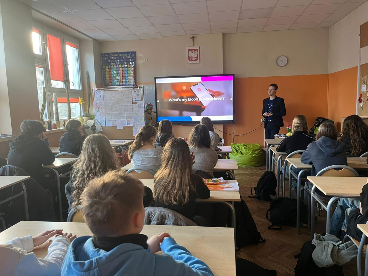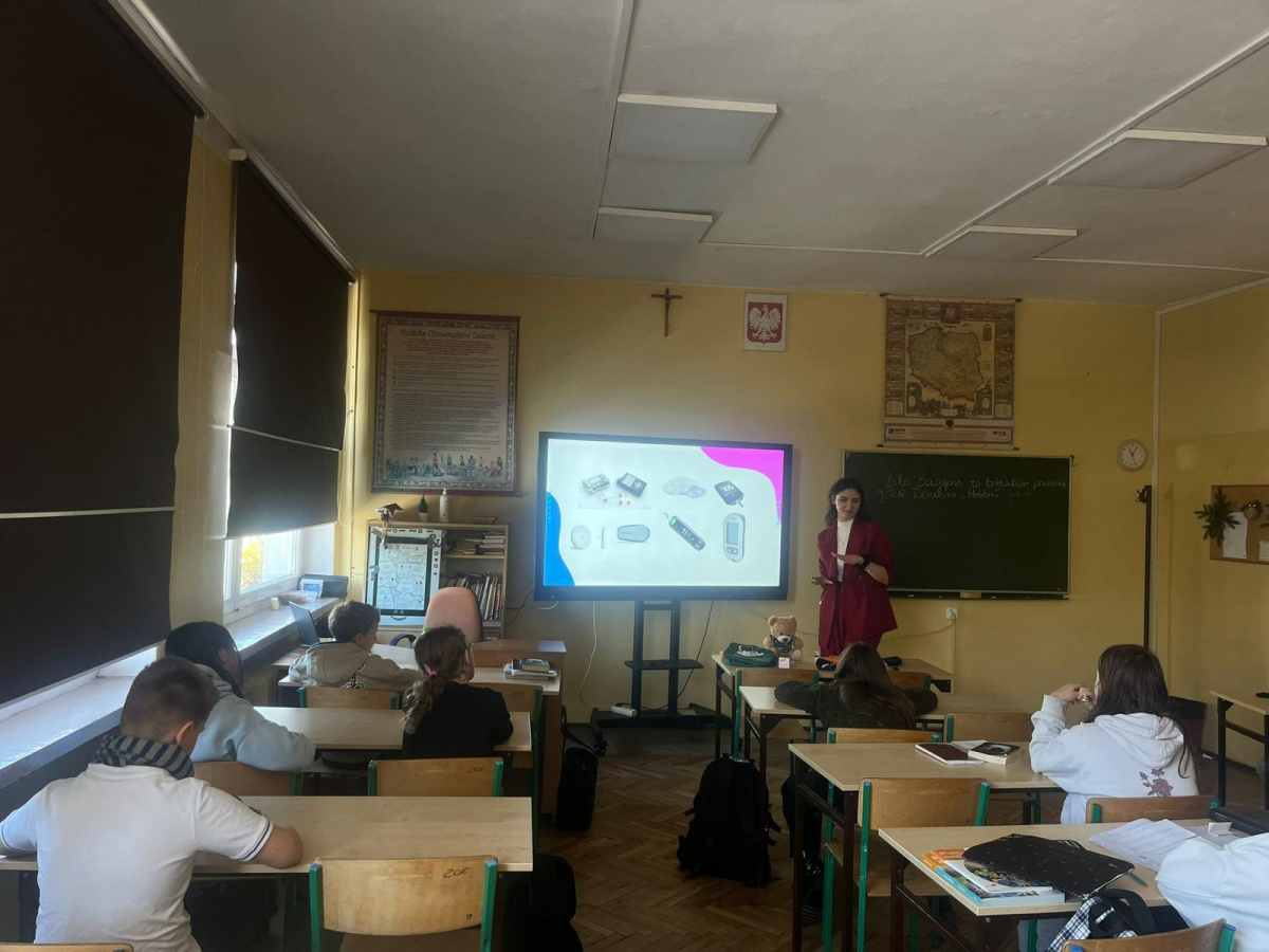 Podczas spotkania uczniowie klas 6-8 mieli okazję dowiedzieć się, czym jest cukrzyca typu 1, jakie są jej objawy, jak wygląda codzienne życie osób chorujących na tę chorobę oraz jak można pomóc w sytuacjach nagłych.