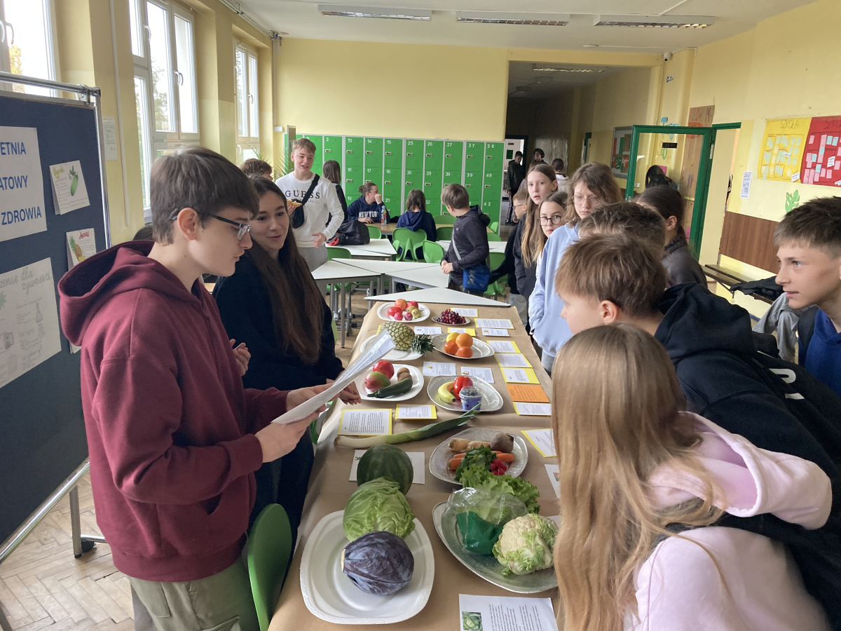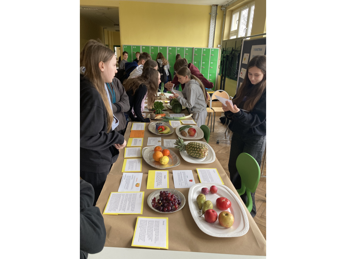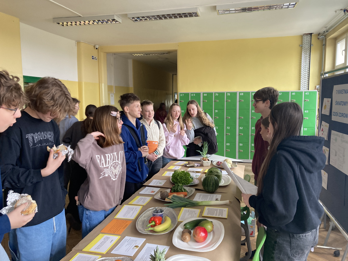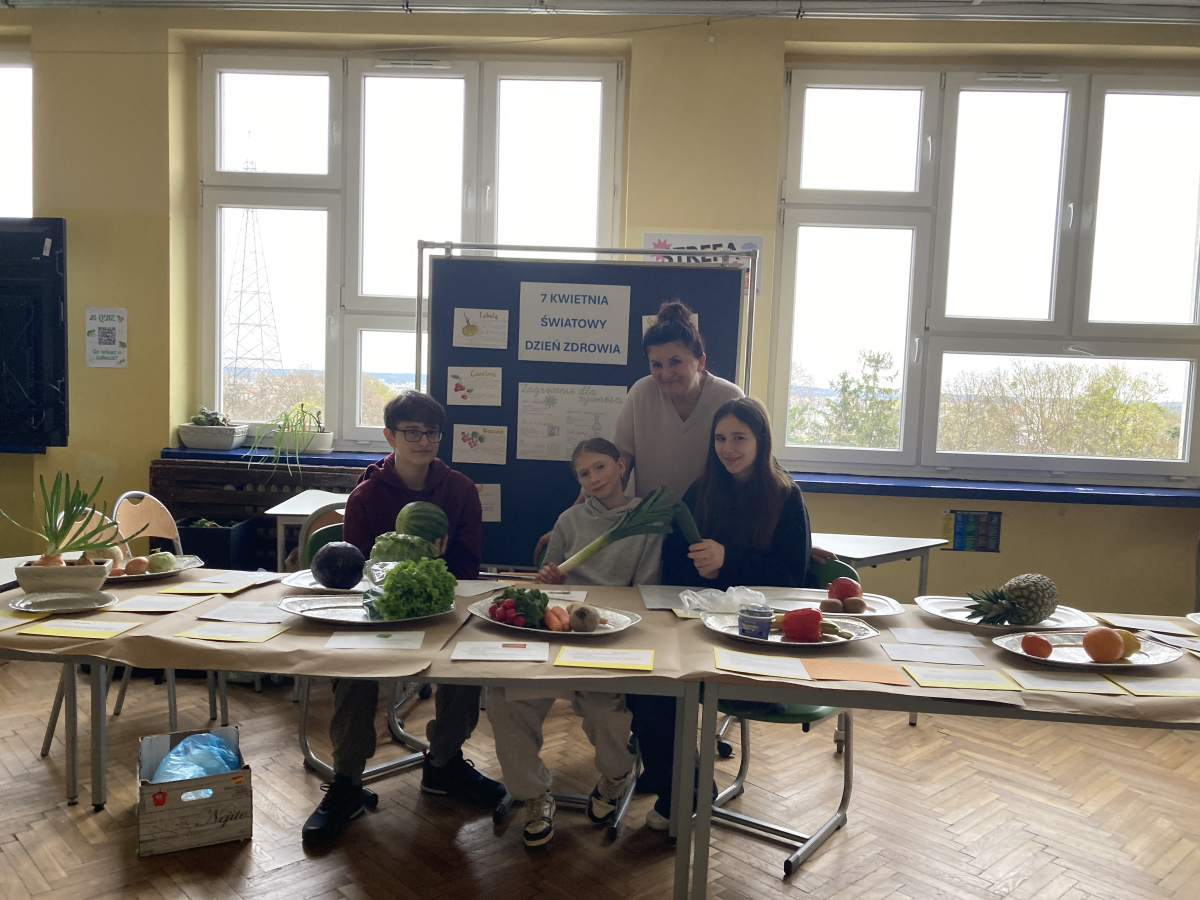 Już kolejny raz obchodzimy w naszej szkole Światowy Dzień Zdrowia. Na całym świecie Światowa Organizacja Zdrowia ustanowiła datę 7 kwietnia dniem zdrowia i służby zdrowia. Wzorem lat ubiegłych, uczniowie z klasy 7b wraz z wychowawcą panią Małgorzatą Ulanowską –Dylik przygotowali wystawę warzyw i owoców oraz quiz wiedzy na temat: części jadalnych warzyw, składników odżywczych w warzywach i owocach, ilości antyutleniaczy, błonnika i witamin oraz wielu innych informacji dotyczących wpływu warzyw i owoców na nasz wzrost i rozwój. Pytania nie były takie łatwe, dlatego niektórzy uczniowie podchodzili do quizu kilka razy aż udało im się otrzymać wymarzonego ananasa, mango czy cebulę.