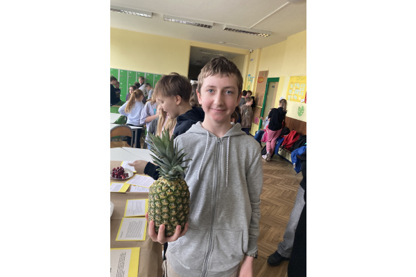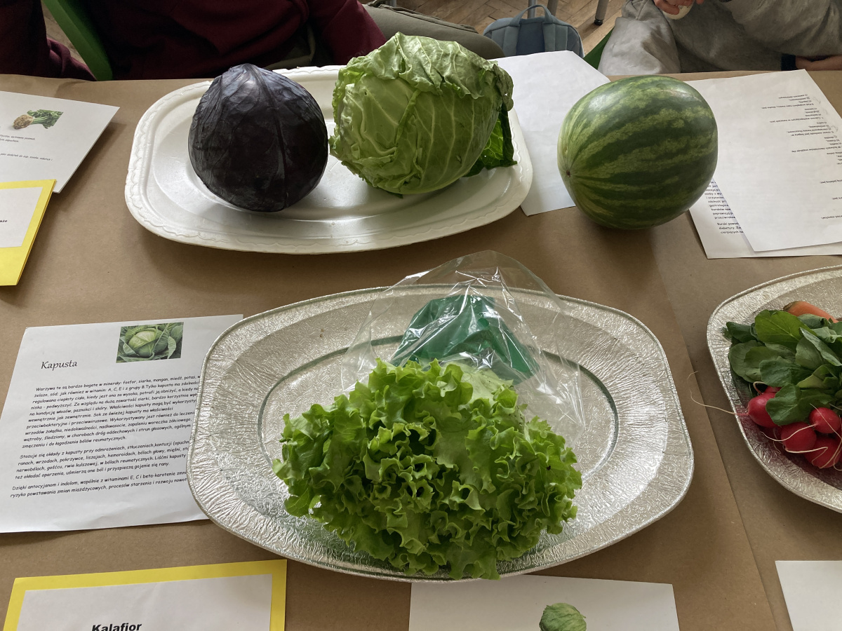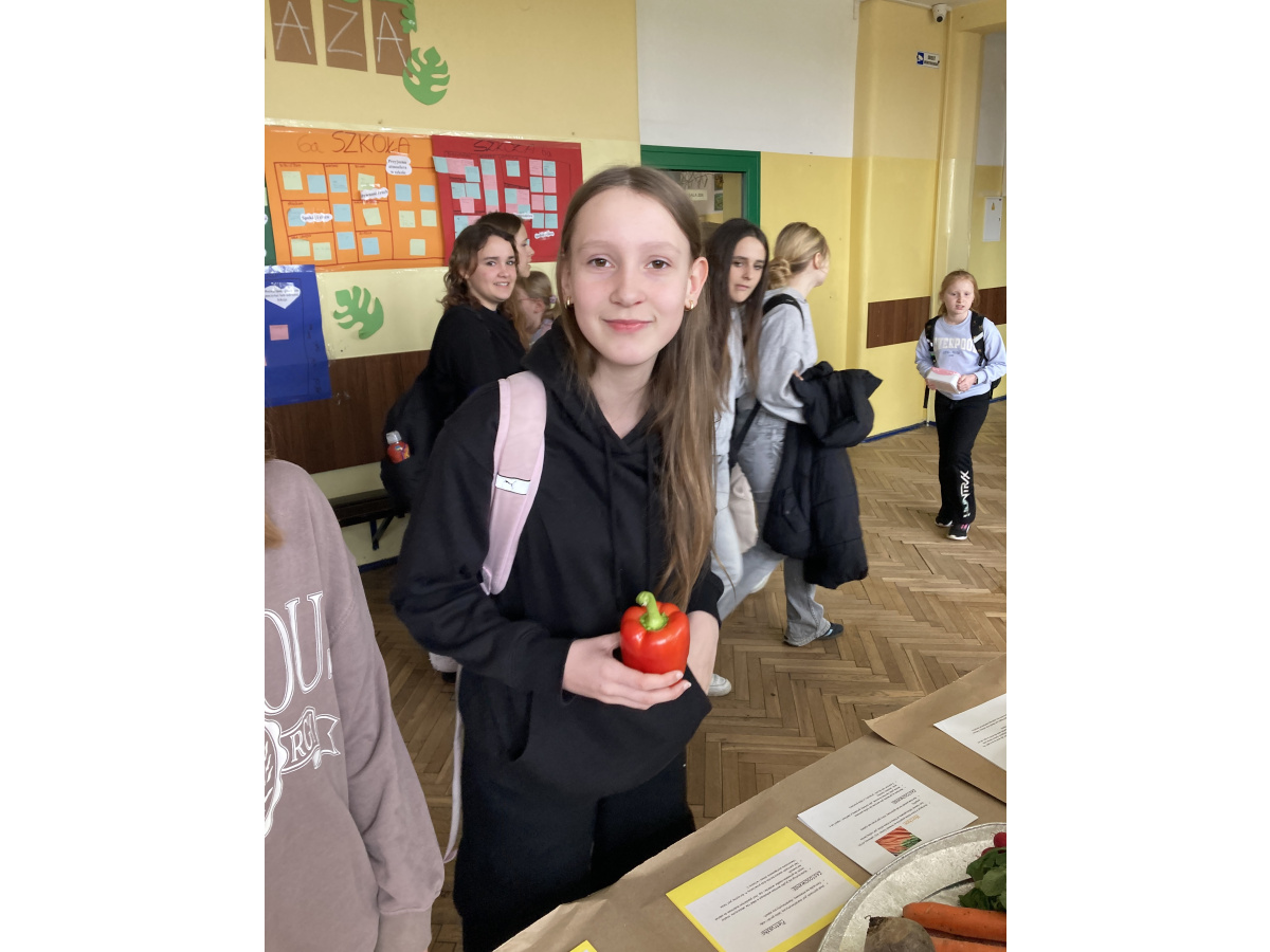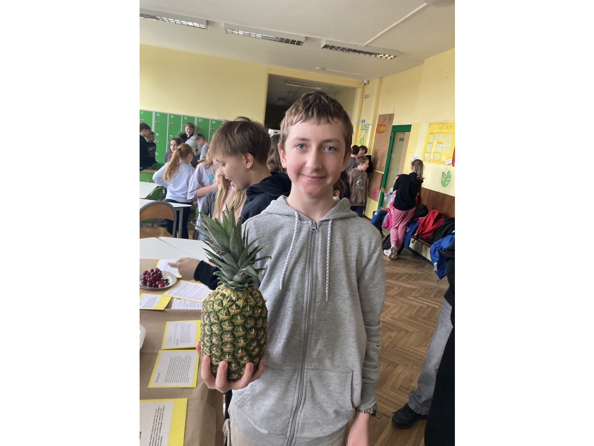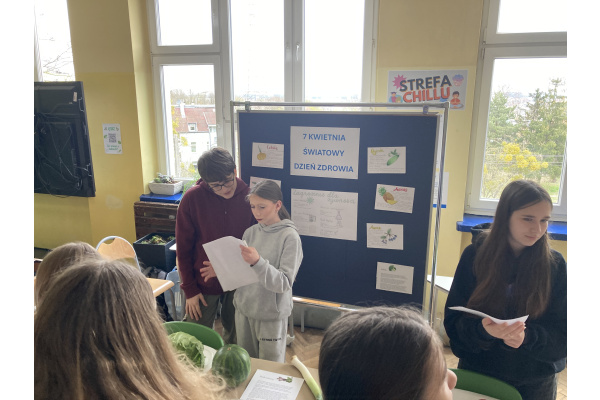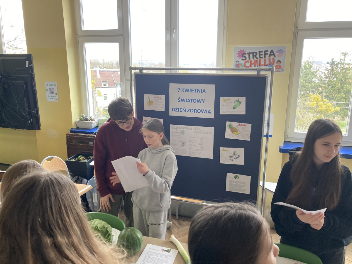 Już kolejny raz obchodzimy w naszej szkole Światowy Dzień Zdrowia. Na całym świecie Światowa Organizacja Zdrowia ustanowiła datę 7 kwietnia dniem zdrowia i służby zdrowia. Wzorem lat ubiegłych, uczniowie z klasy 7b wraz z wychowawcą panią Małgorzatą Ulanowską –Dylik przygotowali wystawę warzyw i owoców oraz quiz wiedzy na temat: części jadalnych warzyw, składników odżywczych w warzywach i owocach, ilości antyutleniaczy, błonnika i witamin oraz wielu innych informacji dotyczących wpływu warzyw i owoców na nasz wzrost i rozwój. Pytania nie były takie łatwe, dlatego niektórzy uczniowie podchodzili do quizu kilka razy aż udało im się otrzymać wymarzonego ananasa, mango czy cebulę.