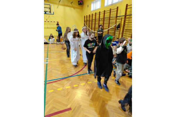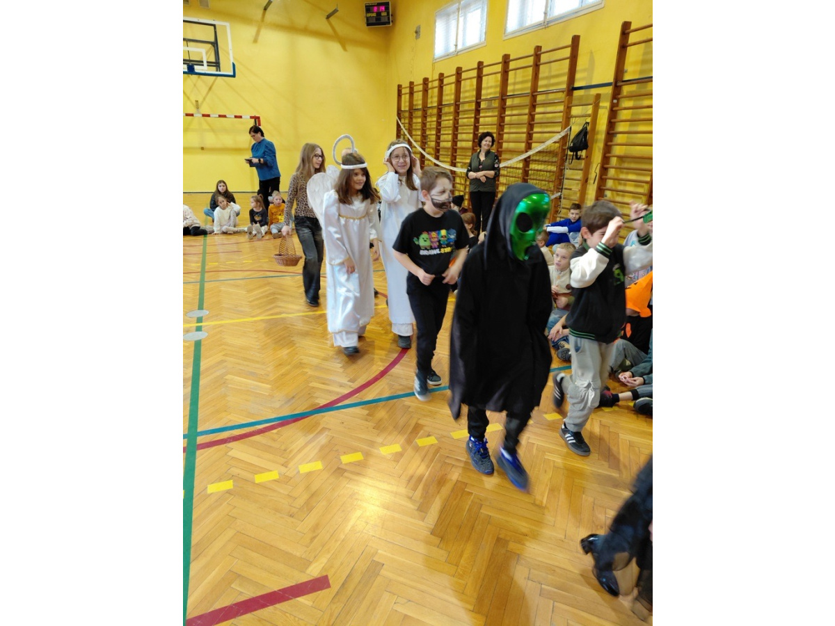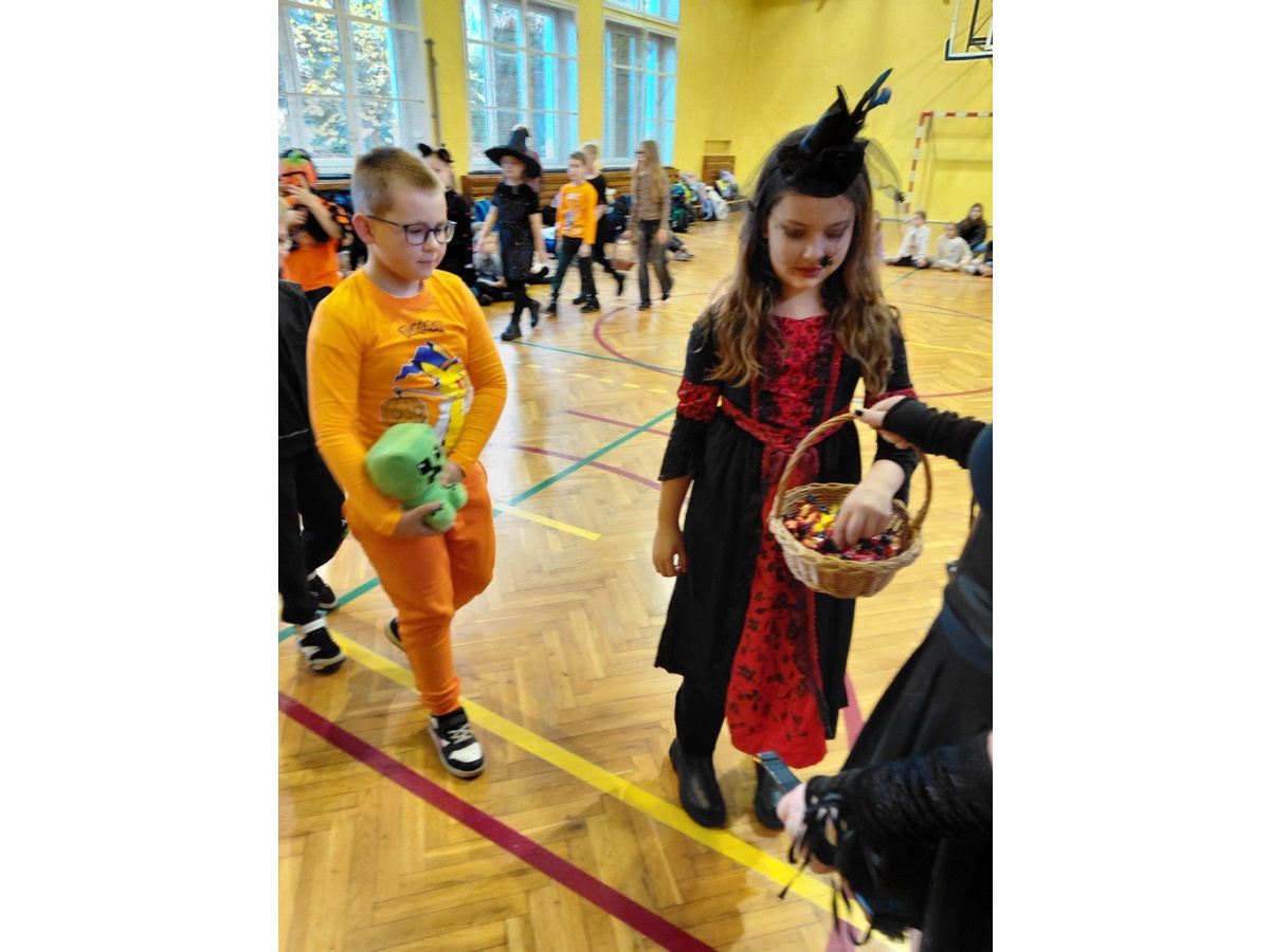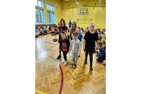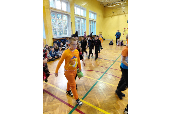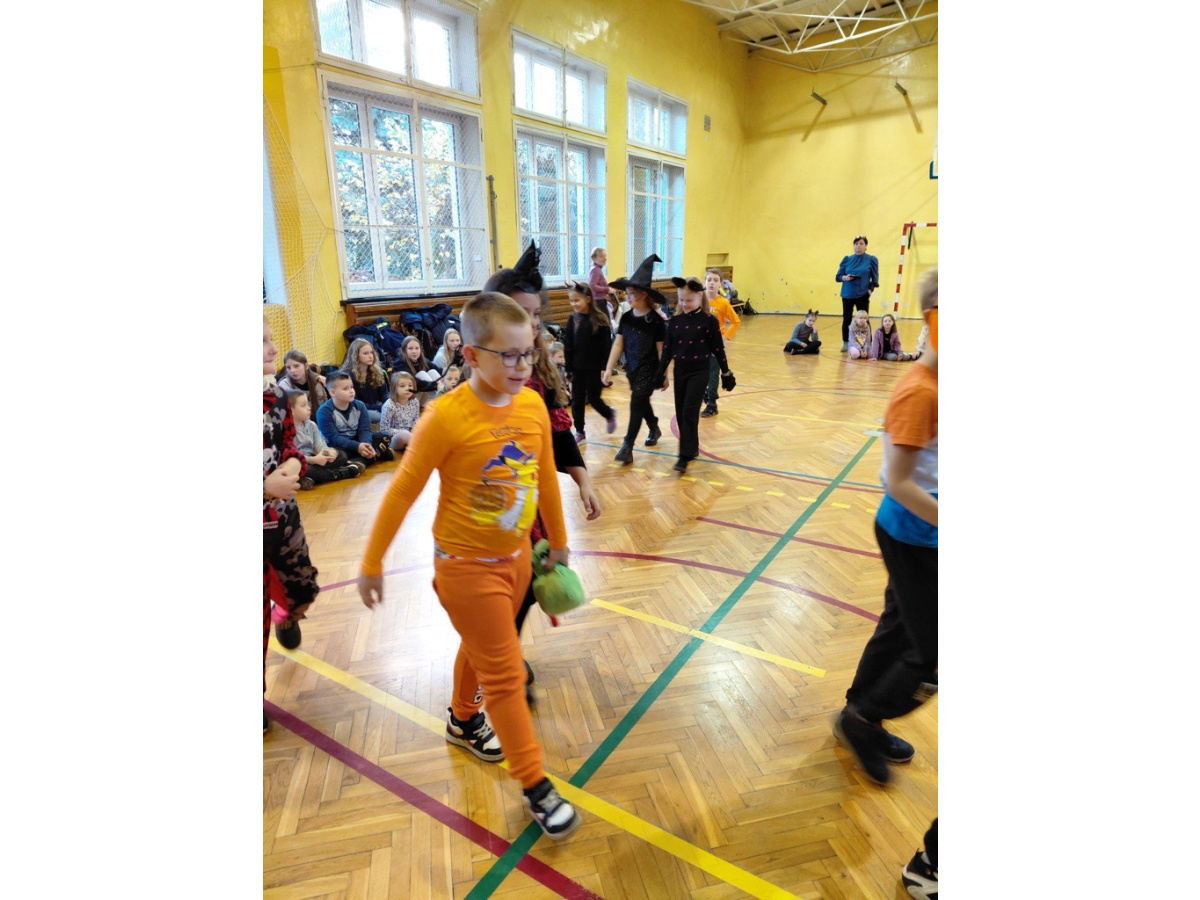 Klasy 1-3 brały zaś udział w halloweenowym pokazie mody na sali gimnastycznej. Uczniowie prezentowali swoje stroje przy akompaniamencie upiornie wesołej muzyki. Następnie dzieci wykonały gimnastykę do utworu "Skeleton dance", a kroków uczyły ich koleżanki z klasy 5a. Wszyscy zostali w nagrodę obdarowani cukierkami i nikt nie musiał straszyć psikusem ;) W klasach podczas zajęć językowych kontynuowano temat święta zmarłych dookoła świata, a zwieńczeniem aktywności było przygotowanie lampionów z dyni na kartce papieru, które za pomocą technologii AR (rozszerzona rzeczywistość) i dedykowanej aplikacji ożyły na lekcji.