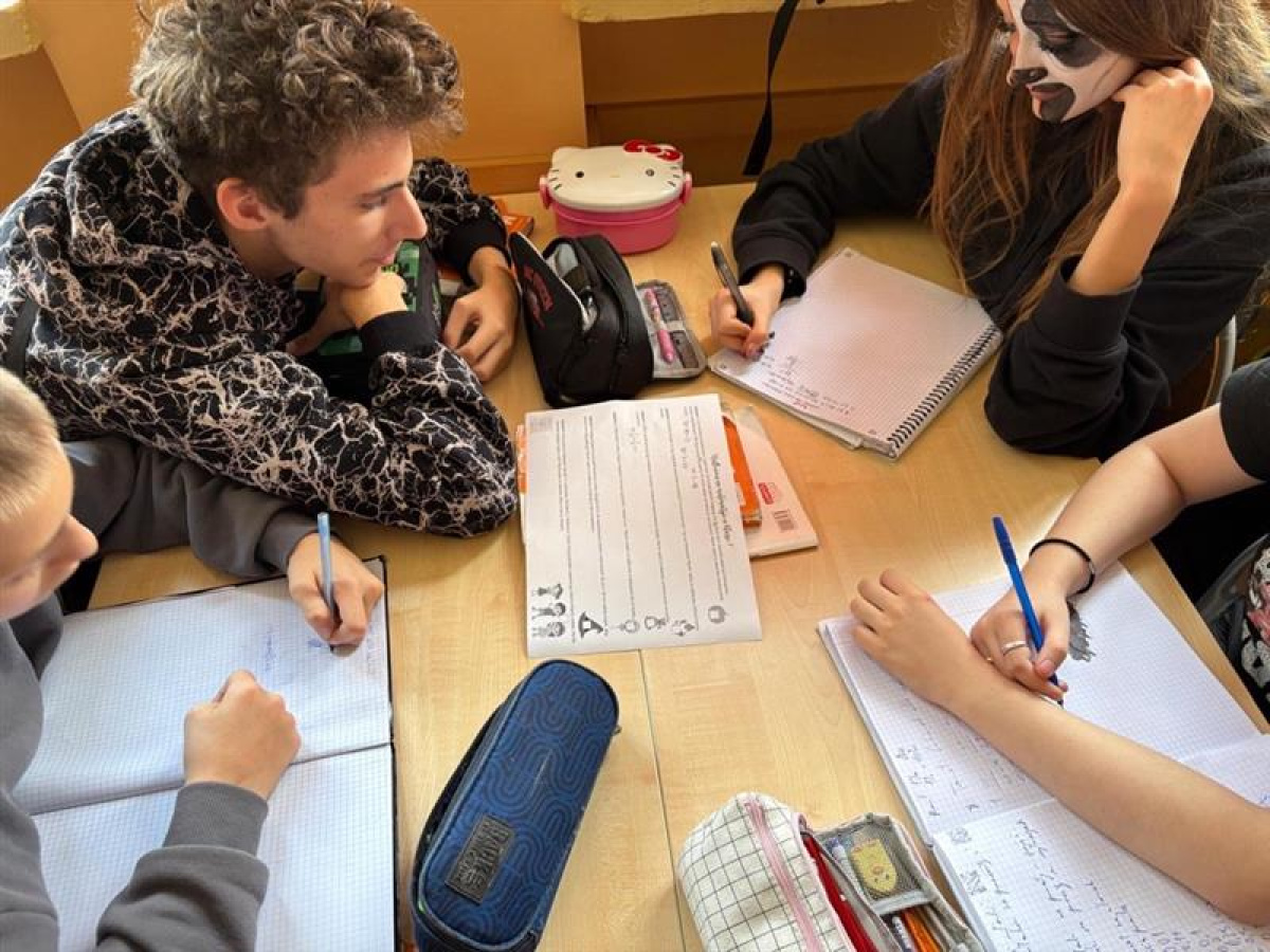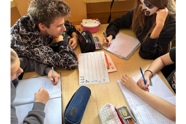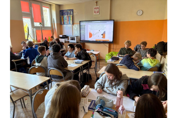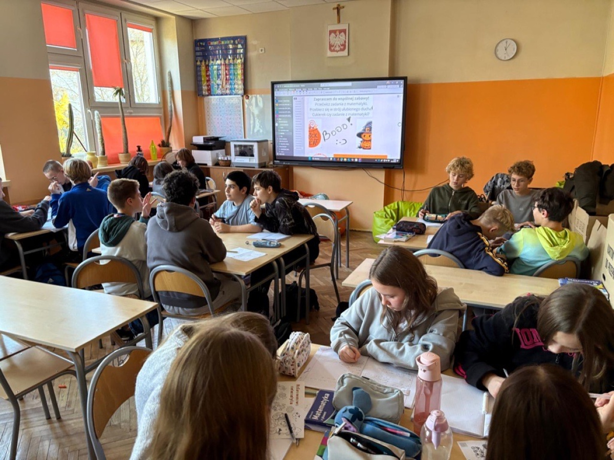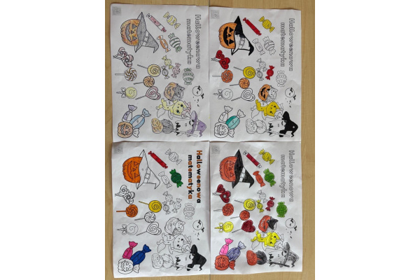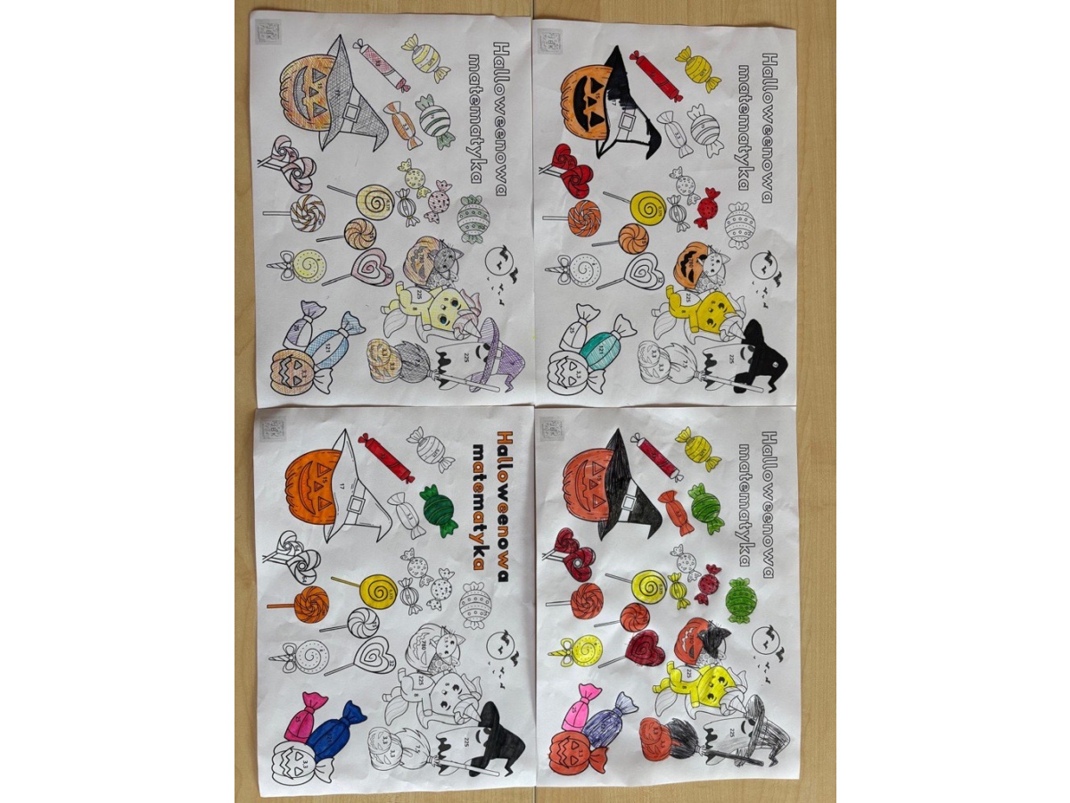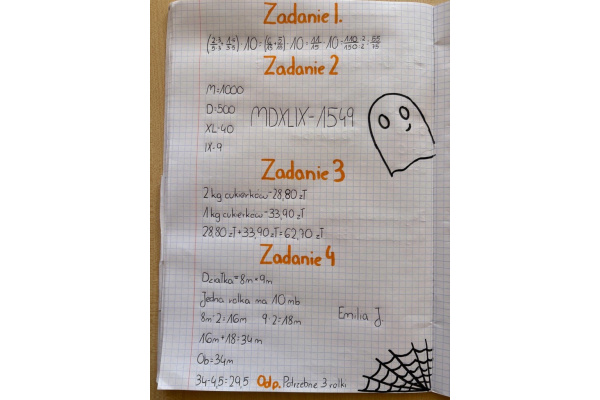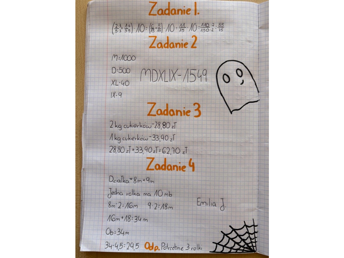 Halloweenowe zadania zagościły również na lekcji matematyki. Klasa ósma rozwiązywała zadania przygotowujące do egzaminu, a pozostałe klasy wykonywały zadania rachunkowe i testowe dostosowane do ich wiedzy i umiejętności.