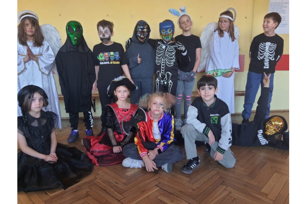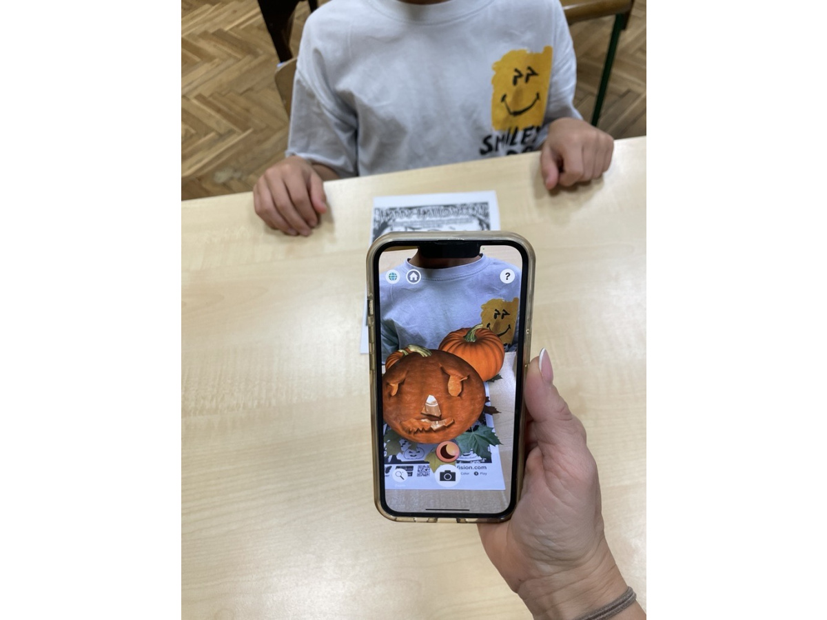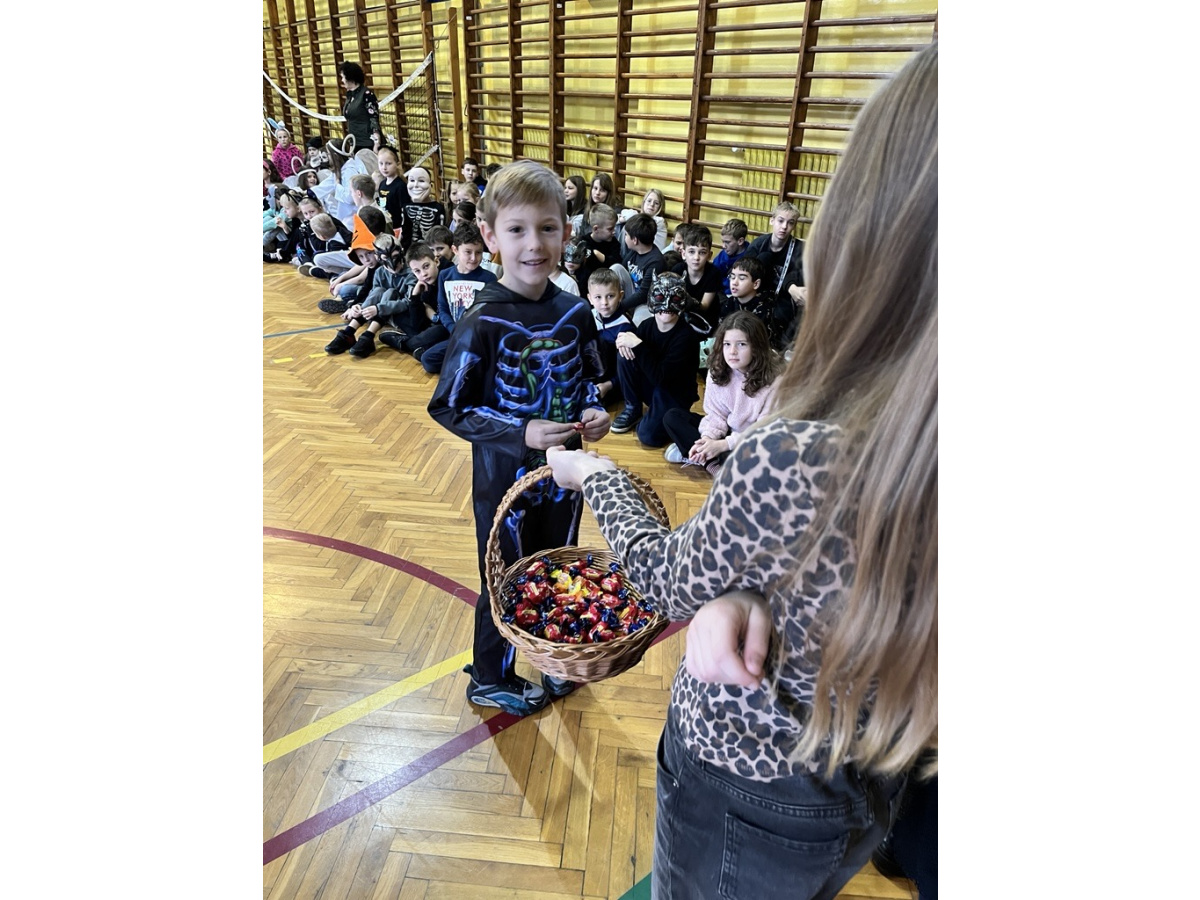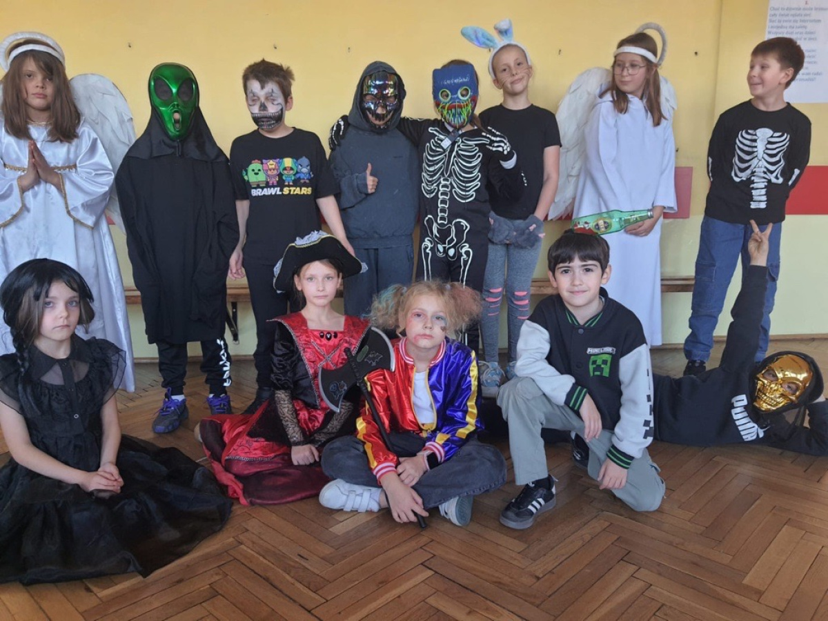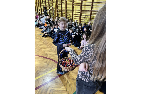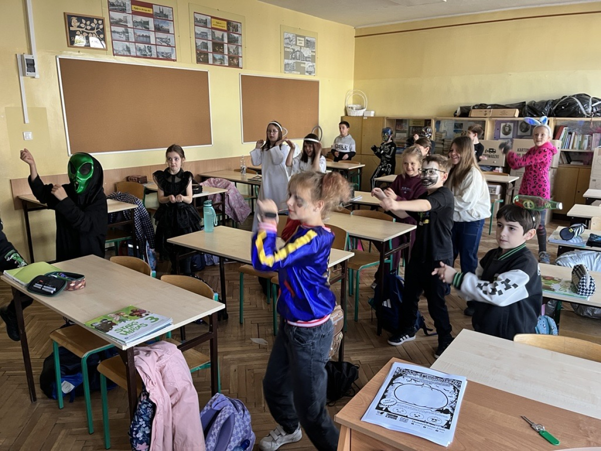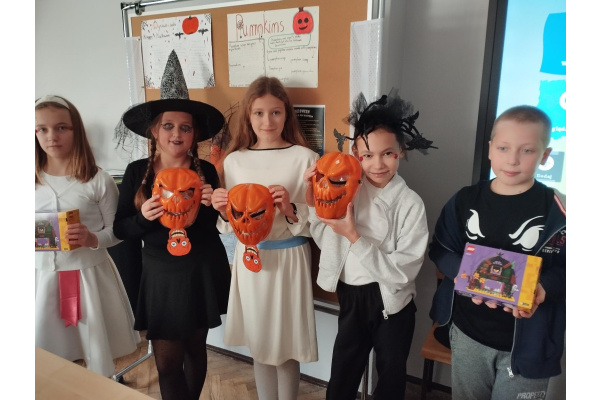 Klasy 1-3 brały zaś udział w halloweenowym pokazie mody na sali gimnastycznej. Uczniowie prezentowali swoje stroje przy akompaniamencie upiornie wesołej muzyki. Następnie dzieci wykonały gimnastykę do utworu "Skeleton dance", a kroków uczyły ich koleżanki z klasy 5a. Wszyscy zostali w nagrodę obdarowani cukierkami i nikt nie musiał straszyć psikusem ;) W klasach podczas zajęć językowych kontynuowano temat święta zmarłych dookoła świata, a zwieńczeniem aktywności było przygotowanie lampionów z dyni na kartce papieru, które za pomocą technologii AR (rozszerzona rzeczywistość) i dedykowanej aplikacji ożyły na lekcji.