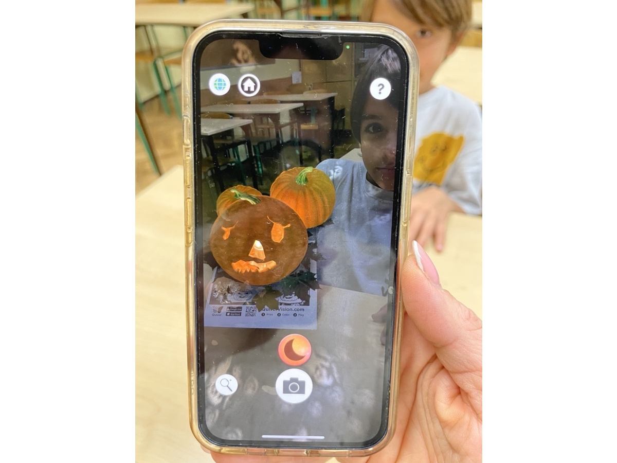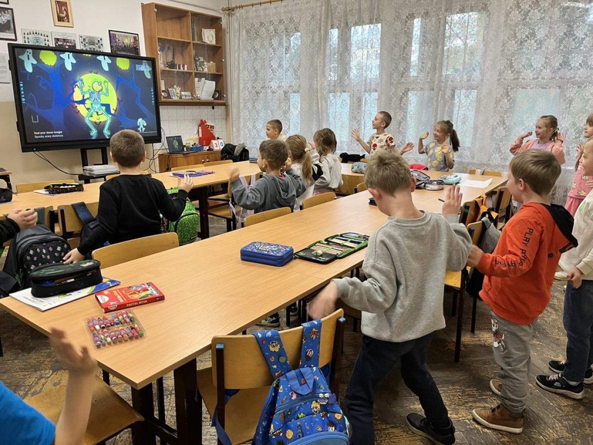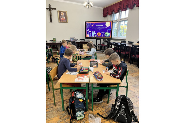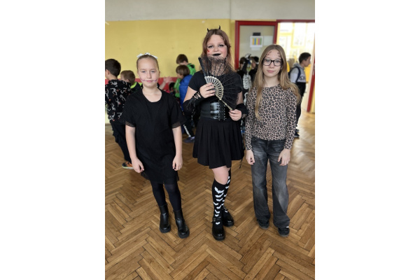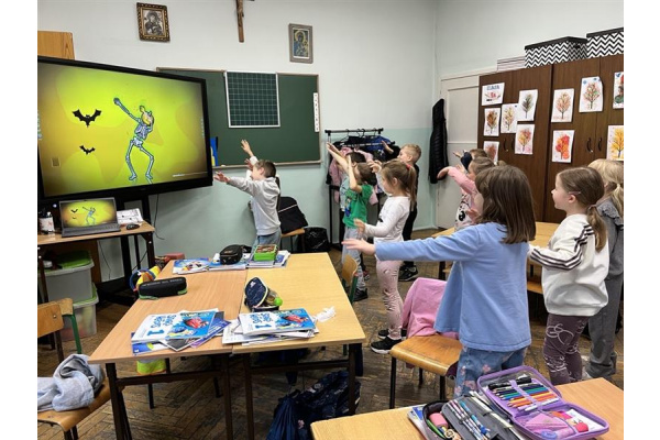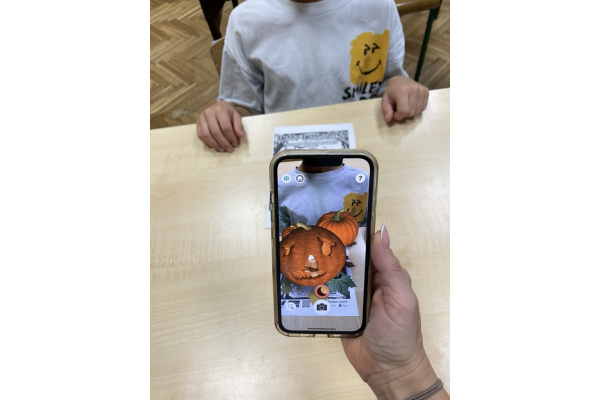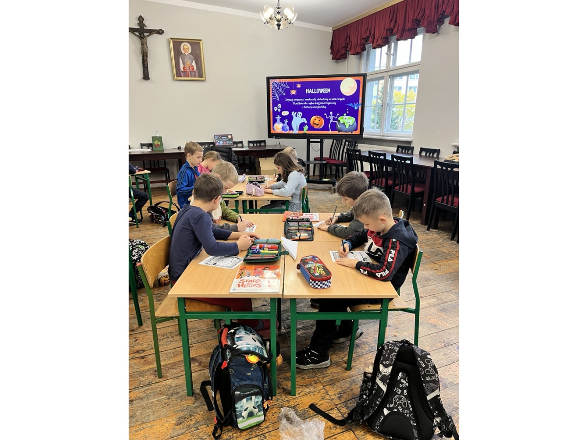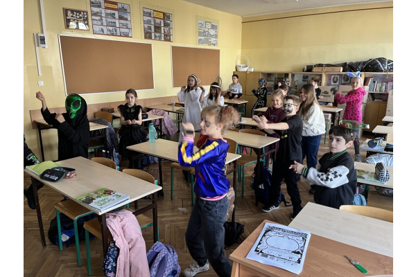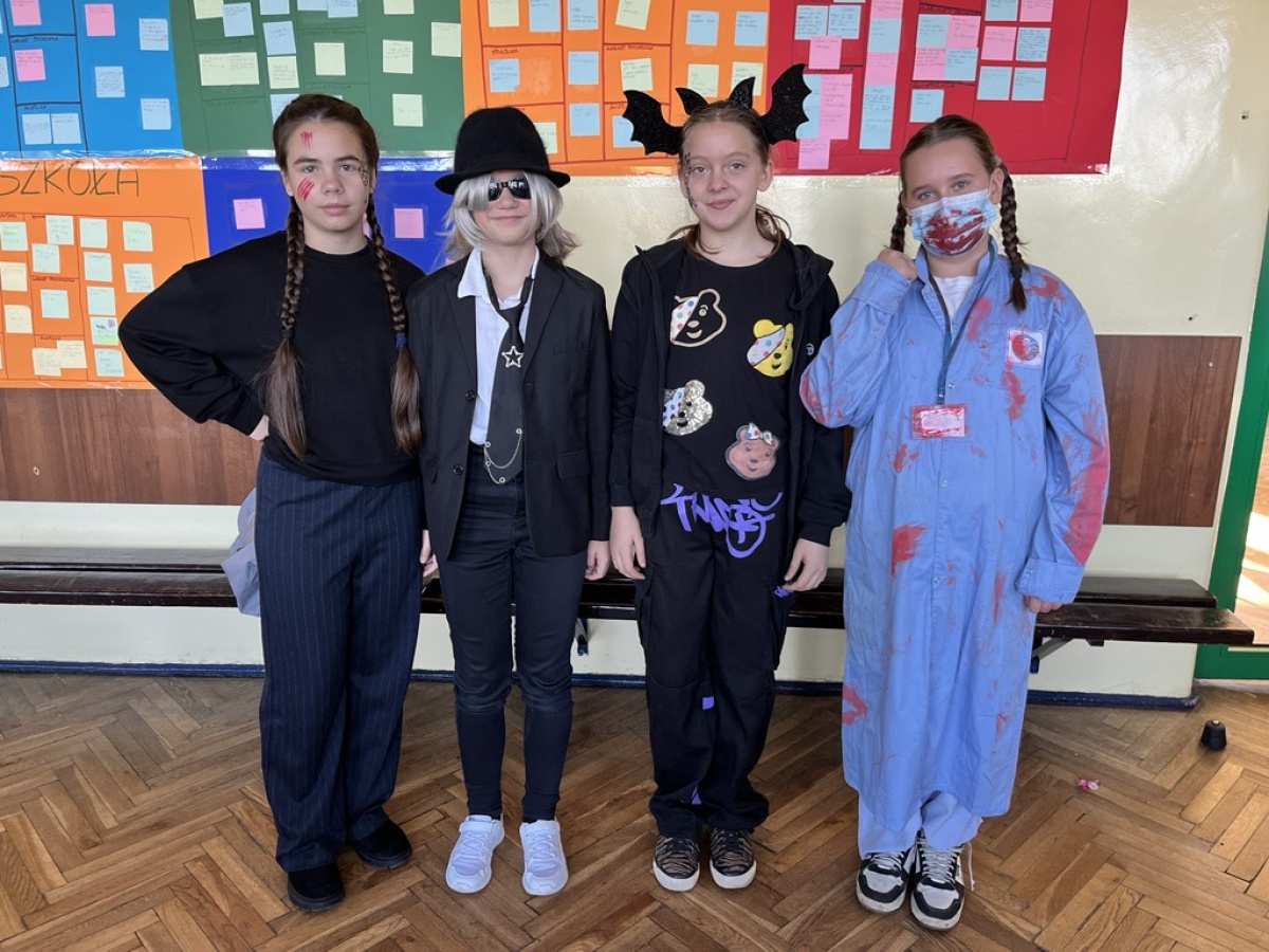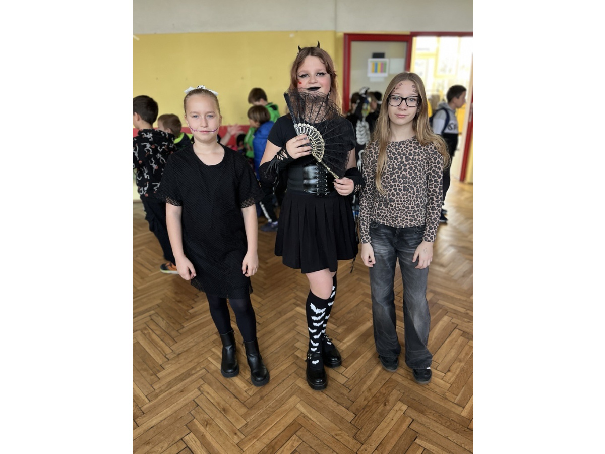 Klasy 1-3 brały zaś udział w halloweenowym pokazie mody na sali gimnastycznej. Uczniowie prezentowali swoje stroje przy akompaniamencie upiornie wesołej muzyki. Następnie dzieci wykonały gimnastykę do utworu "Skeleton dance", a kroków uczyły ich koleżanki z klasy 5a. Wszyscy zostali w nagrodę obdarowani cukierkami i nikt nie musiał straszyć psikusem ;) W klasach podczas zajęć językowych kontynuowano temat święta zmarłych dookoła świata, a zwieńczeniem aktywności było przygotowanie lampionów z dyni na kartce papieru, które za pomocą technologii AR (rozszerzona rzeczywistość) i dedykowanej aplikacji ożyły na lekcji.