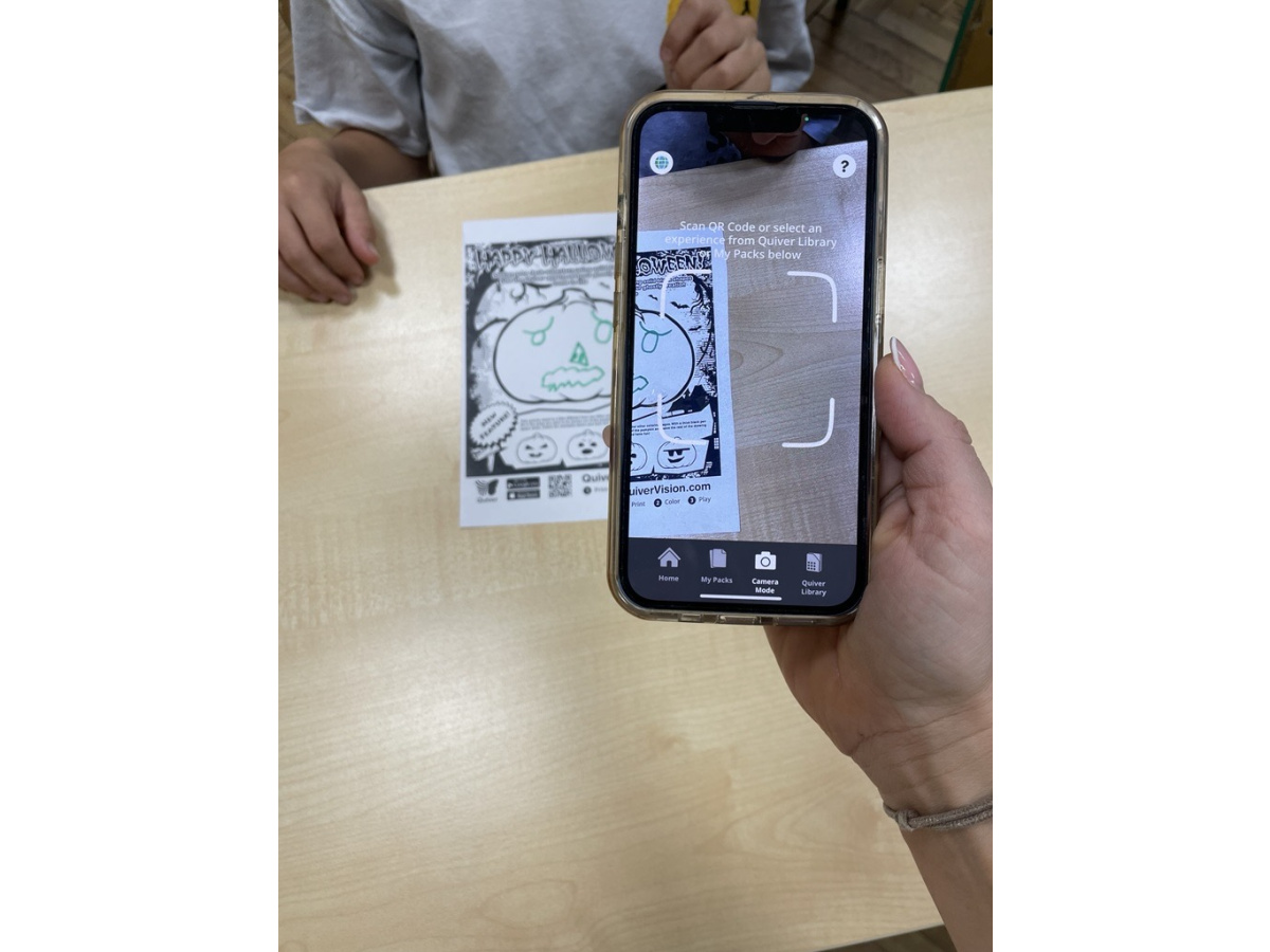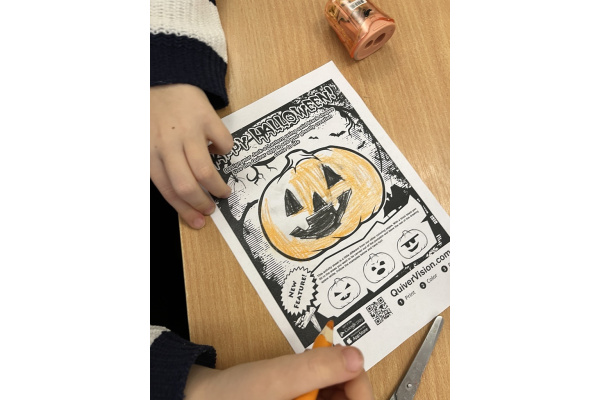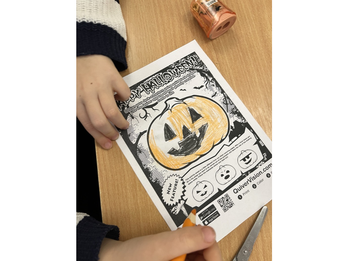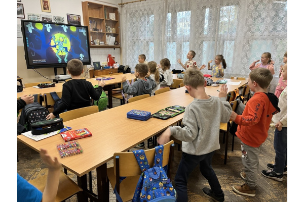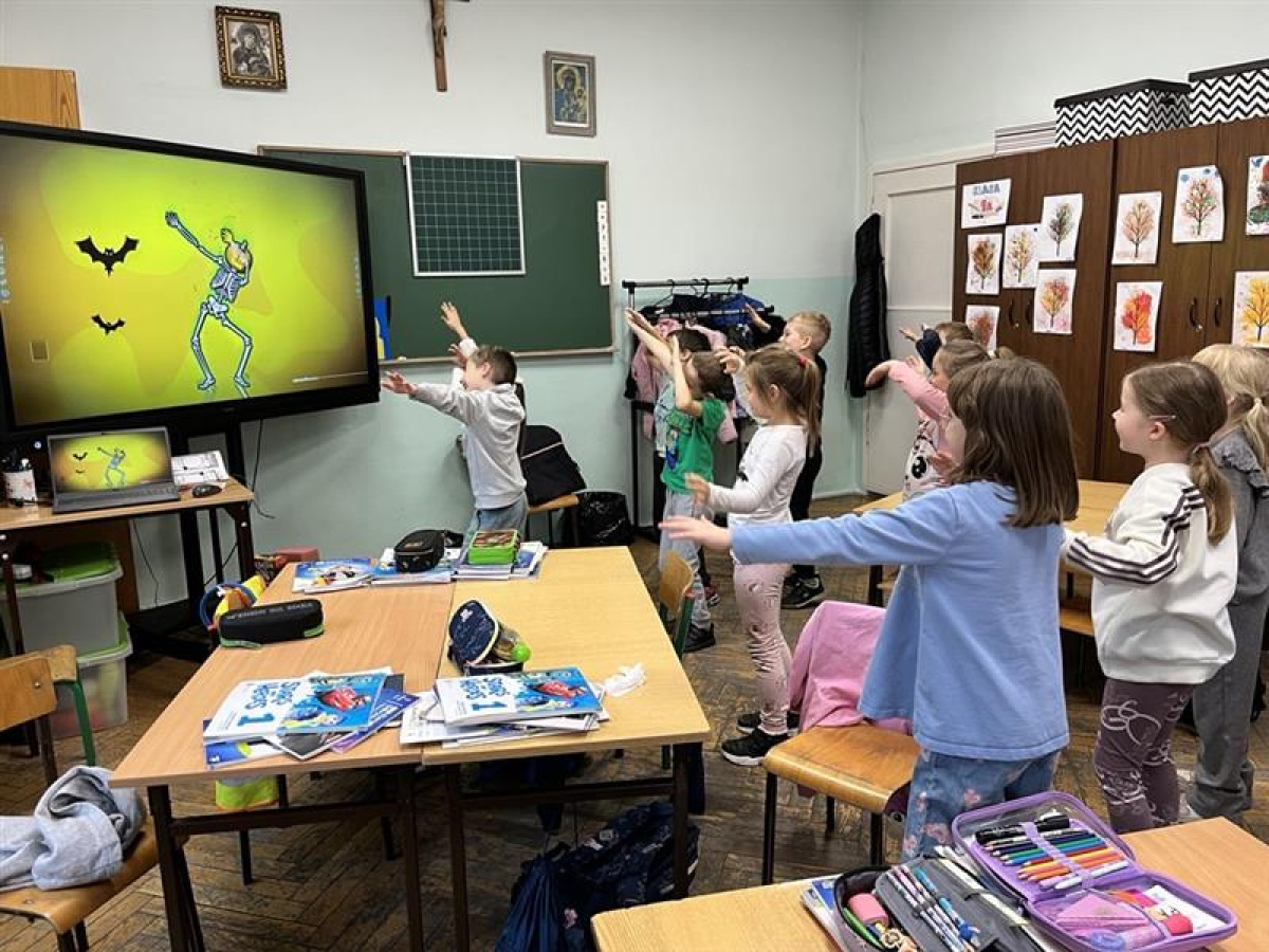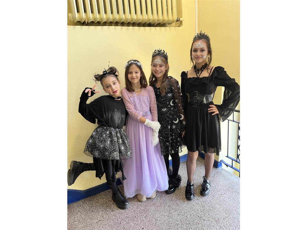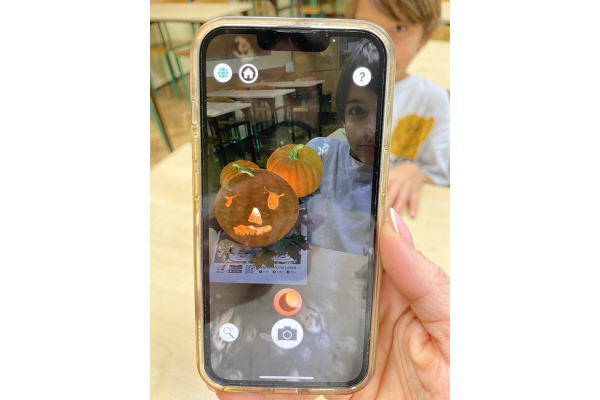 Klasy 1-3 brały zaś udział w halloweenowym pokazie mody na sali gimnastycznej. Uczniowie prezentowali swoje stroje przy akompaniamencie upiornie wesołej muzyki. Następnie dzieci wykonały gimnastykę do utworu "Skeleton dance", a kroków uczyły ich koleżanki z klasy 5a. Wszyscy zostali w nagrodę obdarowani cukierkami i nikt nie musiał straszyć psikusem ;) W klasach podczas zajęć językowych kontynuowano temat święta zmarłych dookoła świata, a zwieńczeniem aktywności było przygotowanie lampionów z dyni na kartce papieru, które za pomocą technologii AR (rozszerzona rzeczywistość) i dedykowanej aplikacji ożyły na lekcji.