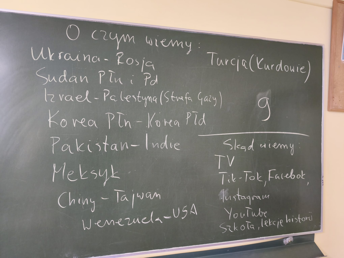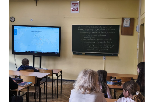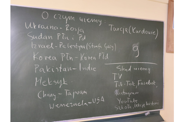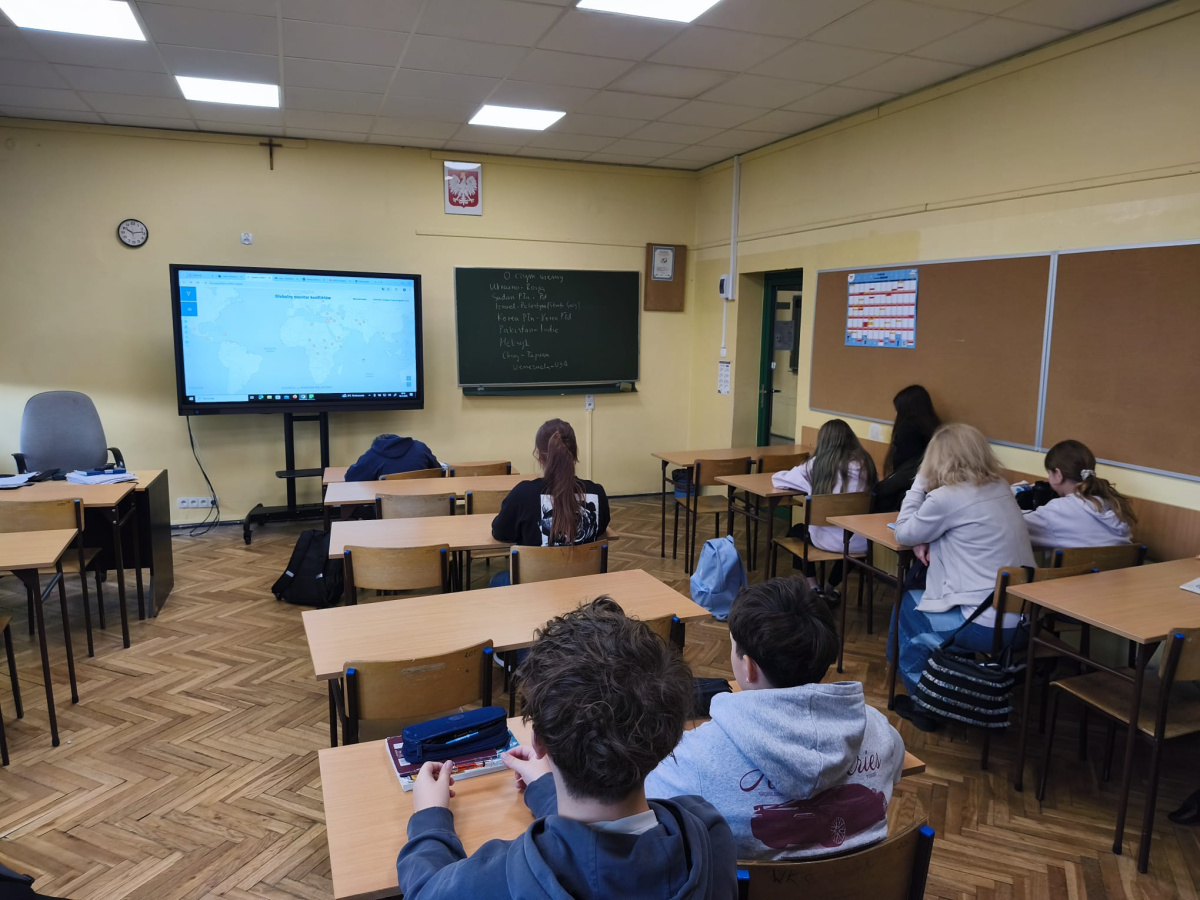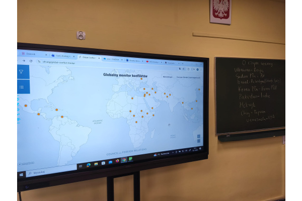 Takie tematy poruszali uczniowie klasy 7b na lekcji historii. Rozmawiali o konfliktach na świecie, ich przyczynach, skutkach i stronach biorących w nich udział studiując specjalną, interaktywną mapę. Ze wszystkich 28 konfliktów wiedzieli o 9 z nich. Podzielili się również źródłami, z jakich najczęściej czerpią informacje polityczne: z telewizji, internetu i lekcji historii. Na koniec zastanawiali się, co należałoby zrobić, aby świat był bardziej pokojowym i przyjaznym miejscem oraz podzielili się wnioskami, jakie nasunęły im się w trakcie zajęć.