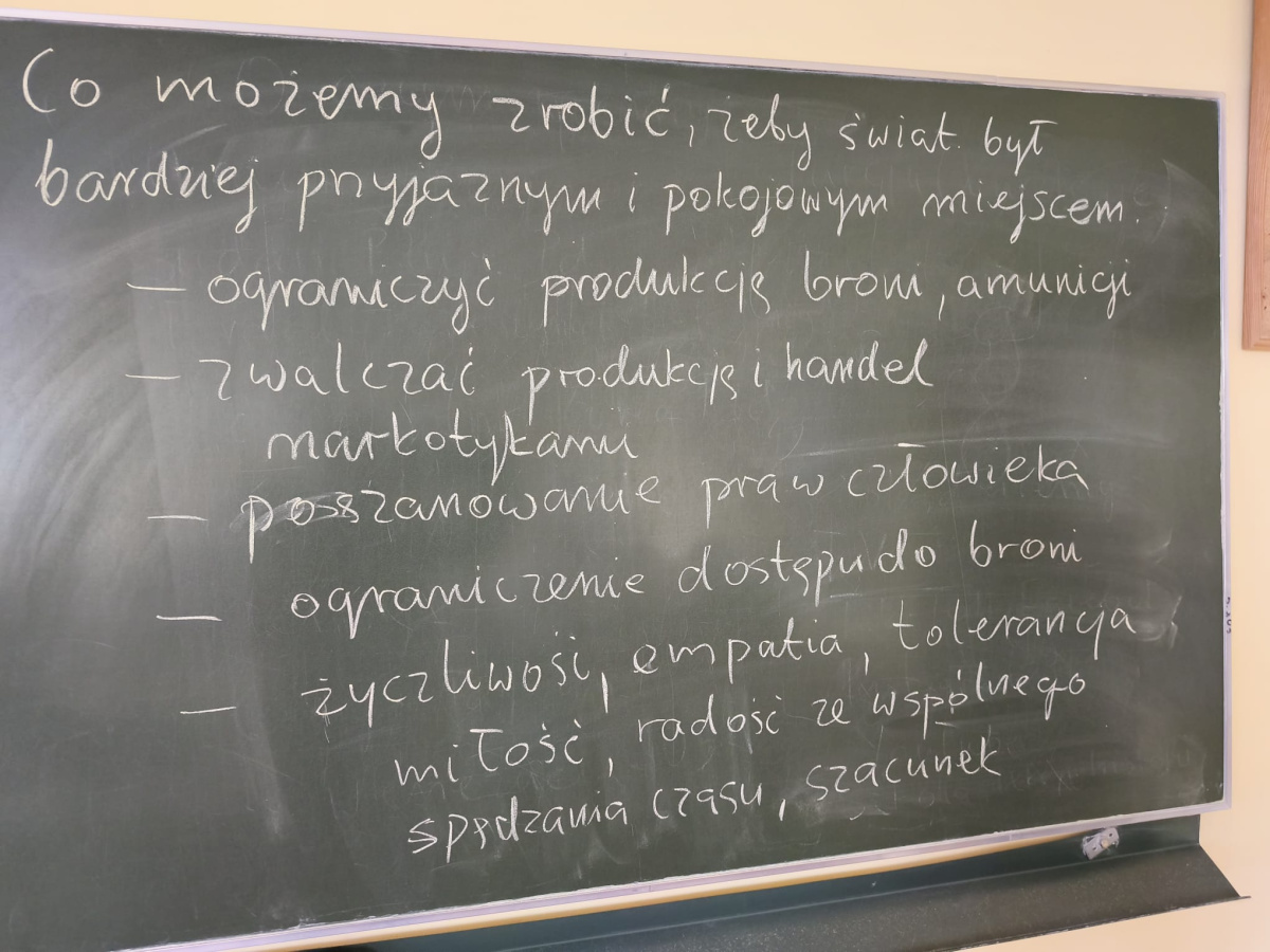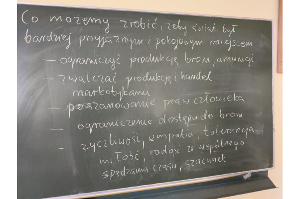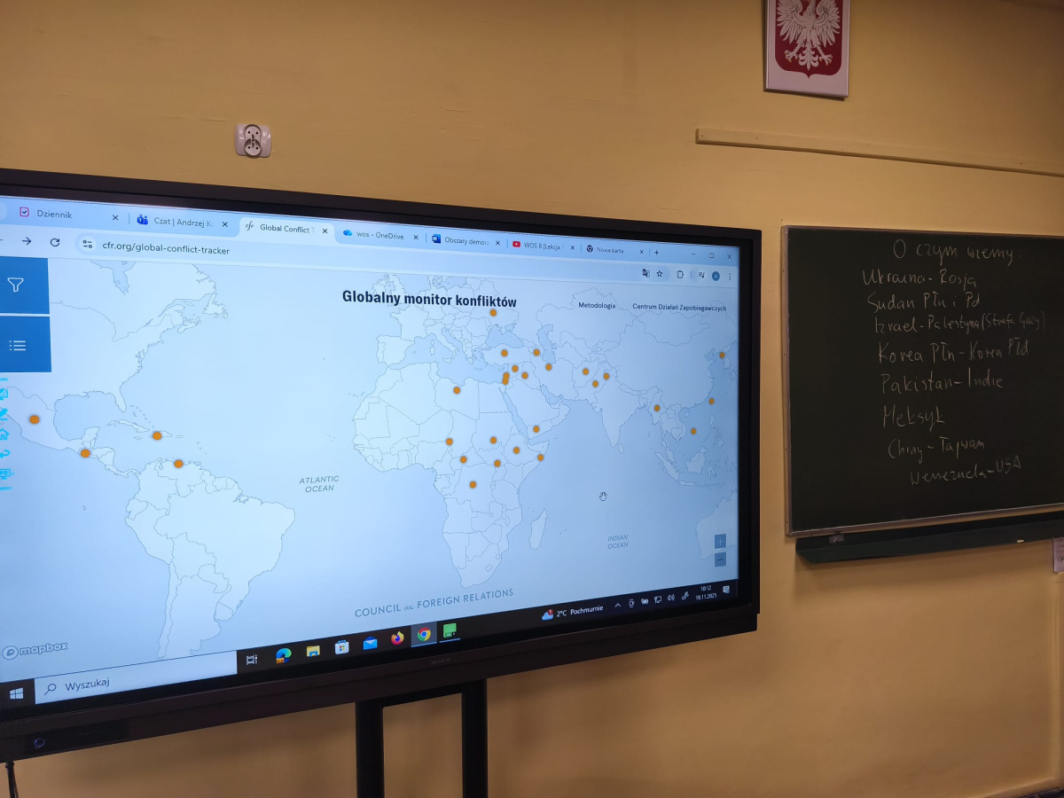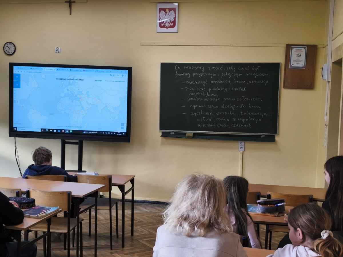 Takie tematy poruszali uczniowie klasy 7b na lekcji historii. Rozmawiali o konfliktach na świecie, ich przyczynach, skutkach i stronach biorących w nich udział studiując specjalną, interaktywną mapę. Ze wszystkich 28 konfliktów wiedzieli o 9 z nich. Podzielili się również źródłami, z jakich najczęściej czerpią informacje polityczne: z telewizji, internetu i lekcji historii. Na koniec zastanawiali się, co należałoby zrobić, aby świat był bardziej pokojowym i przyjaznym miejscem oraz podzielili się wnioskami, jakie nasunęły im się w trakcie zajęć.