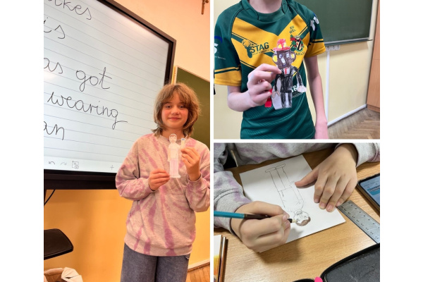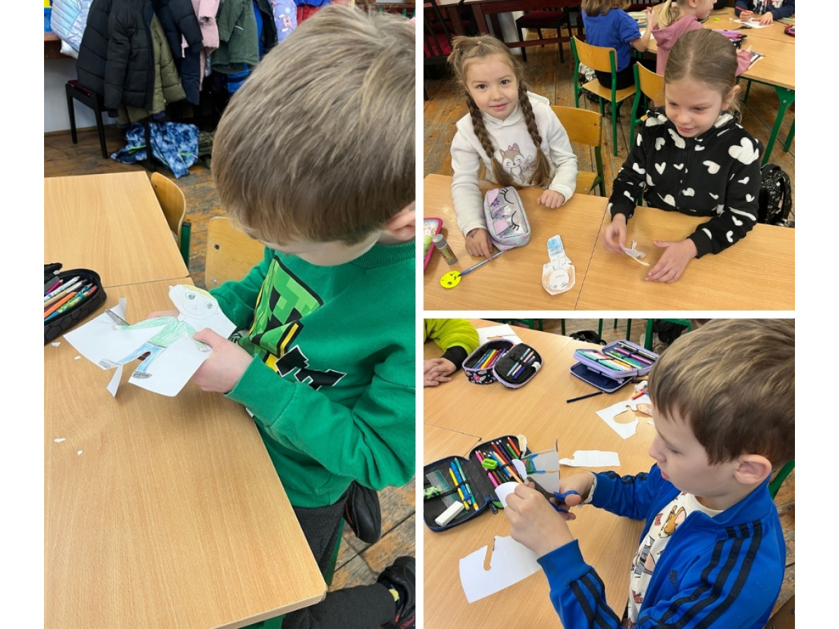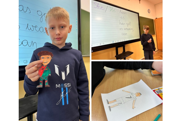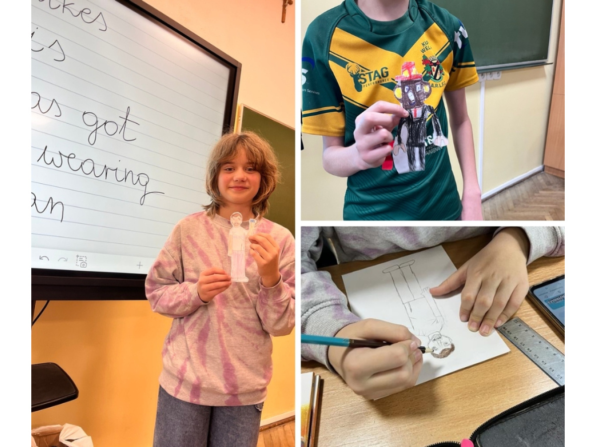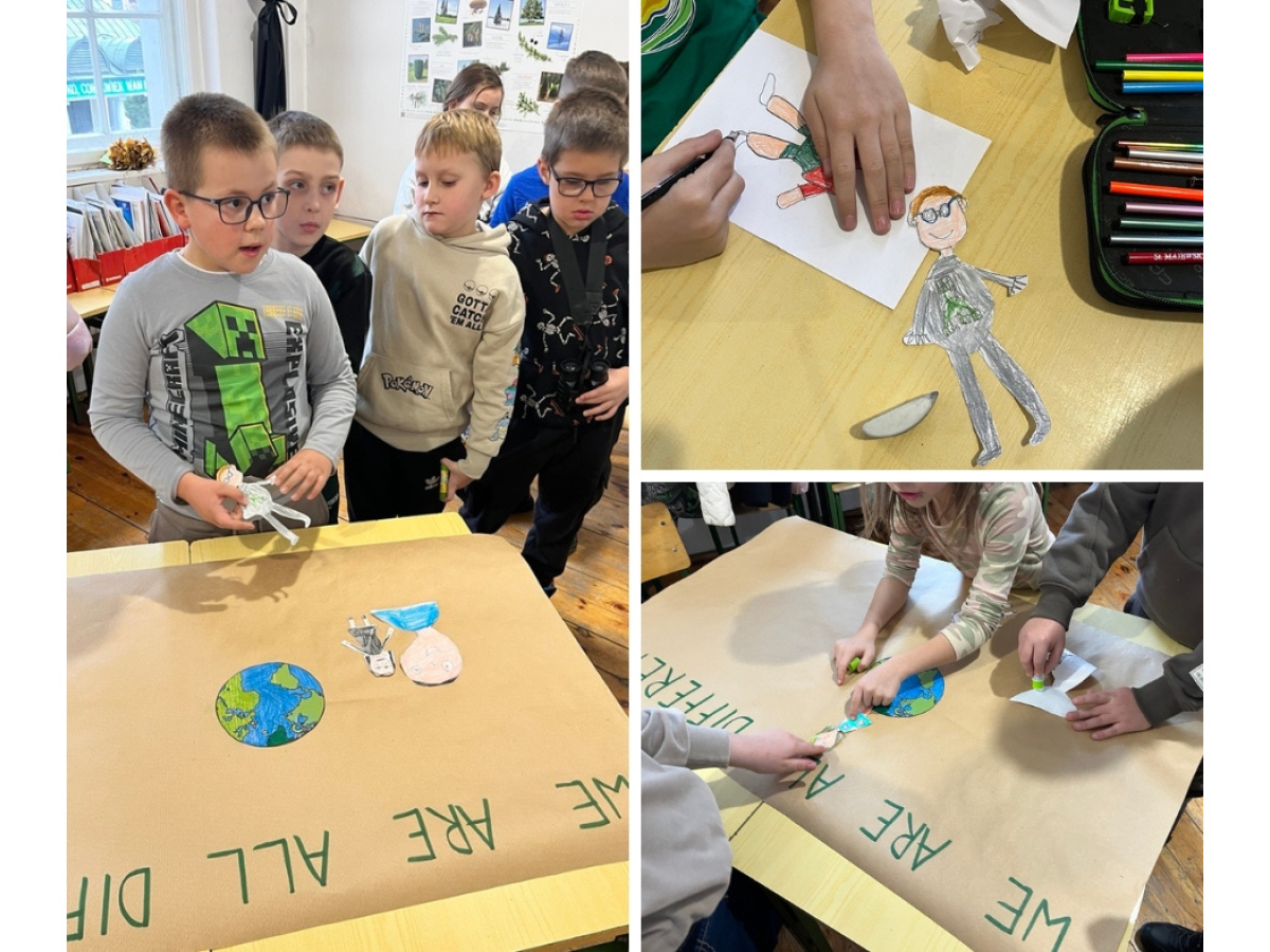 Następnie dzieci tworzyły własne postacie – każda z nich była oryginalna i odzwierciedlała kreatywność autorów. Na koniec wszystkie rysunki zostały umieszczone na dużym arkuszu papieru wokół globu, symbolizując różnorodność ludzi na świecie i naszą wspólną odpowiedzialność za planetę. Uczniowie opisywali swoje postacie w języku angielskim. Młodsi skupiali się na ich aspekcie fizycznym: kolorze, długości i strukturze włosów, budowie ciała, cechach szczególnych: "It's a girl. She's young and tall. She's got curly, dark hair and blue eyes. She's got glasses. She's happy." Starsi uczniowie nadawali swoim postaciom imiona, określali ich umiejętności, mocne i słabe strony, charakter i upodobania oraz opisywali ubiór: "It's Jimmy. He's a football player. He's very sporty and fast. He's got strong legs. Jimmy likes chicken and rice. He can speak Spanish. He's wearing a green T-shirt."