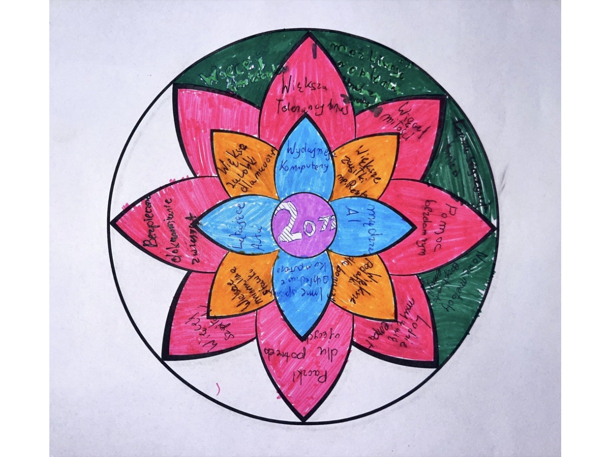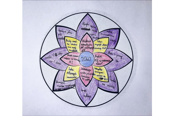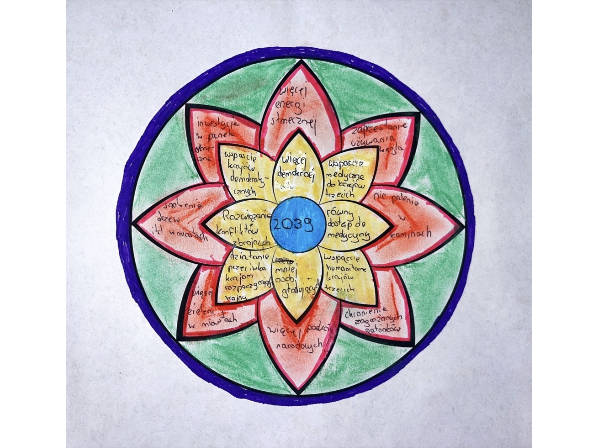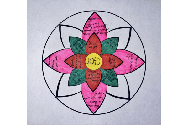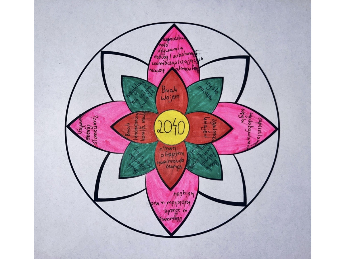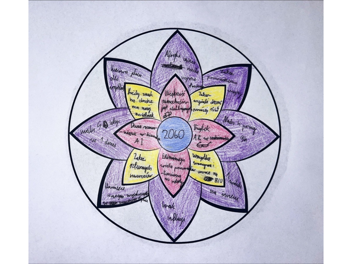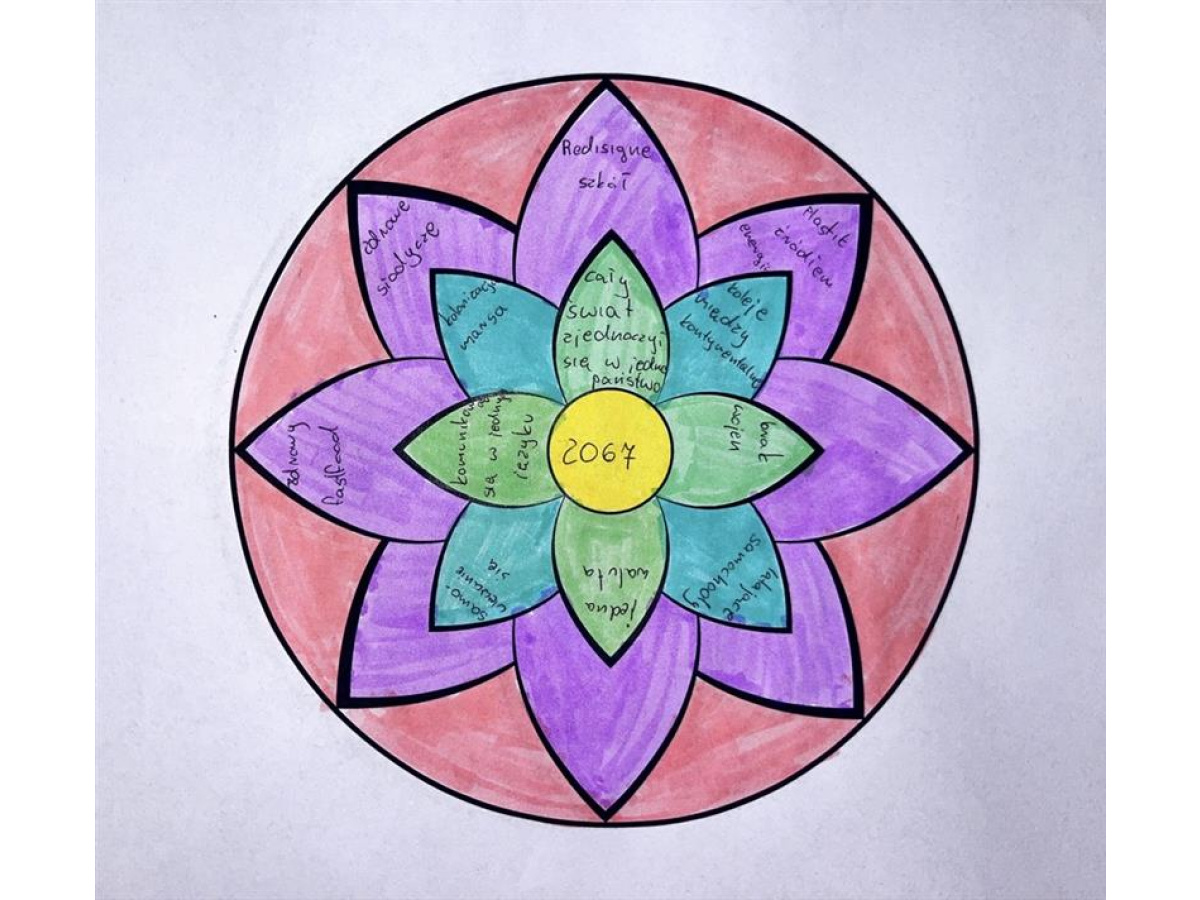 Na lekcji wychowawczej klasa 8a kontynuowała temat, zastanawiając się nad przyszłością, która budzi nadzieje na lepszy świat. Uczniowie wczuli się w rolę ekspertów i ekspertek do spraw wizji pozytywnej przyszłości. Określili kluczowe działania, które ich zdaniem byłyby realizowane w świecie, który skutecznie odpowiada na globalne wyzwania i potrzeby jego mieszkańców. Swoje pomysły umieścili na schemacie nawiązującym do mandali – harmonijnego symbolu świata. Mogli zaproponować działania o zasięgu lokalnym (takie, których potrzebuje np. ich miejscowość) i globalnym (takie, których potrzebuje cały świat). Na środkowym polu wpisali rok, którego dotyczy ich wizja przyszłości.