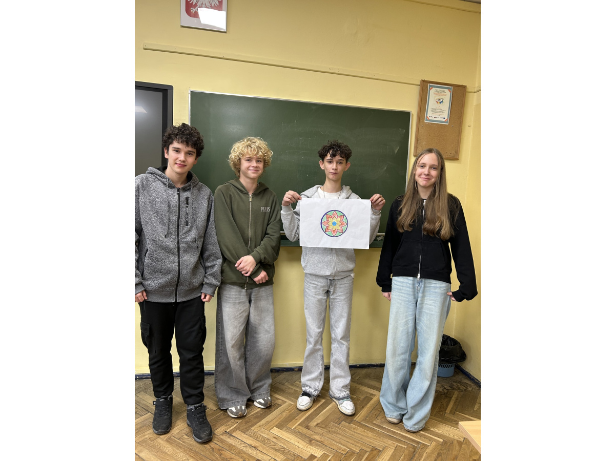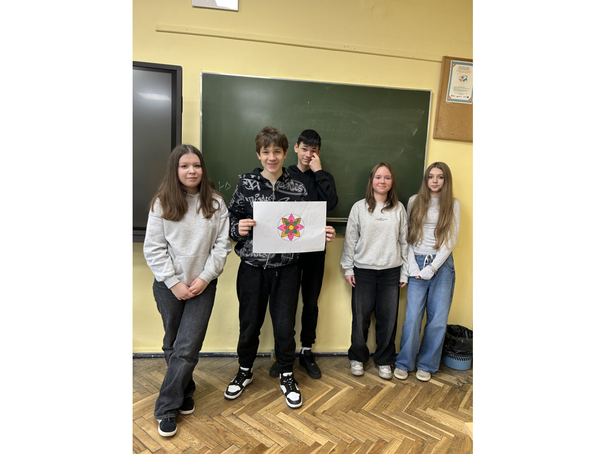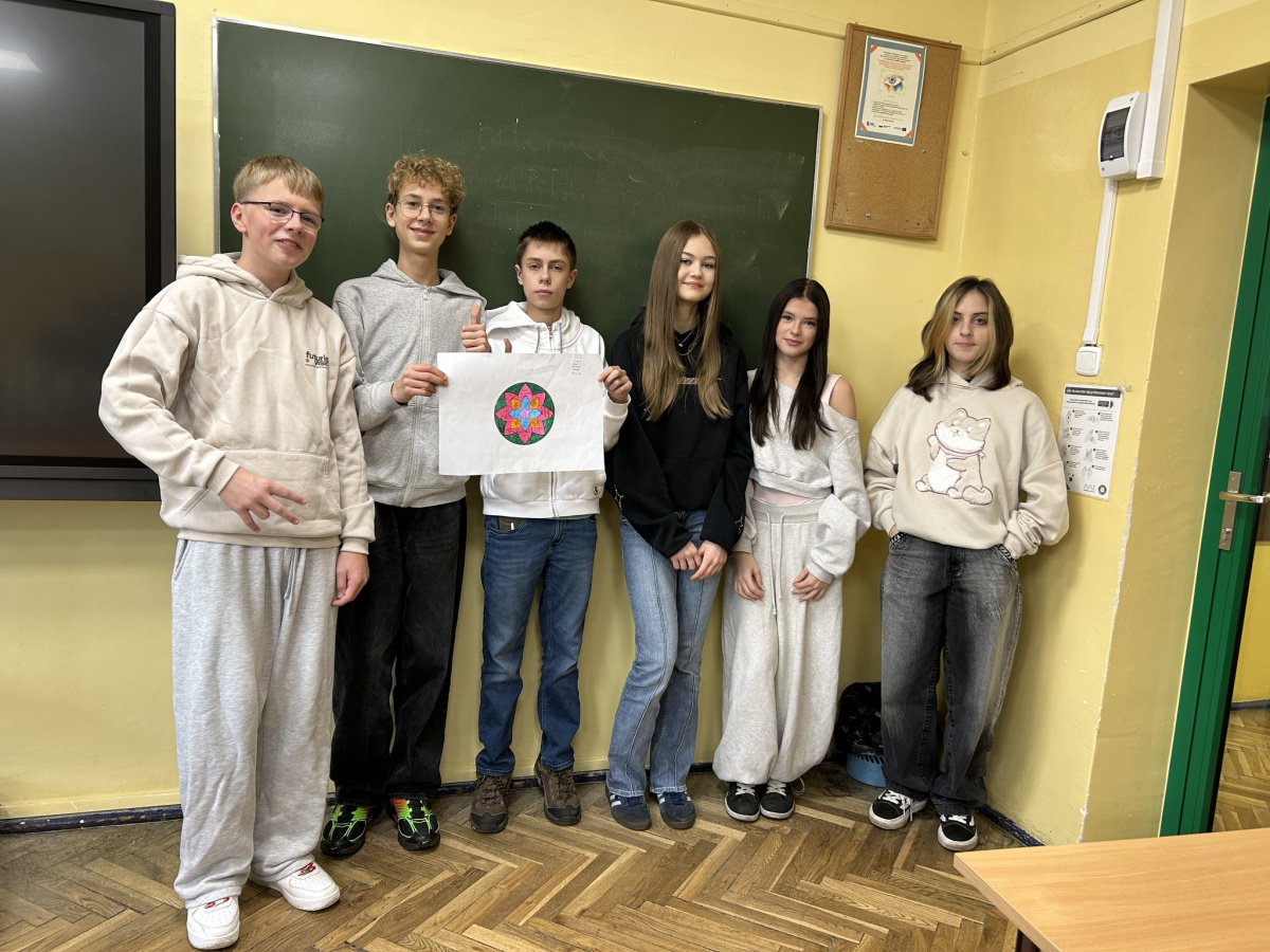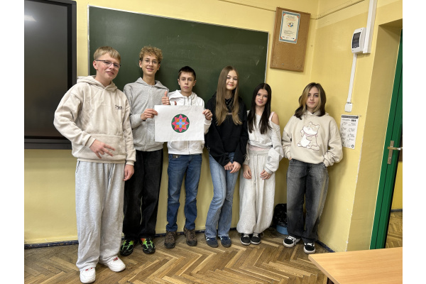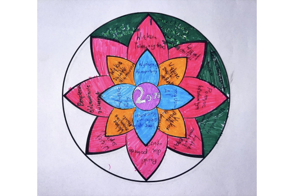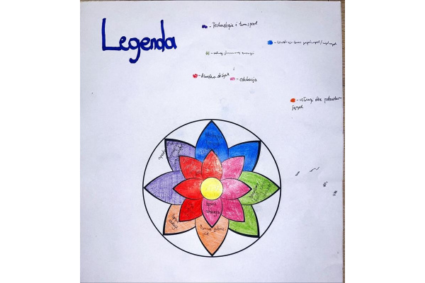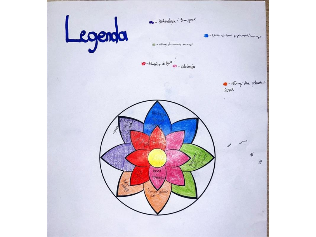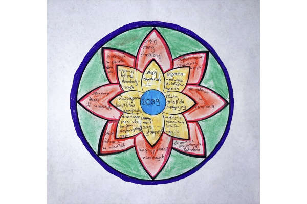 Na lekcji wychowawczej klasa 8a kontynuowała temat, zastanawiając się nad przyszłością, która budzi nadzieje na lepszy świat. Uczniowie wczuli się w rolę ekspertów i ekspertek do spraw wizji pozytywnej przyszłości. Określili kluczowe działania, które ich zdaniem byłyby realizowane w świecie, który skutecznie odpowiada na globalne wyzwania i potrzeby jego mieszkańców. Swoje pomysły umieścili na schemacie nawiązującym do mandali – harmonijnego symbolu świata. Mogli zaproponować działania o zasięgu lokalnym (takie, których potrzebuje np. ich miejscowość) i globalnym (takie, których potrzebuje cały świat). Na środkowym polu wpisali rok, którego dotyczy ich wizja przyszłości.