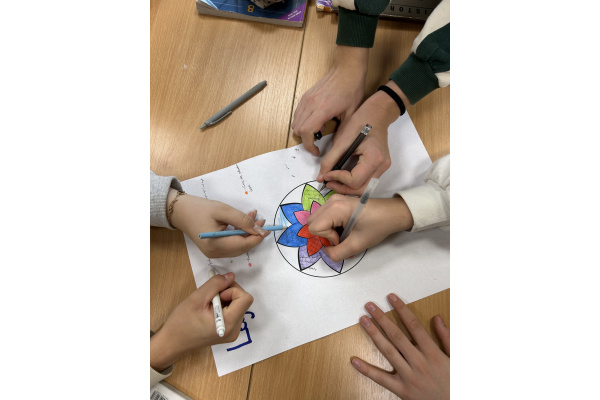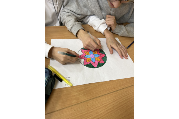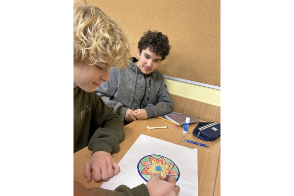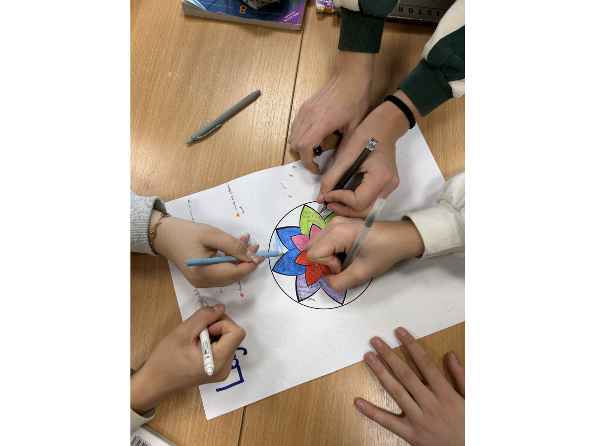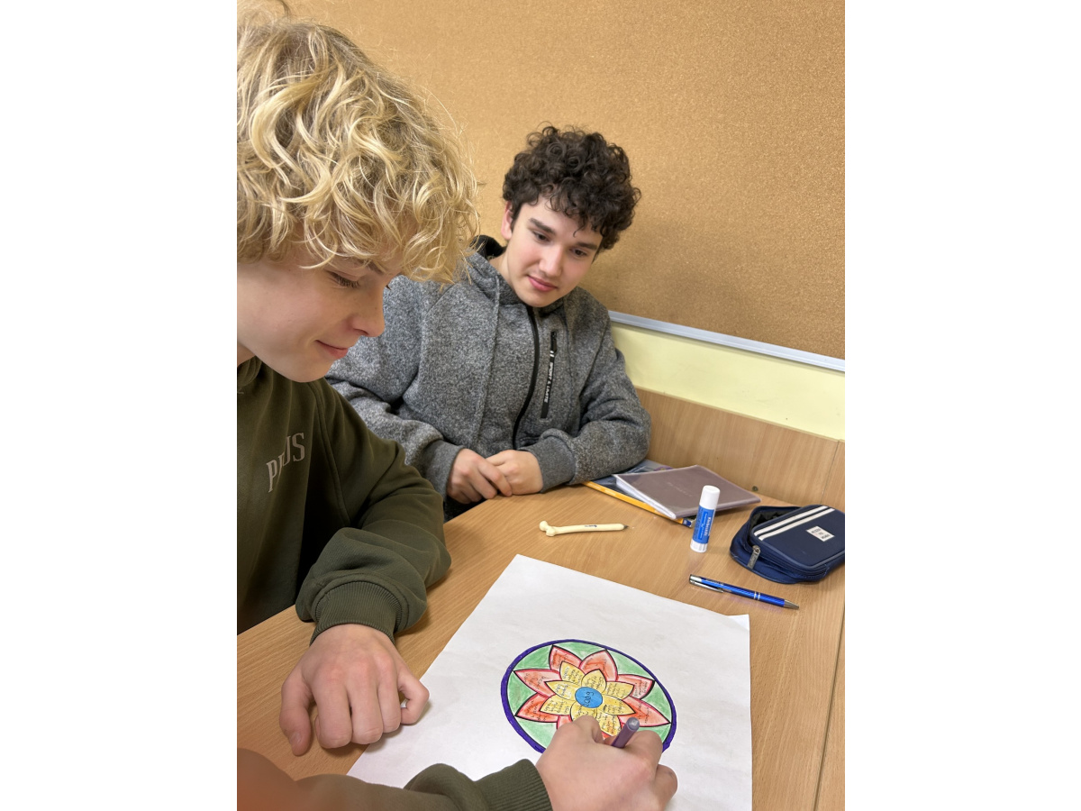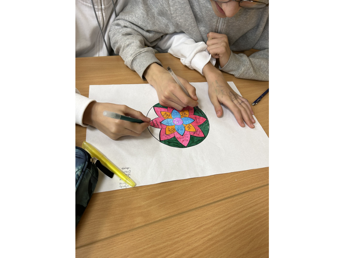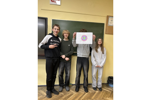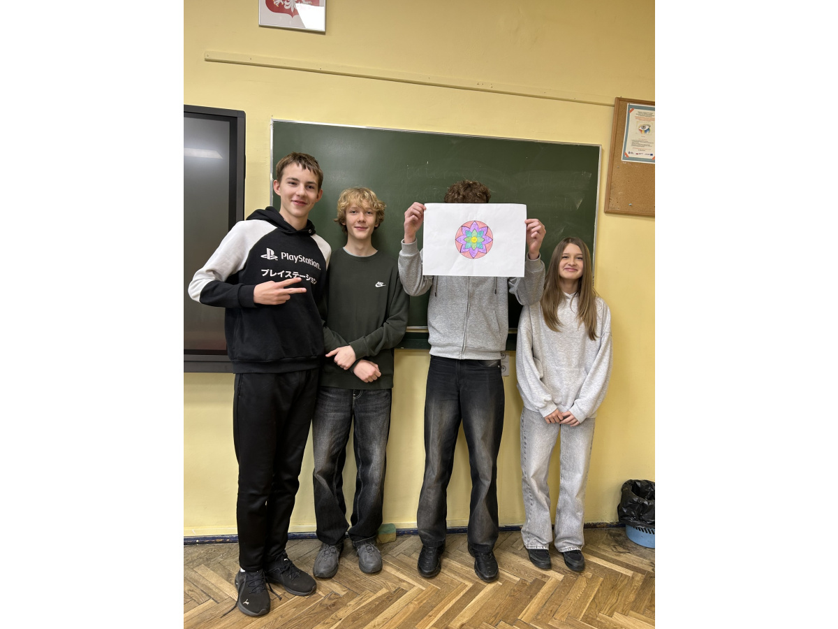 Na lekcji wychowawczej klasa 8a kontynuowała temat, zastanawiając się nad przyszłością, która budzi nadzieje na lepszy świat. Uczniowie wczuli się w rolę ekspertów i ekspertek do spraw wizji pozytywnej przyszłości. Określili kluczowe działania, które ich zdaniem byłyby realizowane w świecie, który skutecznie odpowiada na globalne wyzwania i potrzeby jego mieszkańców. Swoje pomysły umieścili na schemacie nawiązującym do mandali – harmonijnego symbolu świata. Mogli zaproponować działania o zasięgu lokalnym (takie, których potrzebuje np. ich miejscowość) i globalnym (takie, których potrzebuje cały świat). Na środkowym polu wpisali rok, którego dotyczy ich wizja przyszłości.