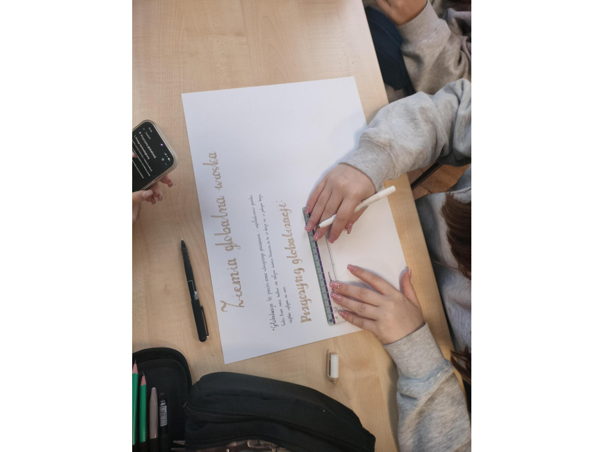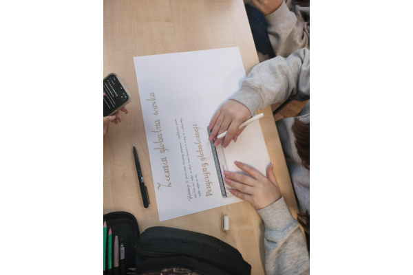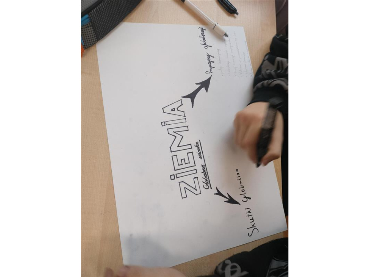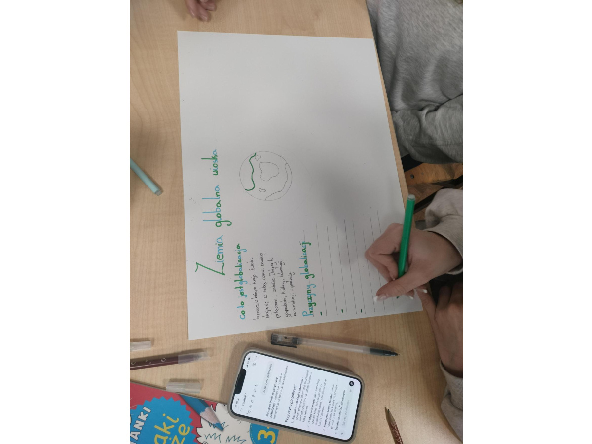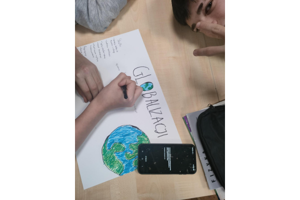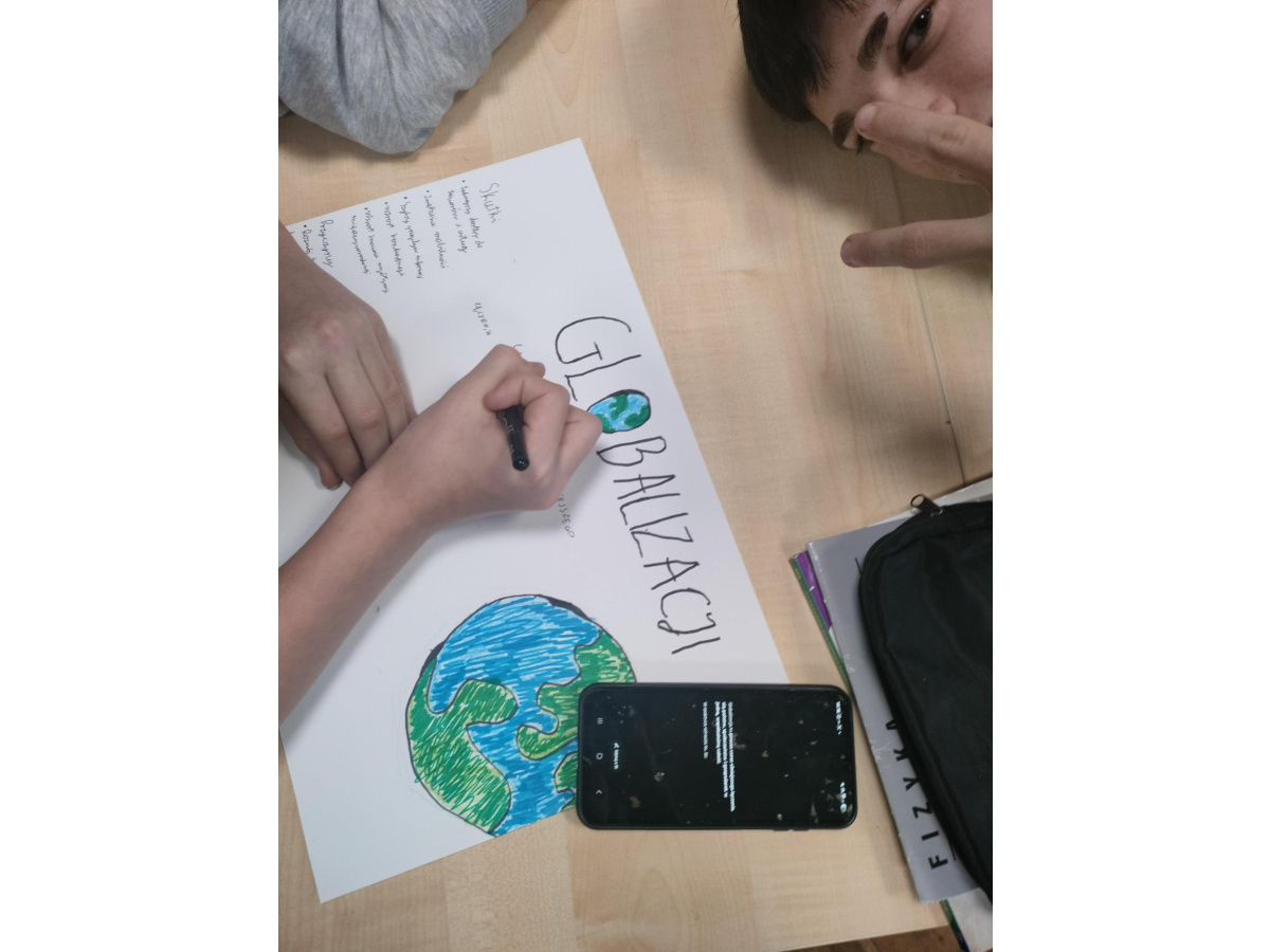 Na lekcji geografii klasy 8 zajmowały się tematem "Ziemia globalna wioska". Podczas zajęć uczniowie dowiedzieli się czym jest globalizacja, poznali jej przyczyny i skutki oraz dowiedzieli się, jakie konsekwencje niesie za sobą globalizacja w kontekście całego świata. Następnie przy współpracy zespołowej uczniowie wykonali plakaty podsumowujące zdobytą wiedzę.