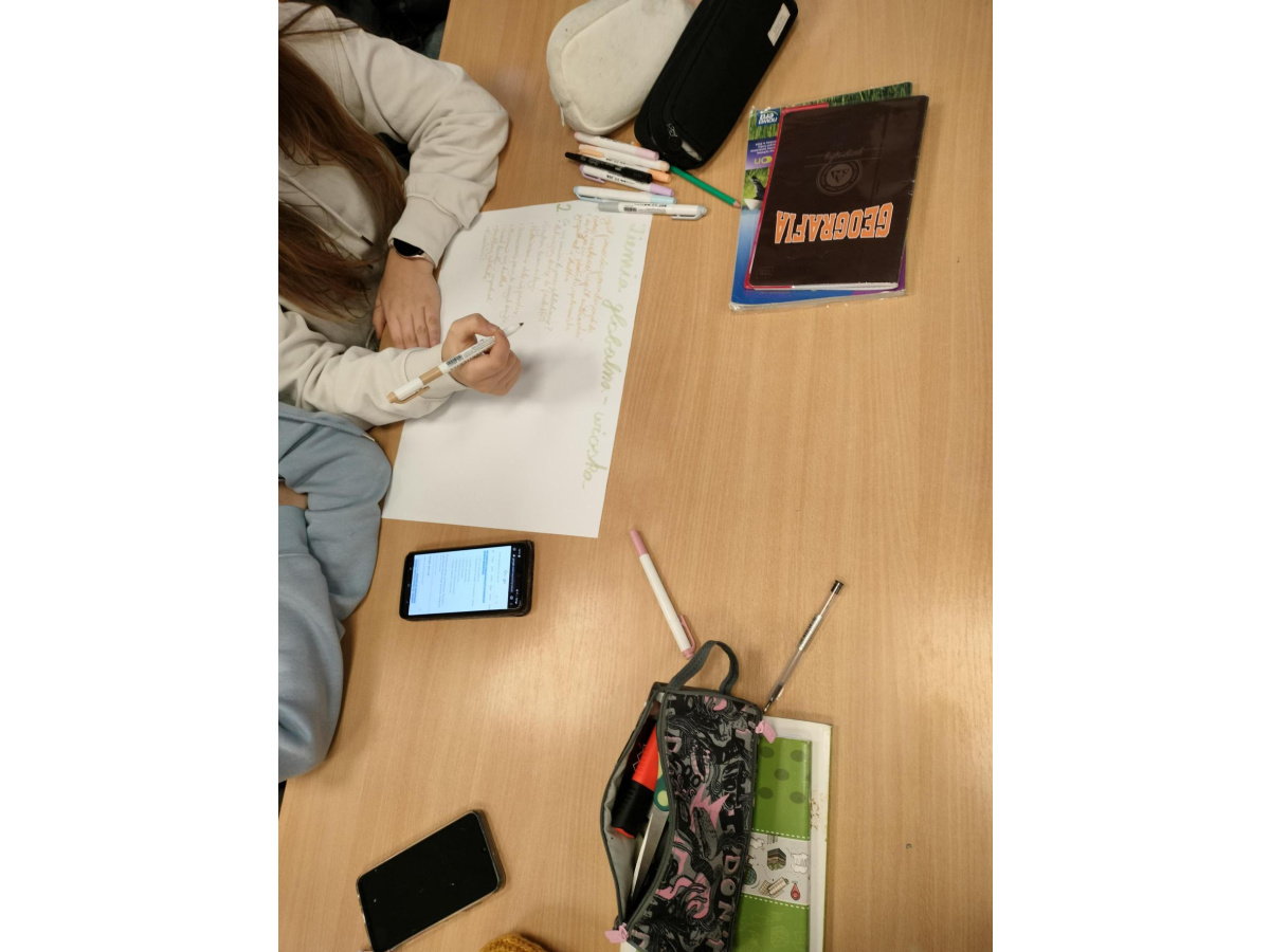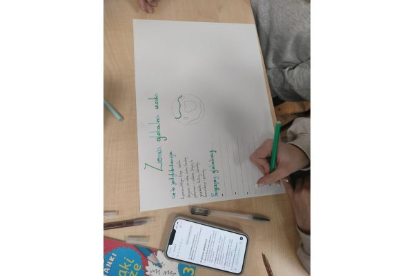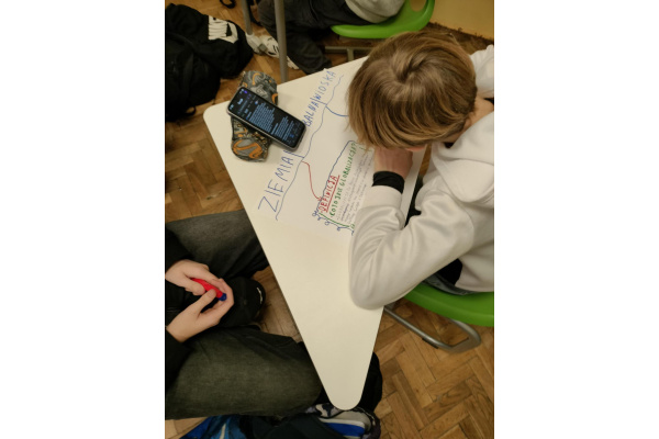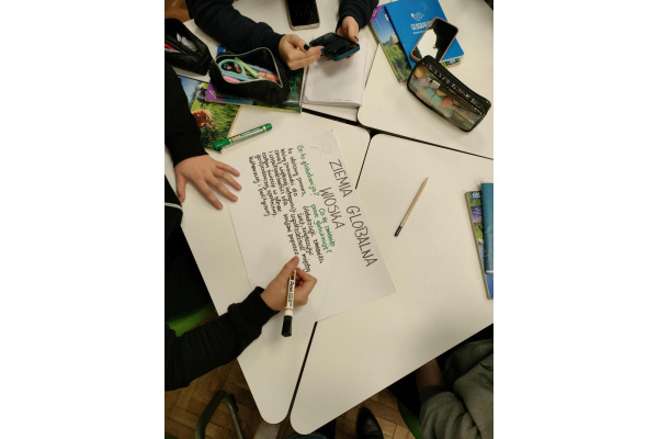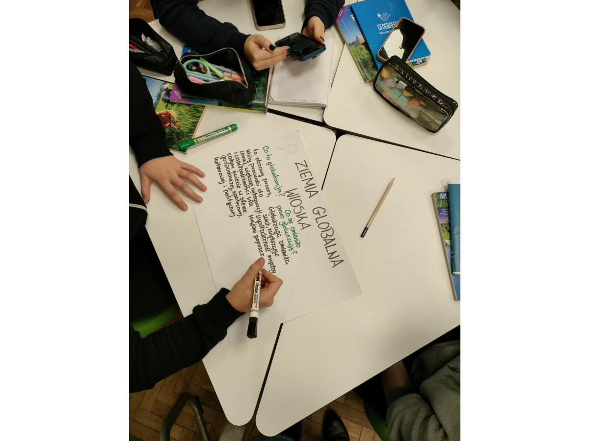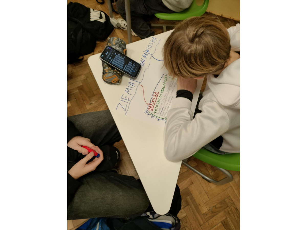 Na lekcji geografii klasy 8 zajmowały się tematem "Ziemia globalna wioska". Podczas zajęć uczniowie dowiedzieli się czym jest globalizacja, poznali jej przyczyny i skutki oraz dowiedzieli się, jakie konsekwencje niesie za sobą globalizacja w kontekście całego świata. Następnie przy współpracy zespołowej uczniowie wykonali plakaty podsumowujące zdobytą wiedzę.