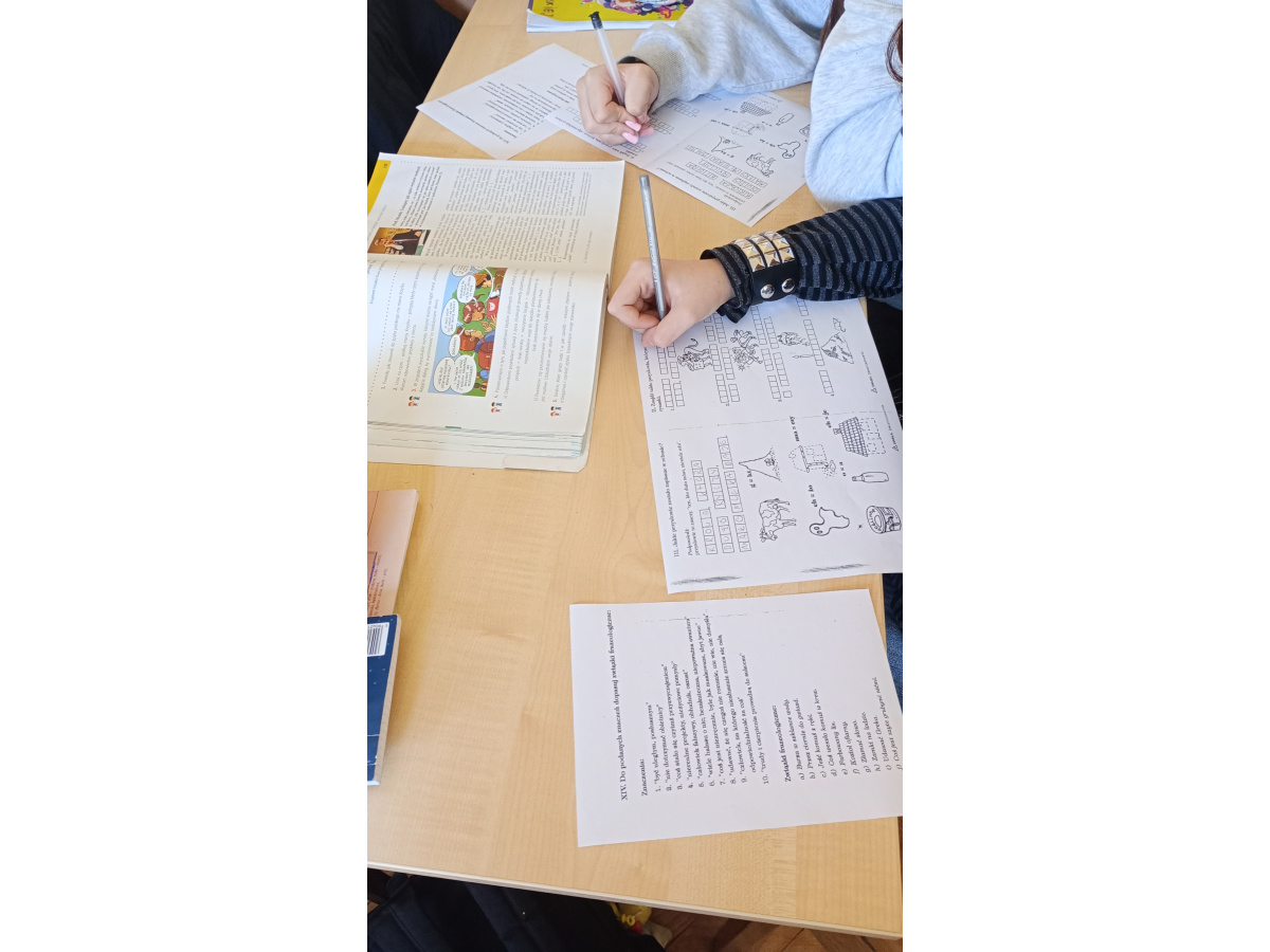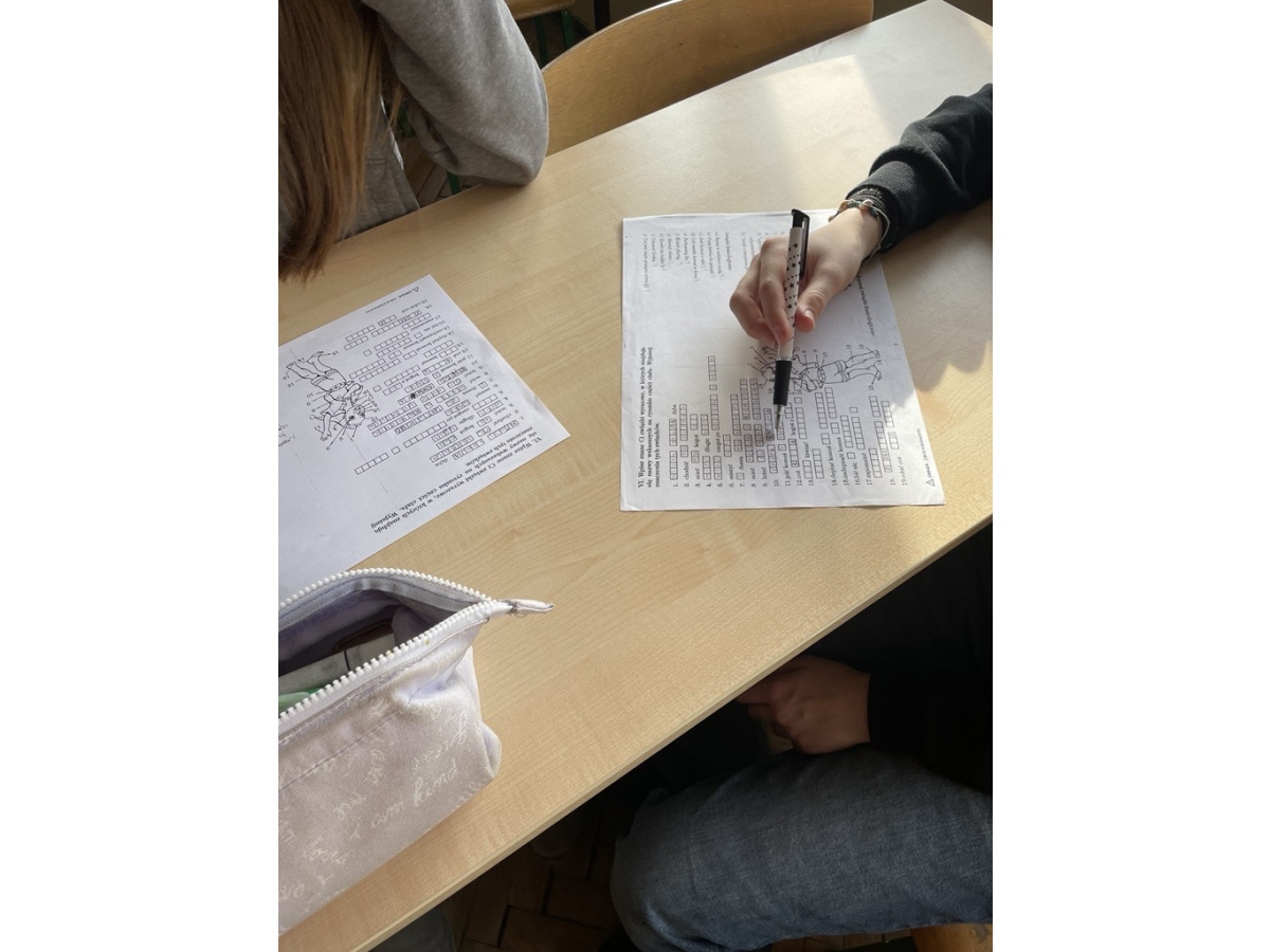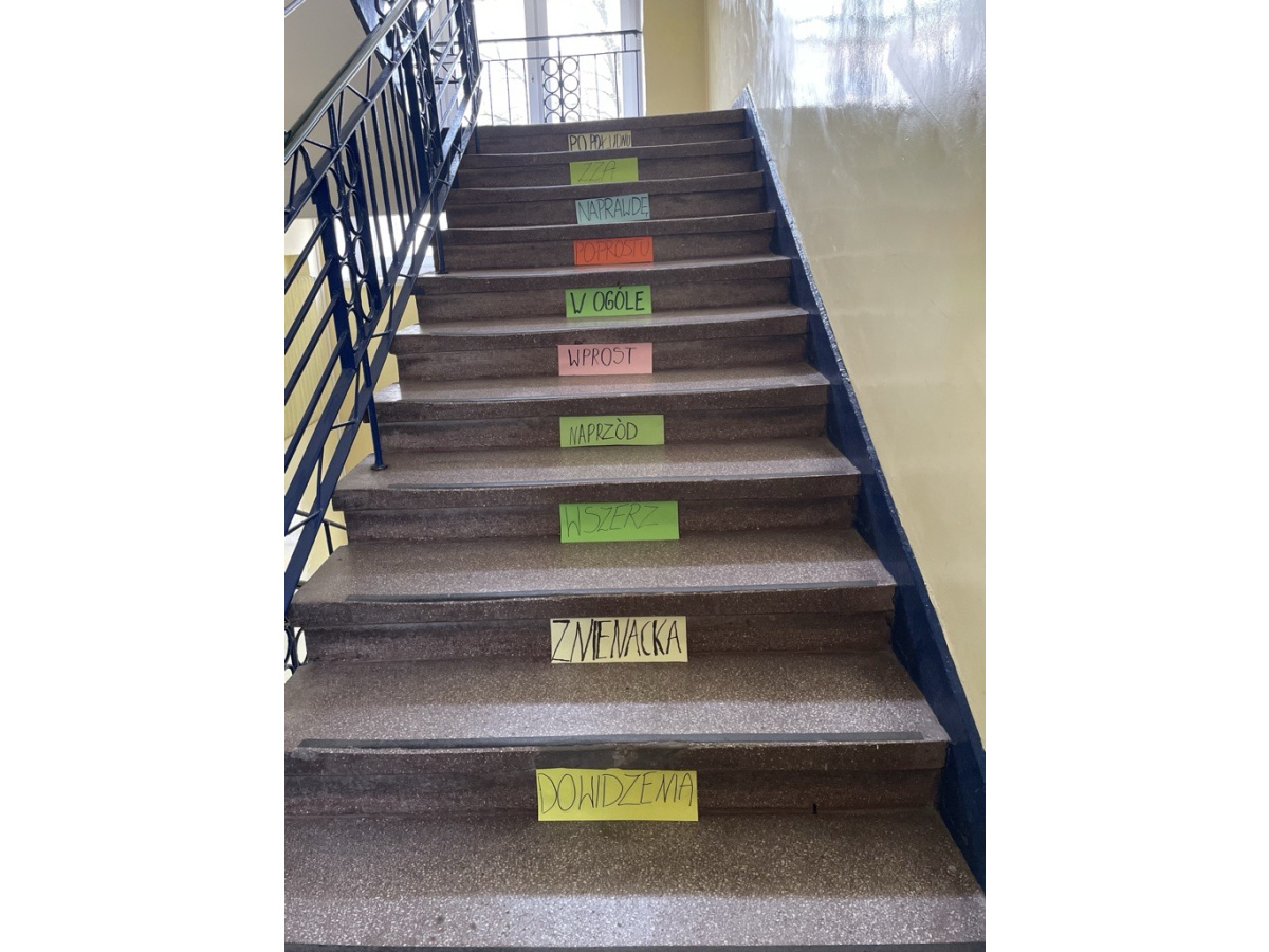 Obchody rozpoczęliśmy od zorganizowania kącików językowych w salach lekcyjnych. Uczniowie 6 b sami przygotowali dekoracje i napisy z trudnościami ortograficznymi, które następnie umieściliśmy korkowych tablicach oraz na schodach pomiędzy pierwszym i drugim piętrem. Uczniowie, oprócz przypomnienia sobie ortografii, mieli też możliwość zapoznania się z łamańcami językowymi i pomęczyć się z wymową Czy się Czesi cieszą, że się Czesio czesze lub Czy trzy cytrzystki grają na cytrze, czy jedna płacze, a druga łzy trze? oraz dowiedzieć się, dlaczego mówi się wziąć i z rzędu. Na lekcjach języka polskiego rozwiązywana była krzyżówka, w której hasłami były same archaizmy. Uczniowie poznali więc znaczenie takich zapomnianych słów jak bałamucić, ambaras czy kajet, co okazało się niespodziewanie dobrą zabawą. Tradycyjnie już konkurowaliśmy w klasach w znajomości związków frazeologicznych. Nie zabrakło rebusów językowych, łączenia znaczeń z przysłowiami pracy z pracy z ilustracjami. Chyba już wszyscy zapamiętają, że darowanemu koniowi w zęby się nie zagląda, a pustego to i Salomon nie naleje. W starszych klasach ciekawym doświadczeniem okazało się tworzenie eufemizmów oraz zabawa z wyrazami wieloznacznymi i jednobrzmiącymi. I już wiemy, dlaczego raz marzę, a raz mażę i ile znaczeń ma zwykły korek.