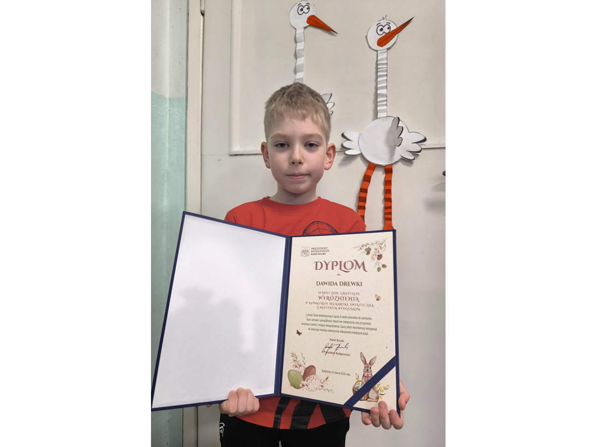 Dawid Drewka, uczeń klasy 1a, zdobył wyróżnienie w konkursie na świąteczną kartkę z motywem Bydgoszczy. Spośród ponad 350 prac nadesłanych z 38 bydgoskich szkół, jego praca została doceniona przez komisję konkursową i znalazła się w gronie 10 wyróżnionych.