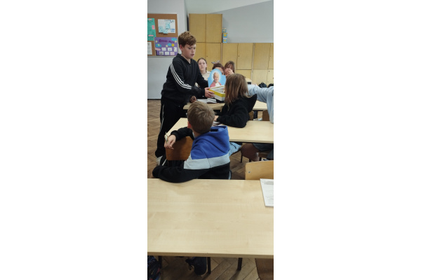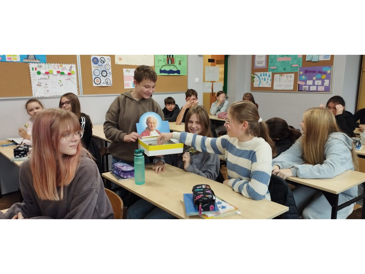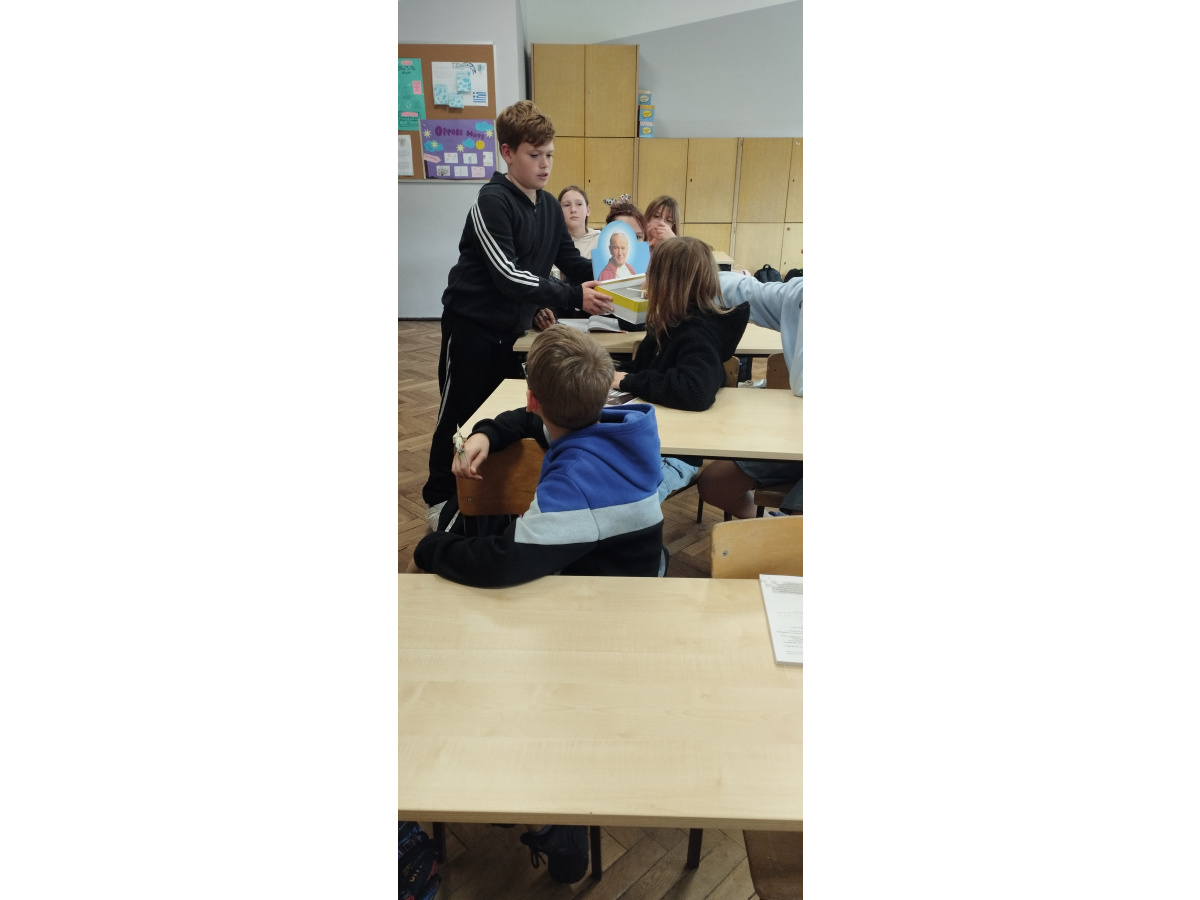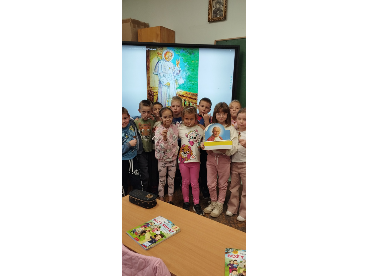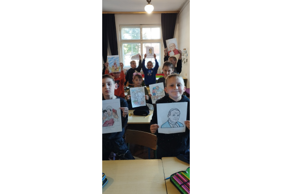 Również uczniowie starszych klas aktywnie uczestniczyli w obchodach – rozwiązywali rebusy i quizy, a także poznawali historię życia św. Jana Pawła II poprzez film edukacyjny, który pomógł im lepiej zrozumieć jego przesłanie i wartości, które głosił.