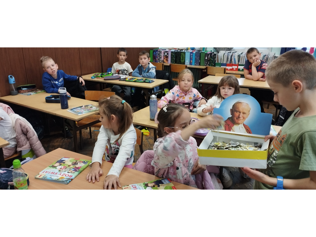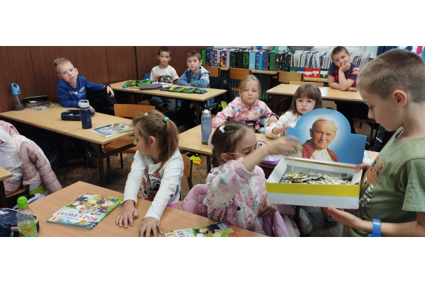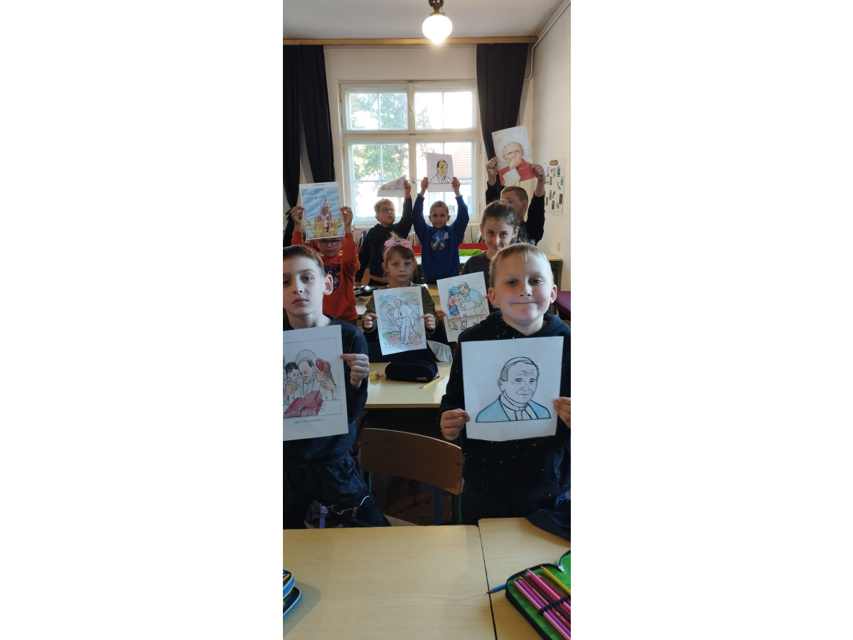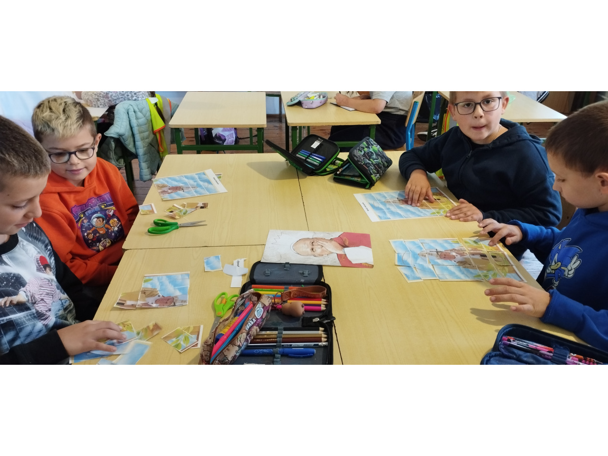 Starsi uczniowie przygotowali dla młodszych różnorodne zadania i zabawy – puzzle, rebusy oraz quizy dotyczące życia i nauczania Papieża Polaka. Młodsi z wielkim zaangażowaniem rozwiązywali przygotowane przez starszych uczniów zadania, układali puzzle i oglądali krótkie filmy o Janie Pawle II.